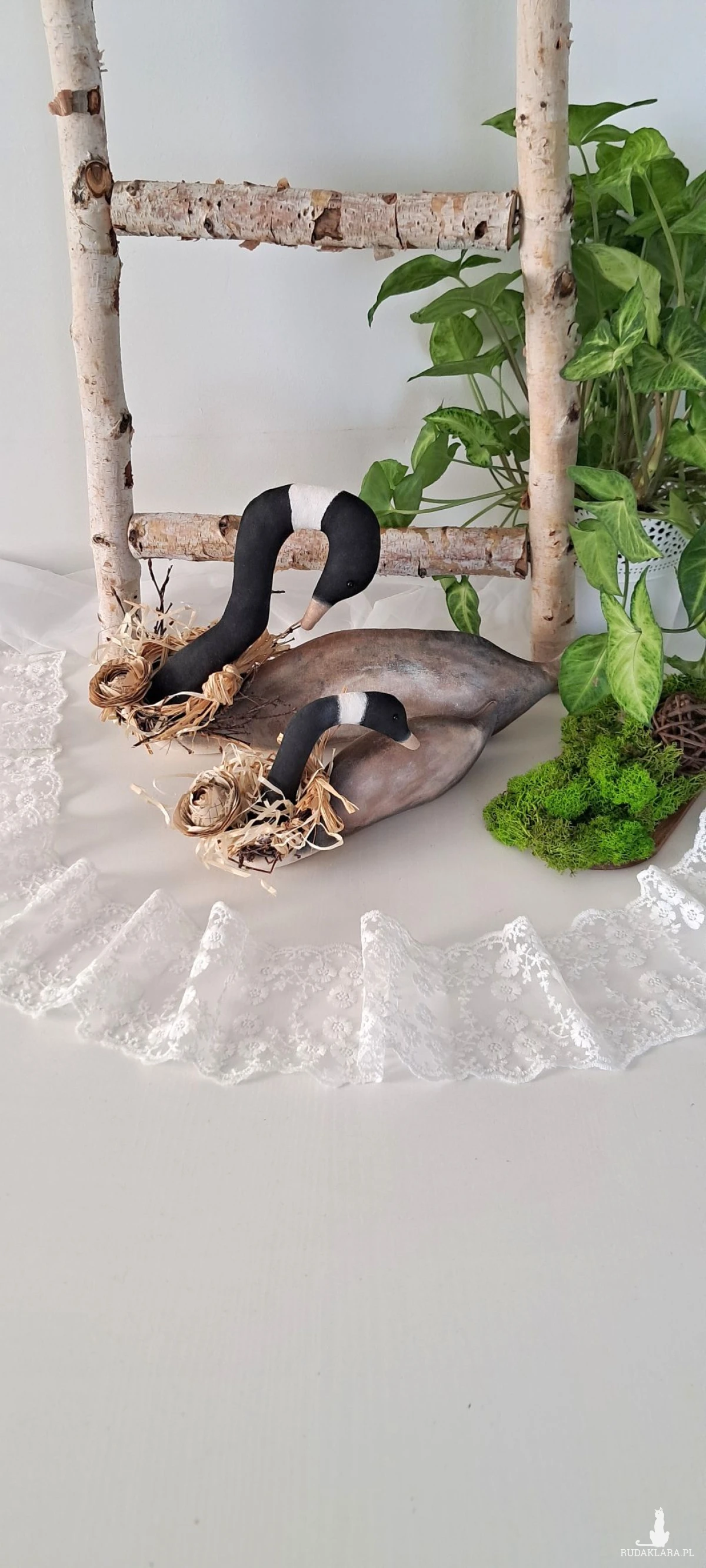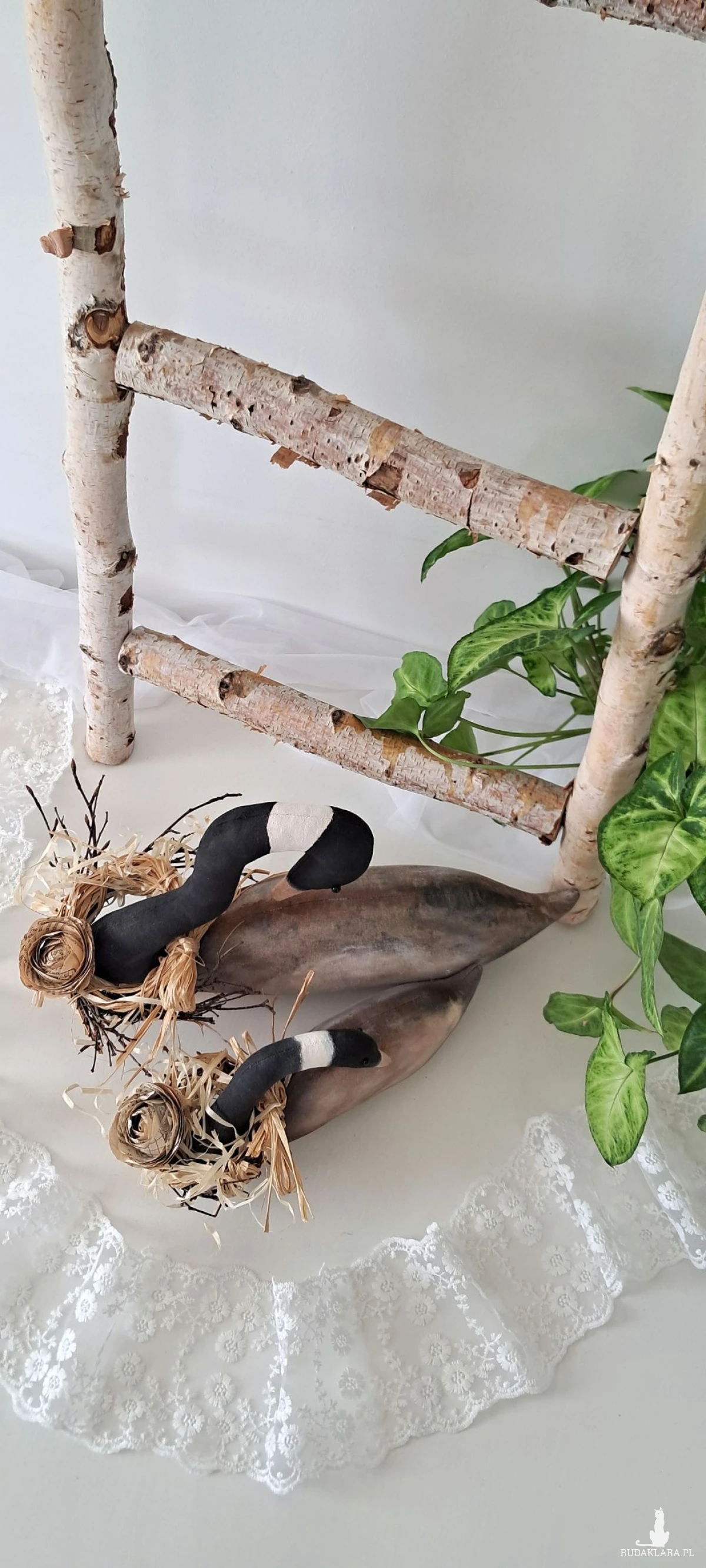Mam do sprzedania własnoręcznie wykonane dekoracje w postaci dzikich gęsi. Gęsi uszyte z surówki bawełnianej,wypełnionej antyalergiczną kulką silikonową. Pomalowane farbami akrylowymi w kolorach brąz,beż, biel i czerń. Na szyi dodatkowo udekorowane wianuszkami z witek brzozowych i rafii,z której też wykonałam kokardkę oraz dodatkowo przyozdobione różyczkami zrobionymi z papieru. Większa gąska wymiary: 35 cm x21 cm; mniejsza: 24 cm x12 cm. Stoją z lekkim podparciem.