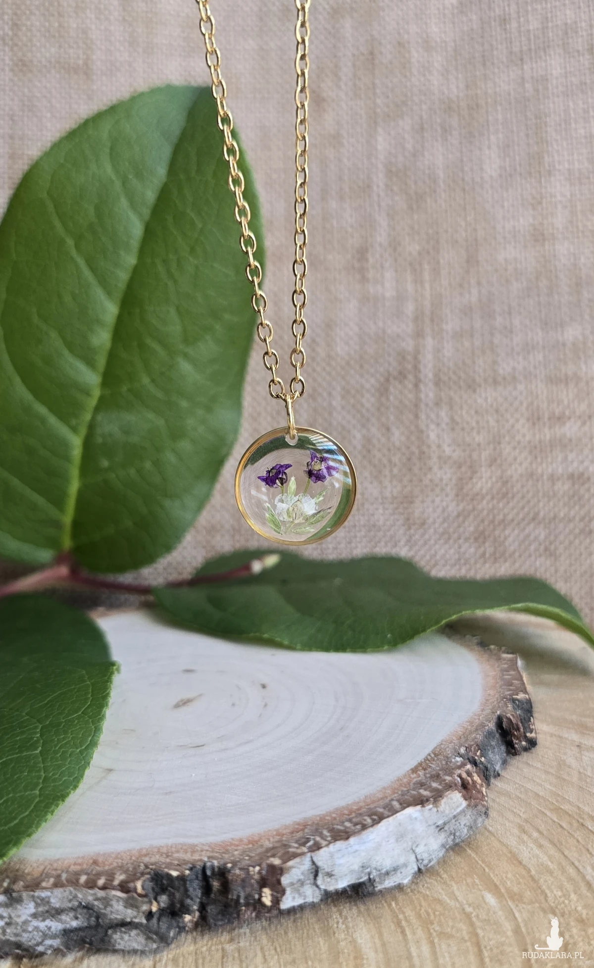 Oferuję Państwu unikalną biżuterię. Zawieszka jest wykonana z suszonych kwiatów i żywicy epoksydowej. Biżuteria jest wspaniałym i oryginalnym prezentem na lata.