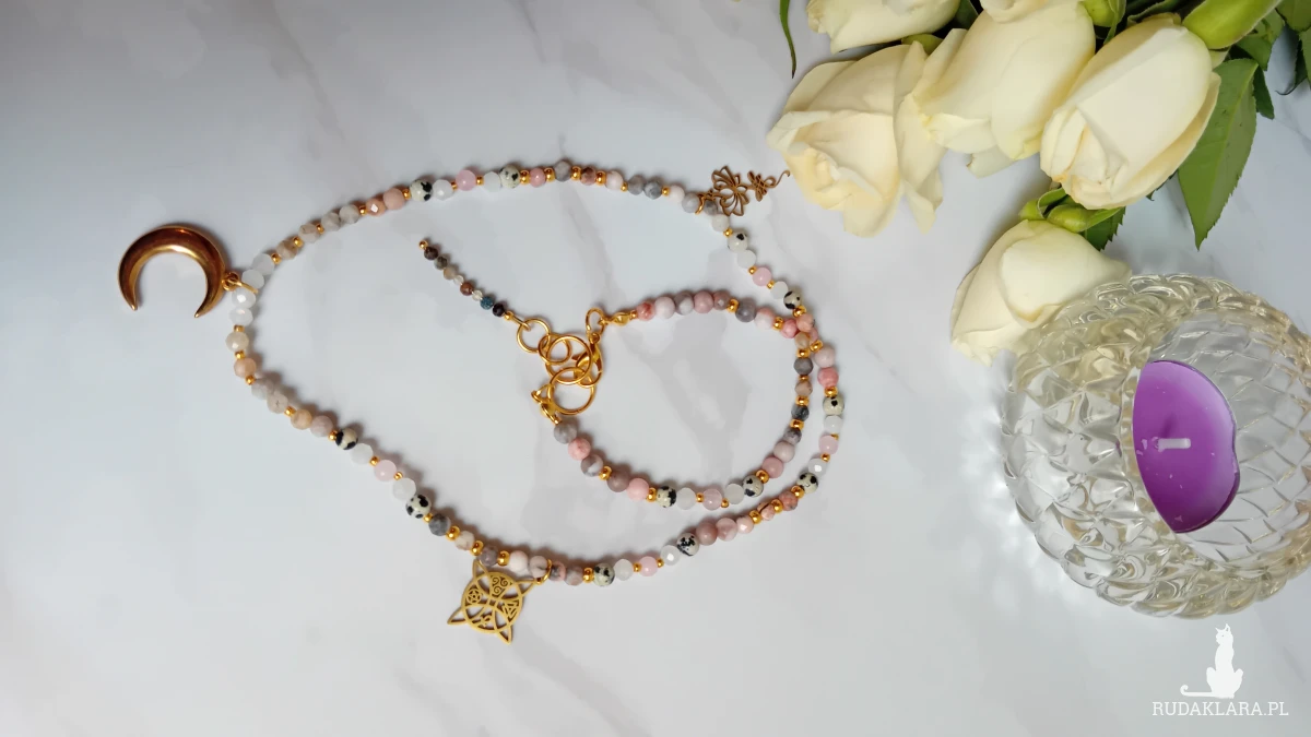 Naszyjnik wykonany z naturalnych kamieni opalu, jaspisu dalmatyńskiego, kryształu górskiego i kwarcu różowego.