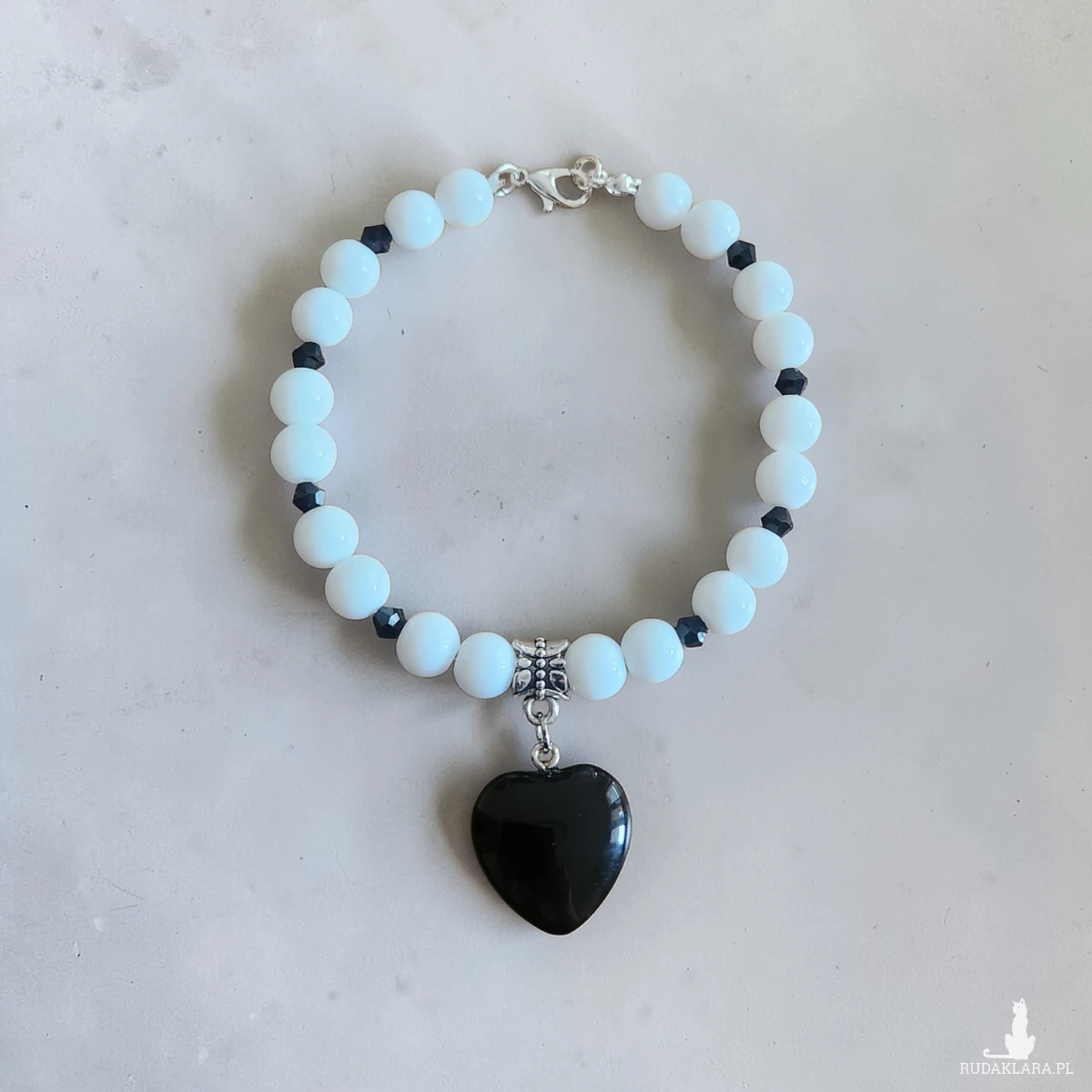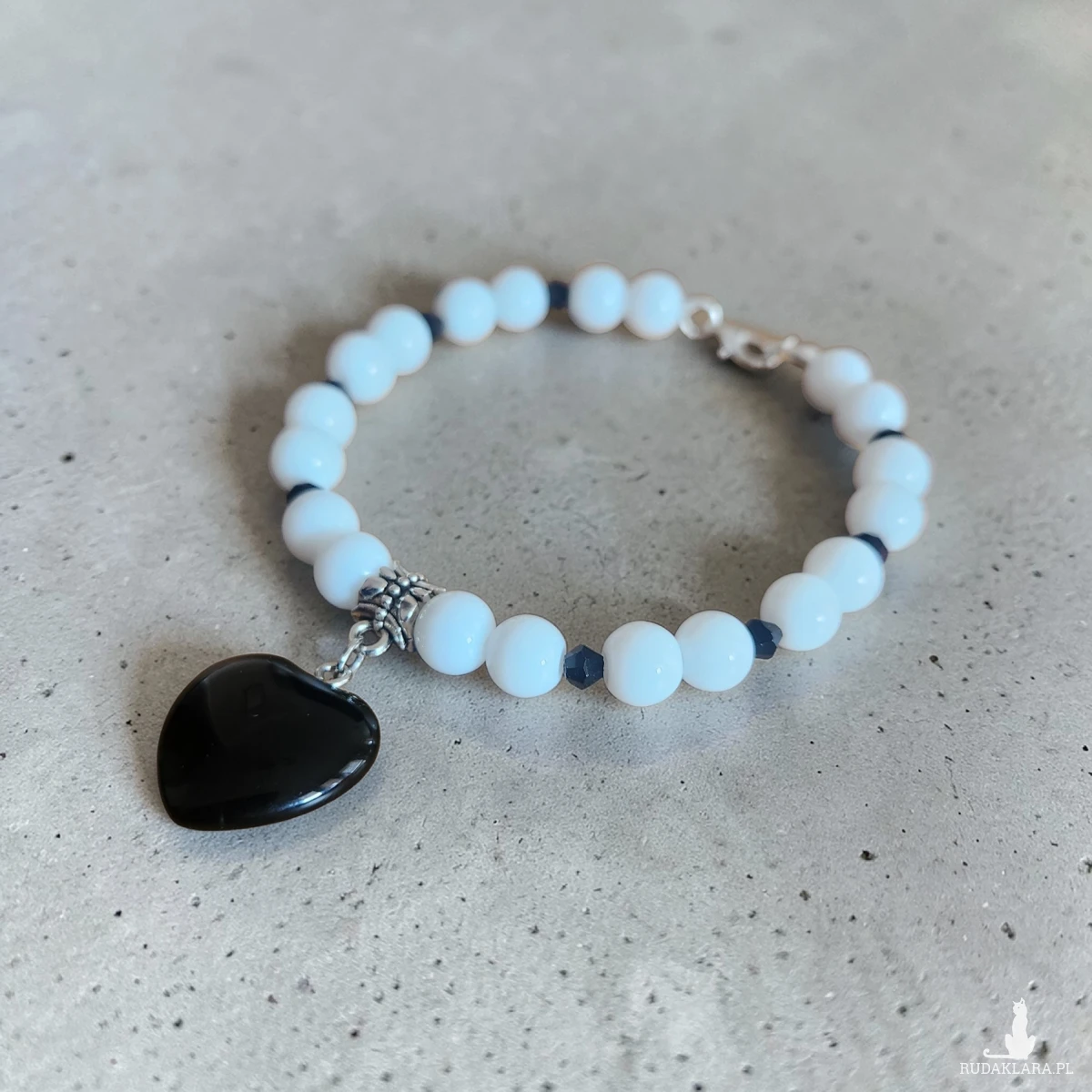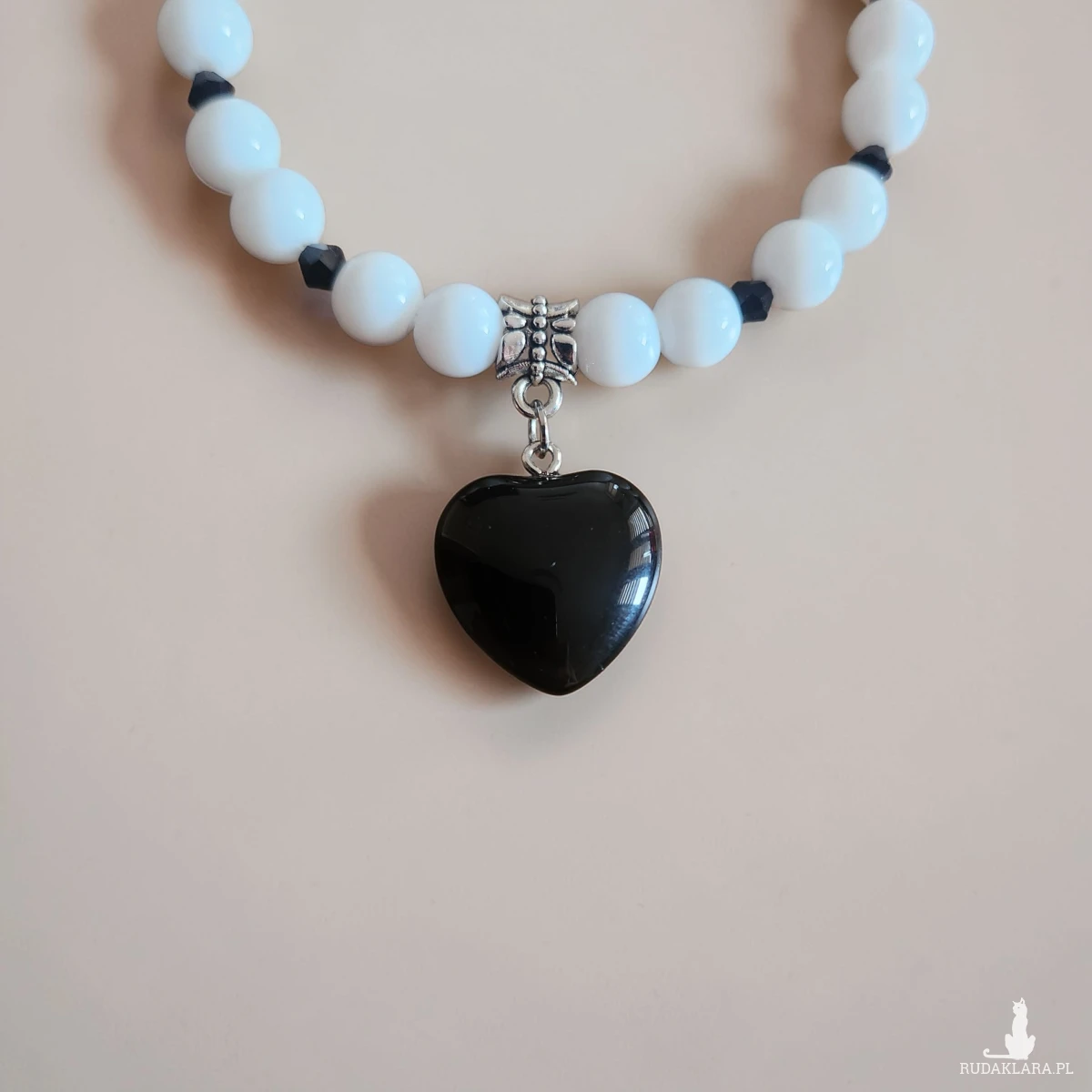 Stylowa bransoletka wykonana z jasnych, mleczno-błękitnych koralików przełamanych drobnymi, ciemnymi elementami. Centralnym punktem biżuterii jest elegancka zawieszka w kształcie czarnego serca, która dodaje całości wyjątkowego charakteru.