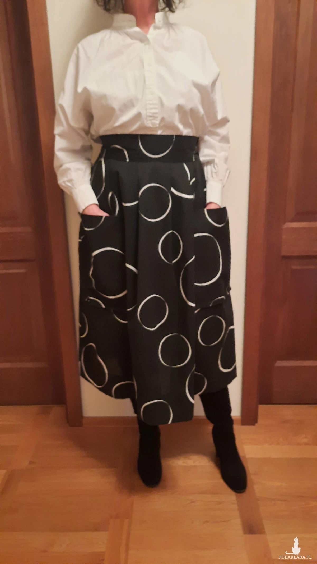 Sprzedam autorską spódnicę uszytą z pięknej czarnej tkaniny w koła z cudownymi kieszeniami. . Jest z tyłu na gumie ,pas 2x38do 43 długość 84 z paskiem. Oryginał, jedyna, bardzo polecam! Zrób sobie prezent! Ta czerń i kieszenie! Już możesz w nią wskoczyć!!!