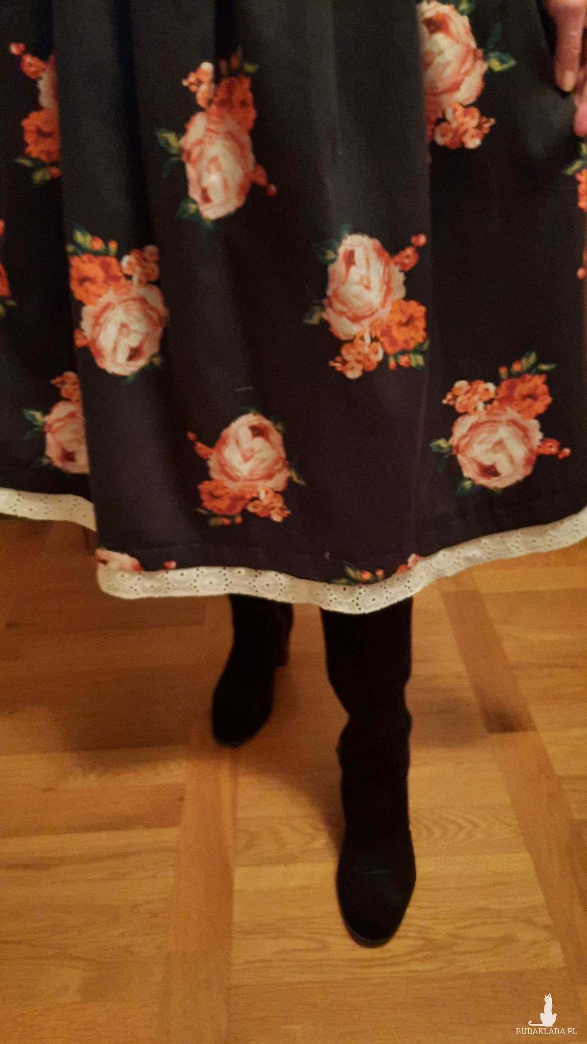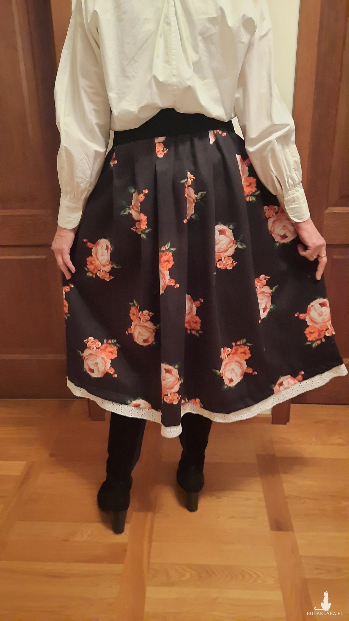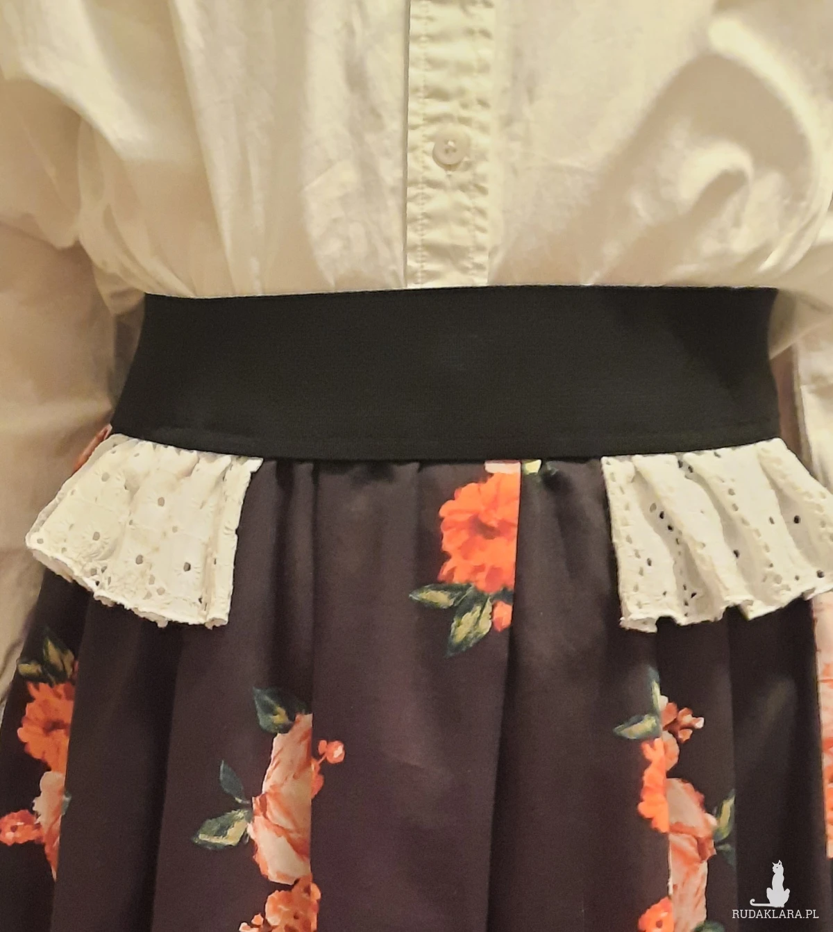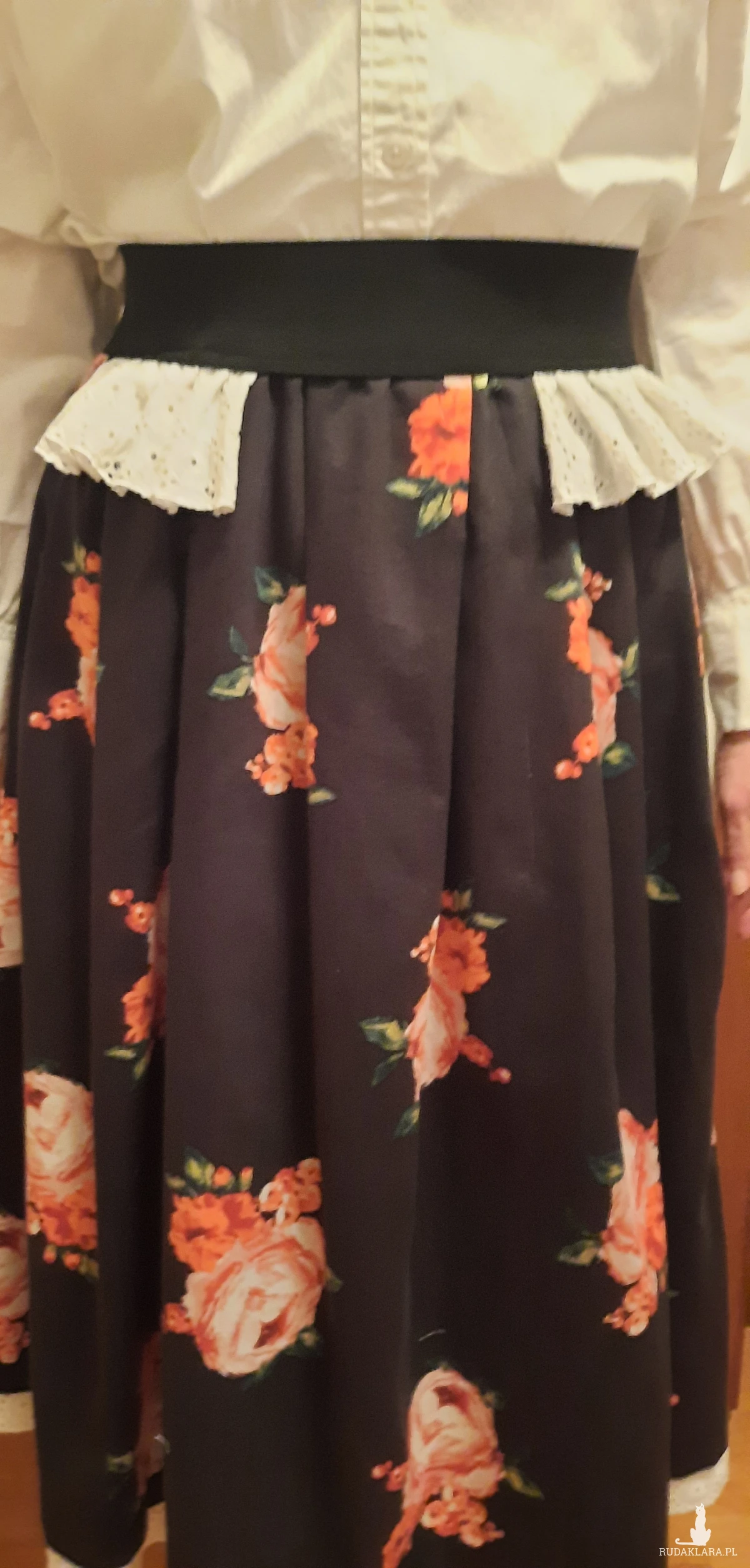 Sprzedam autorską spódnicę uszytą z pięknej czarnej tkaniny w róże i tak jak to widziałam w głowie ;) z dodatkiem białej koronki. Jest na gumie ,pas 2x38do 44 długość 70 z paskiem. Oryginał, jedyna, bardzo polecam! Zrób sobie prezent! Ta czerń i koronką! Już możesz w nią wskoczyć!!!