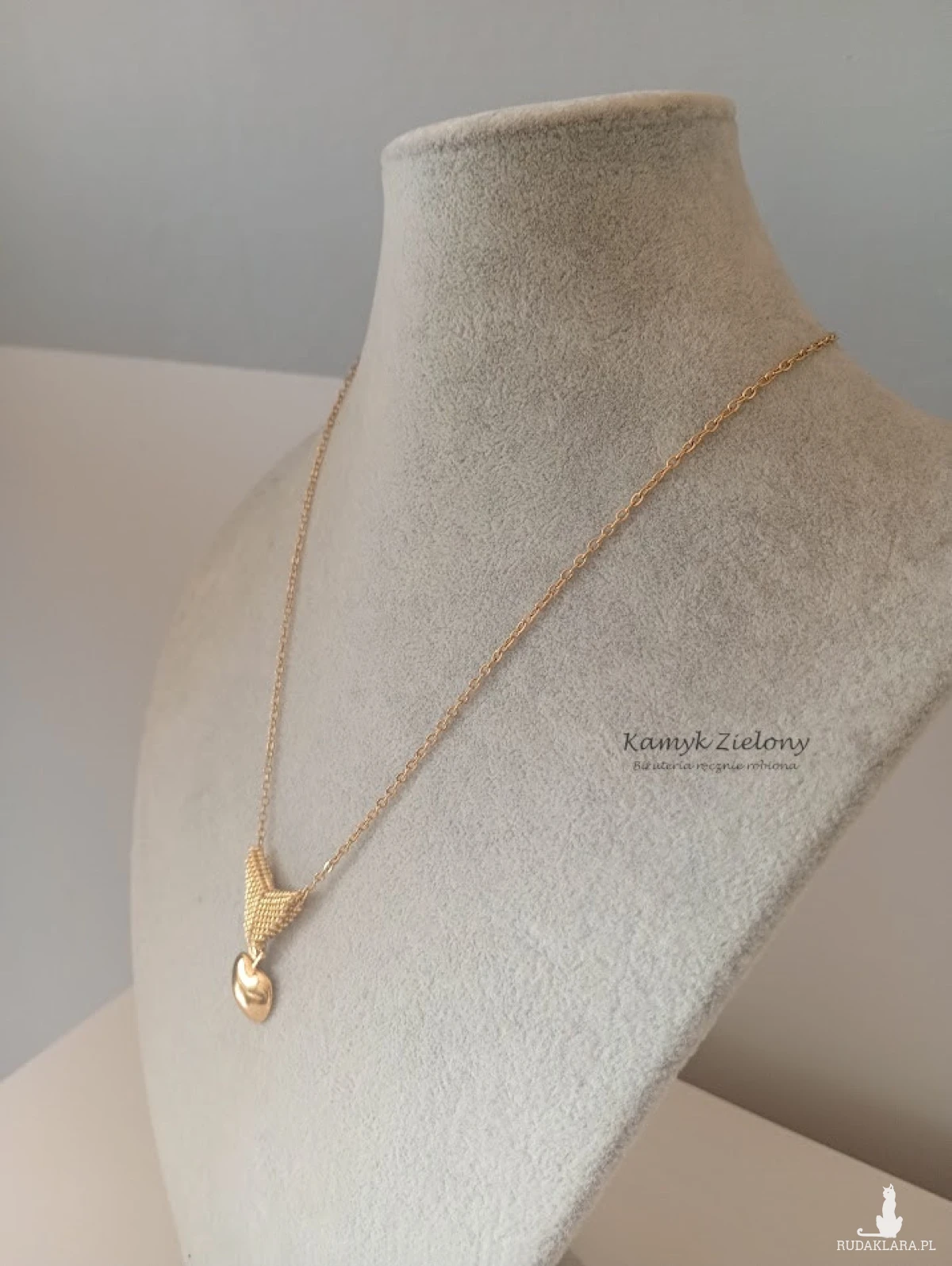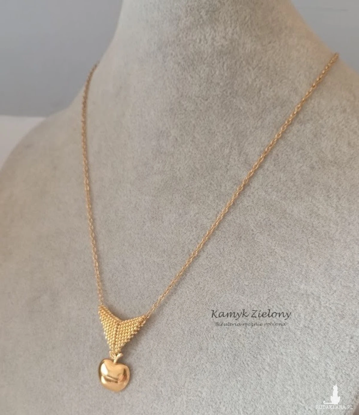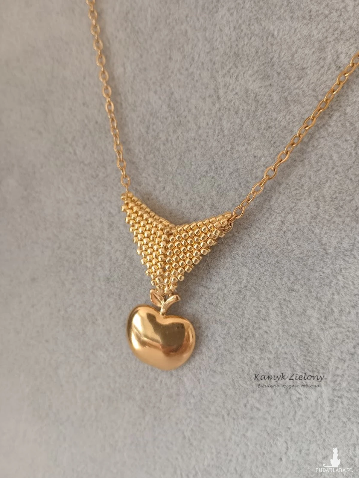 Naszyjnik w formie łańcuszka, na którym umieszczono stalowe złote jabłuszko . Przywieszkę zawieszono na ręcznie uszytej krawatce z koralików Toho w rozmiarze około 1 milimetra, w kolorze złotym - Starlight.