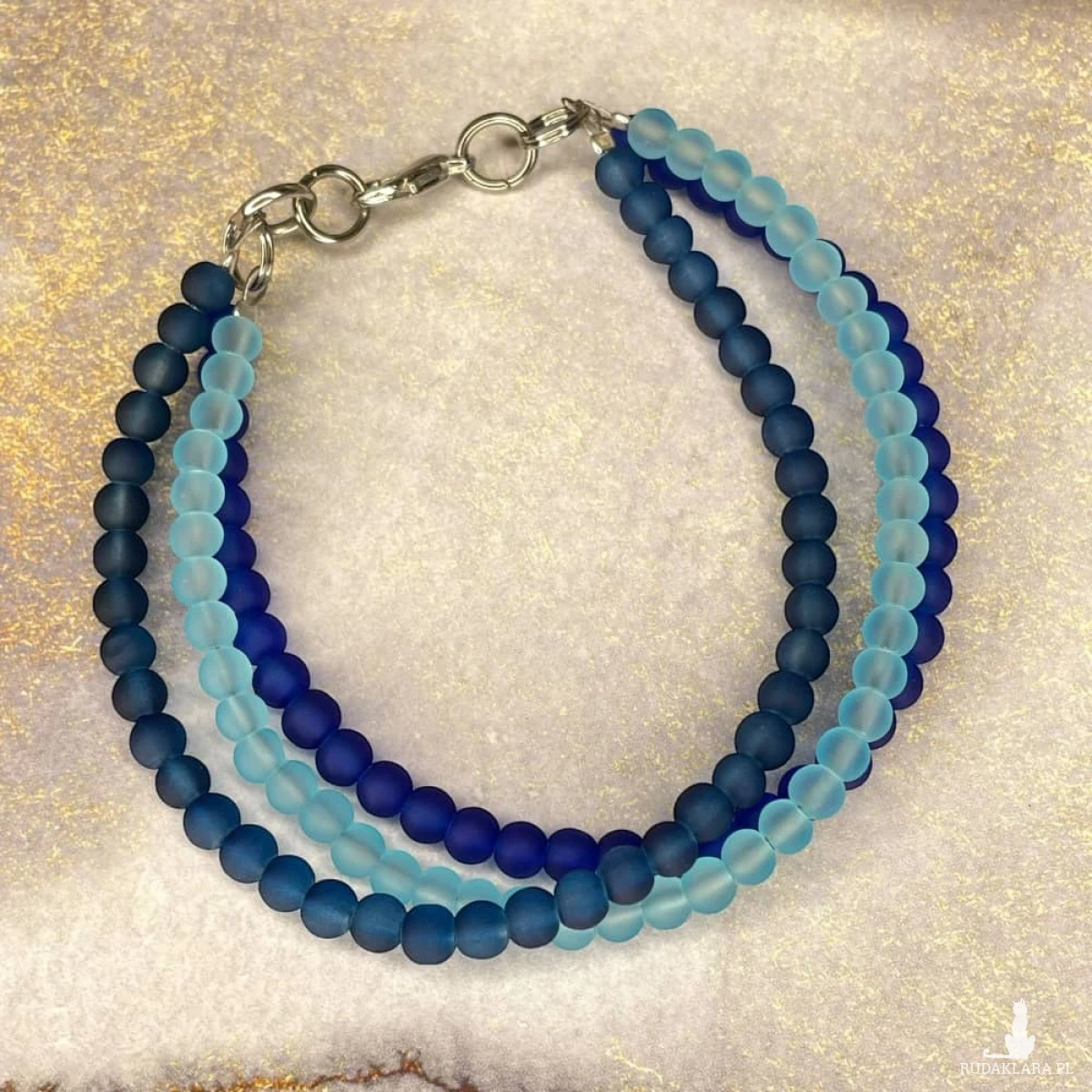 Bransoletka z koralików w odcieniach nieba to delikatny dodatek inspirowany spokojem jasnego dnia i głębokim kolorem nocnego nieba. Trzy sznury matowych koralików łączą różne tony błękitu i stonowanego granatu, tworząc spójną i przyjemną dla oka kompozycję. Srebrzyste elementy nadają całości nowoczesny charakter, a zapięcie na karabińczyk zapewnia wygodę i łatwość noszenia. To bransoletka, która subtelnie ożywia codzienne stylizacje, wprowadzając do nich nutę koloru i spokojnej elegancji.