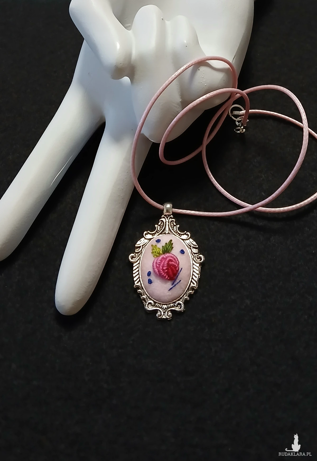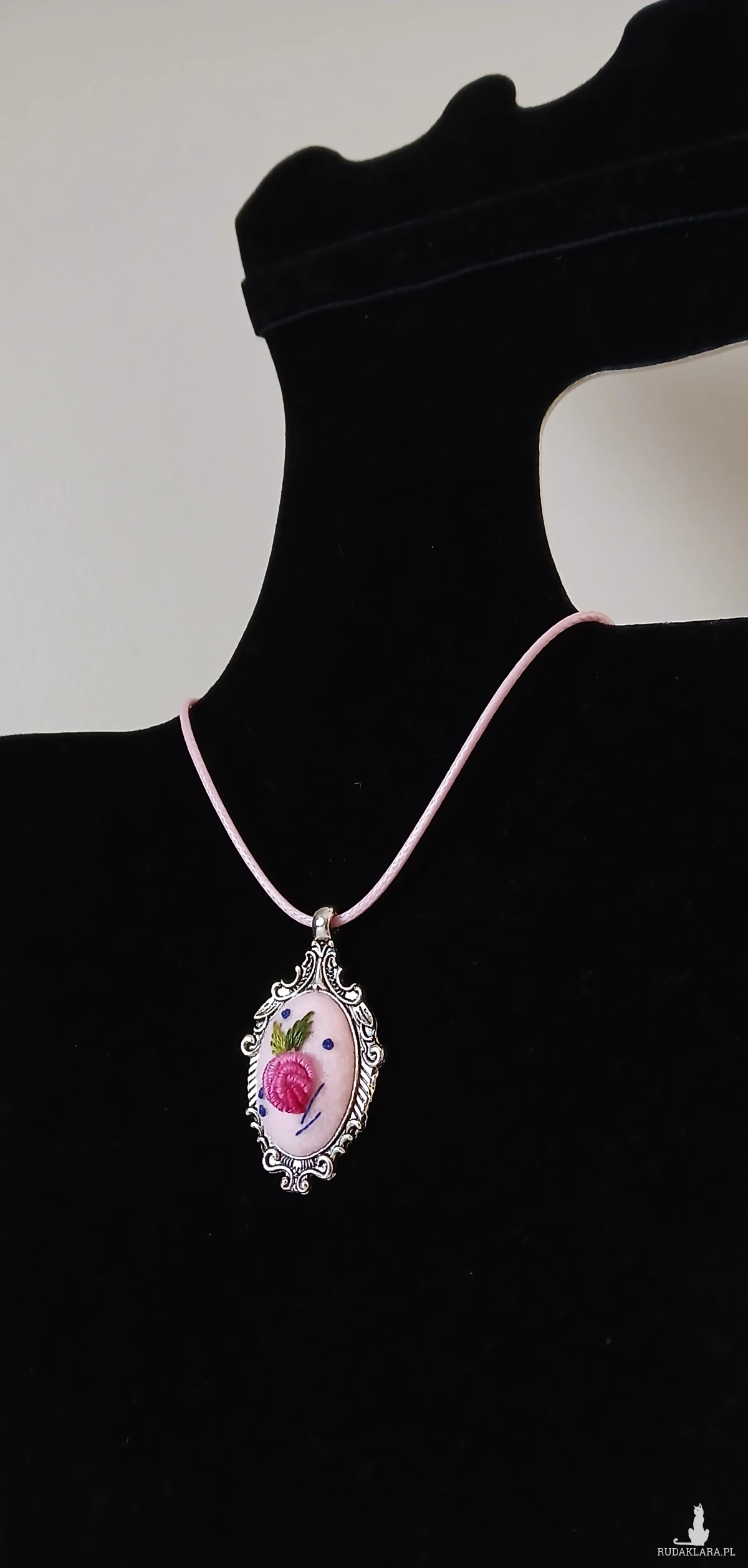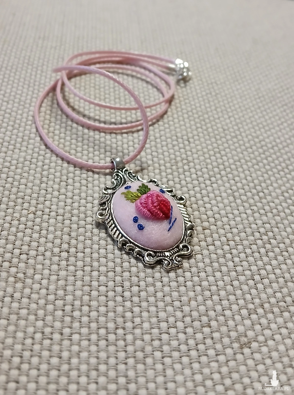 Przesłodki, różowy wisiorek z ornamentem będzie trafionym prezentem dla pań w każdym wieku. Granatowy akcent dodaje pazura i sprawia, że wisior jeszcze bardziej rzuca się w oczy.