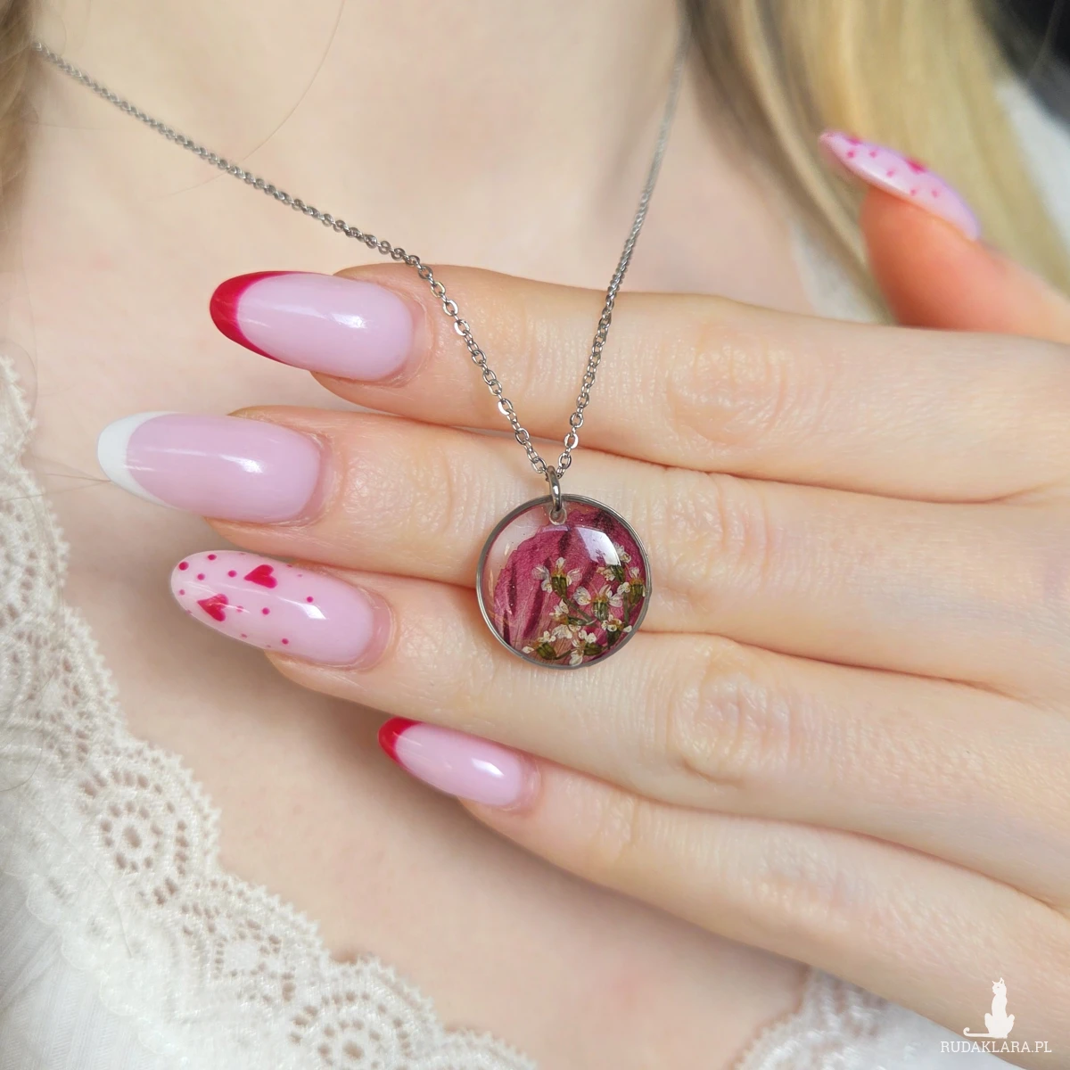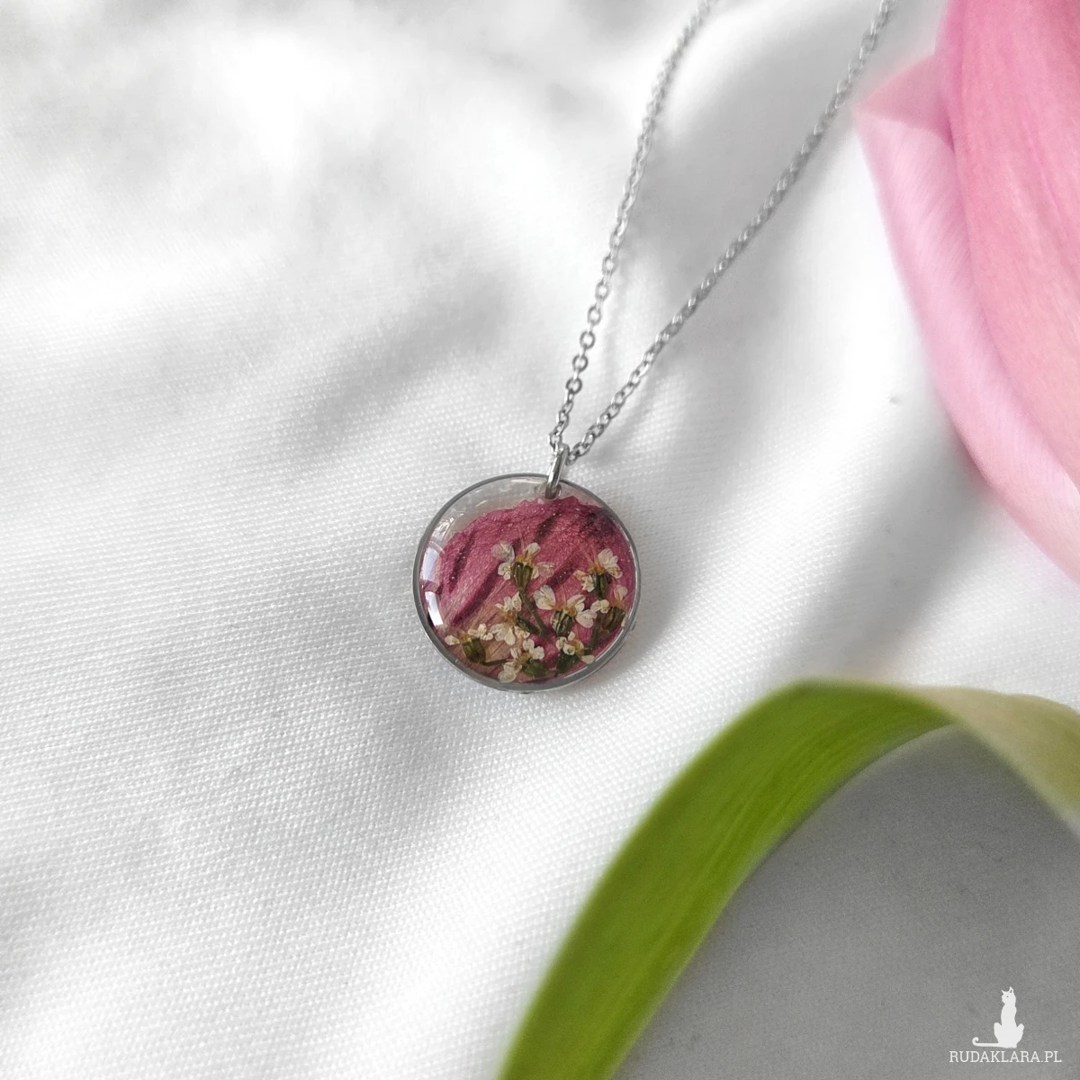Naszyjnik stworzony jest z własnoręcznie hodowanych, zbieranych i suszonych kwiatów z mojego ogrodu. Ręcznie selekcjonuję kwiaty, aby były najpiękniejsze.