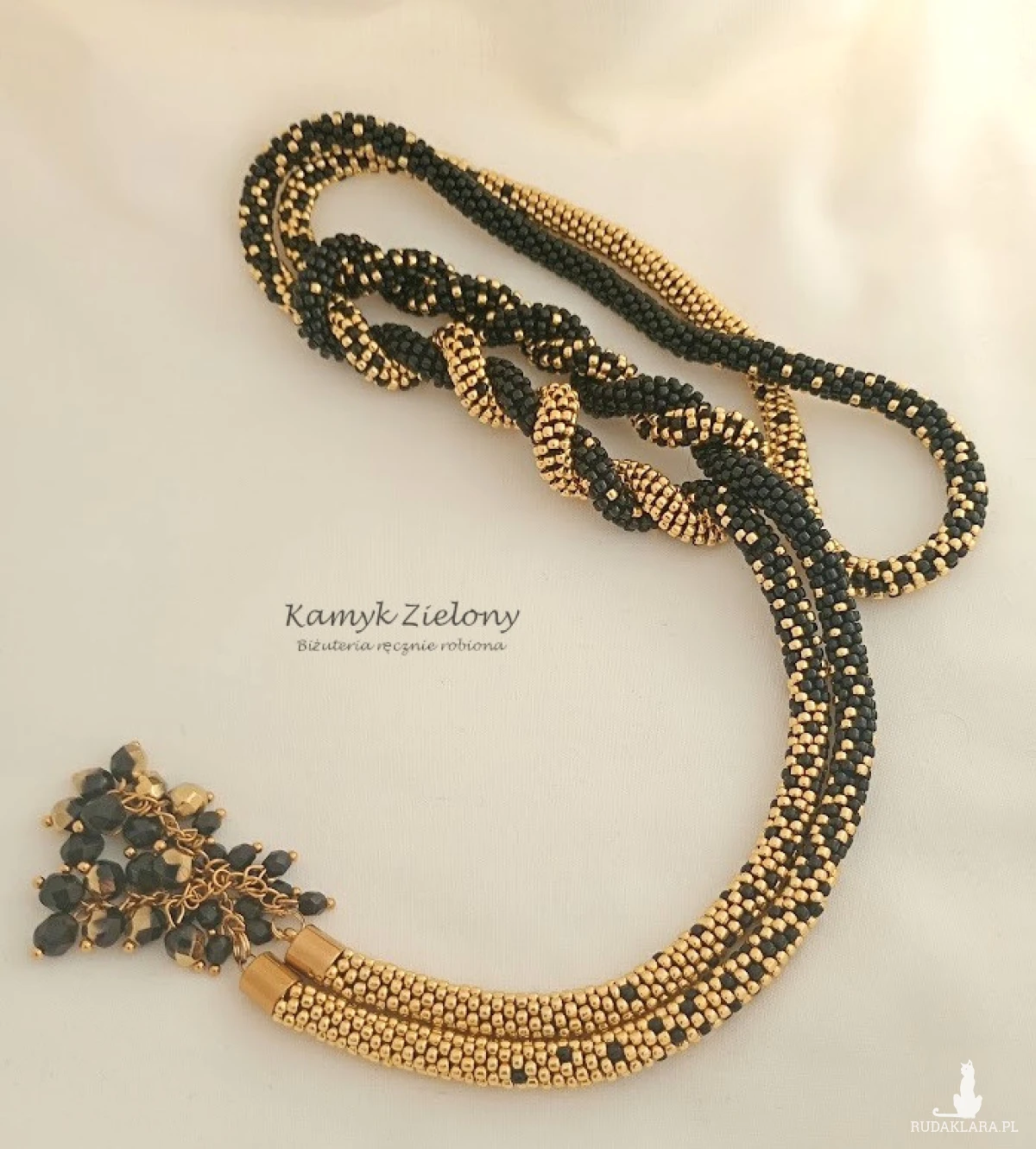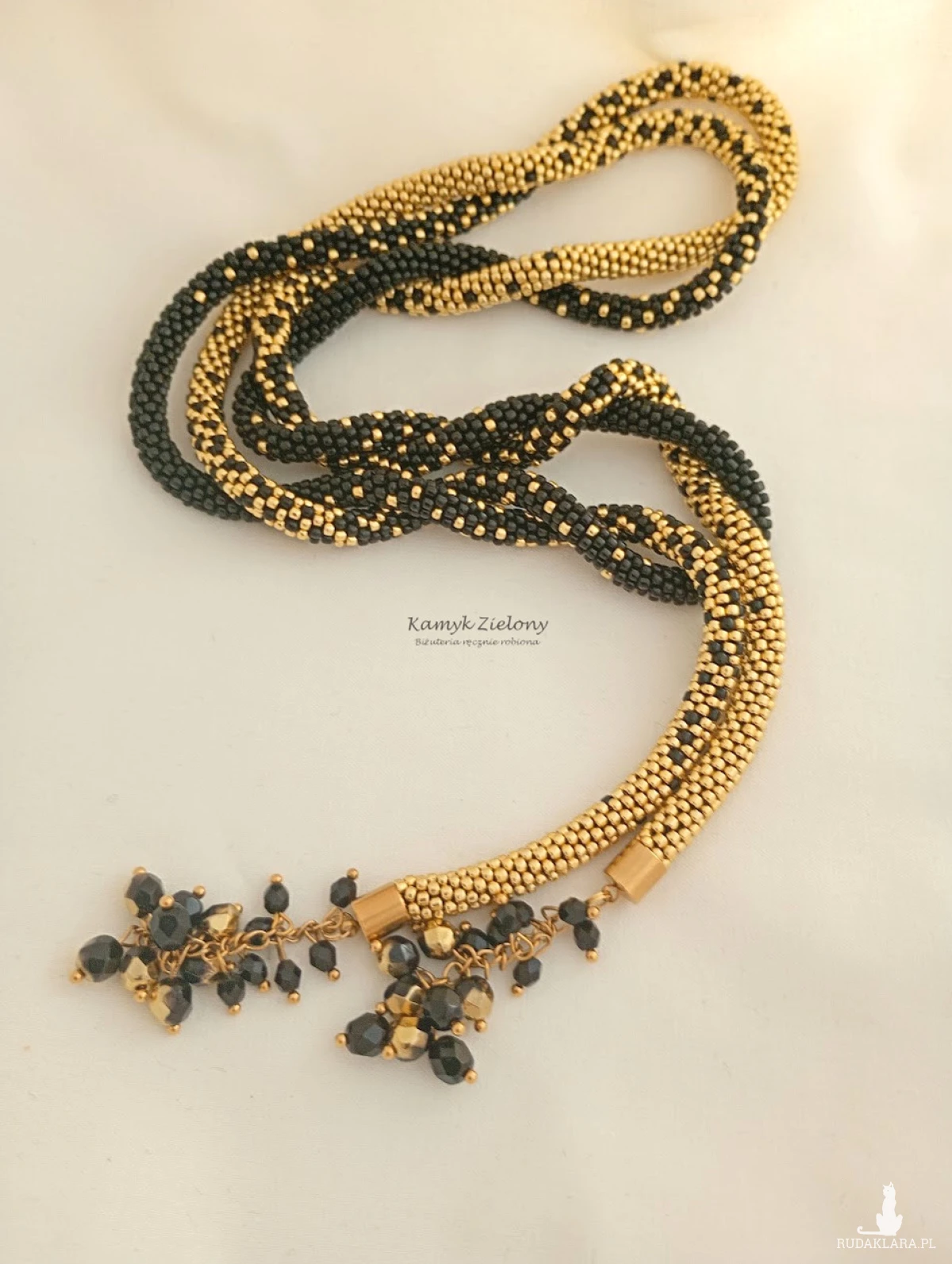 Naszyjnik wykonany ręcznie z maleńkich, szklanych koralików Toho w kolorze czarnym i złotym, tworzących długi sznur koralikowy o średnicy około 5 mm.