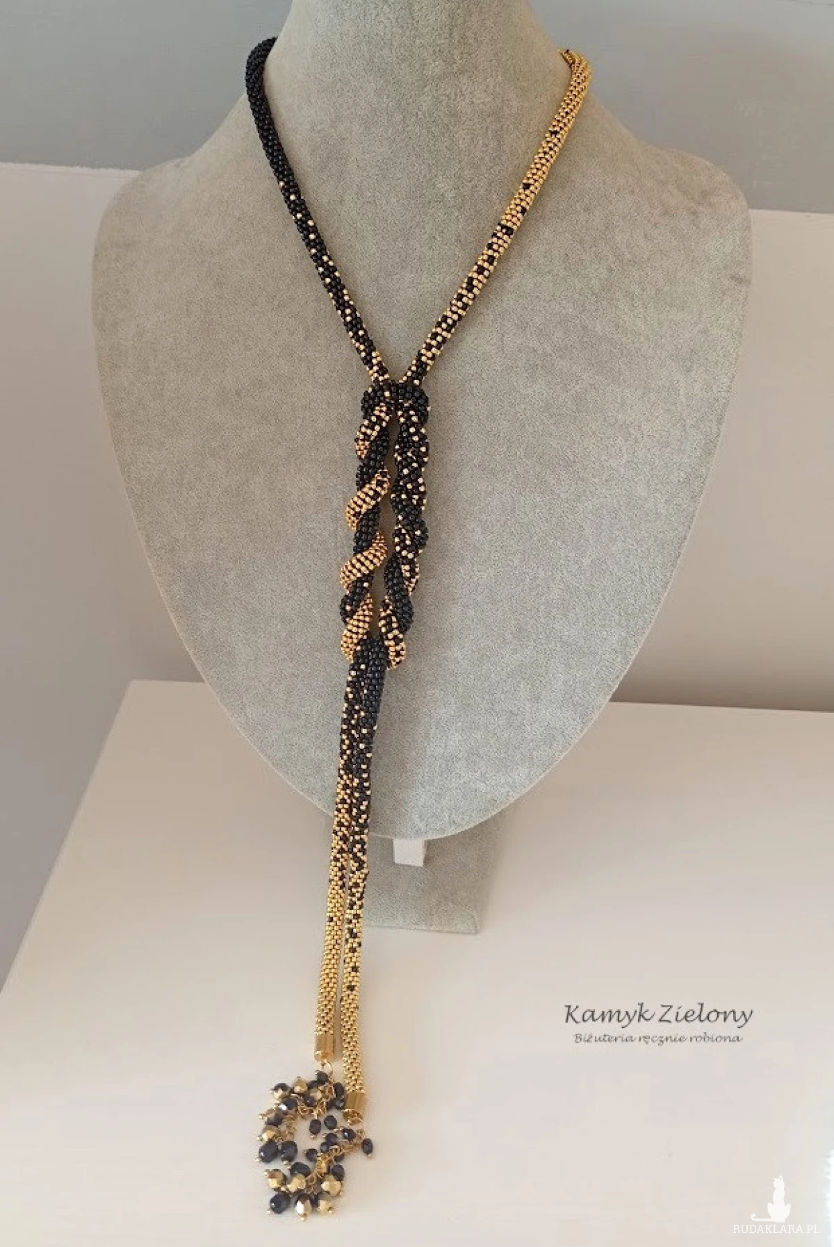 Czarno-złoty lariat z kryształkami - wykończenia ze stali szlachetnej