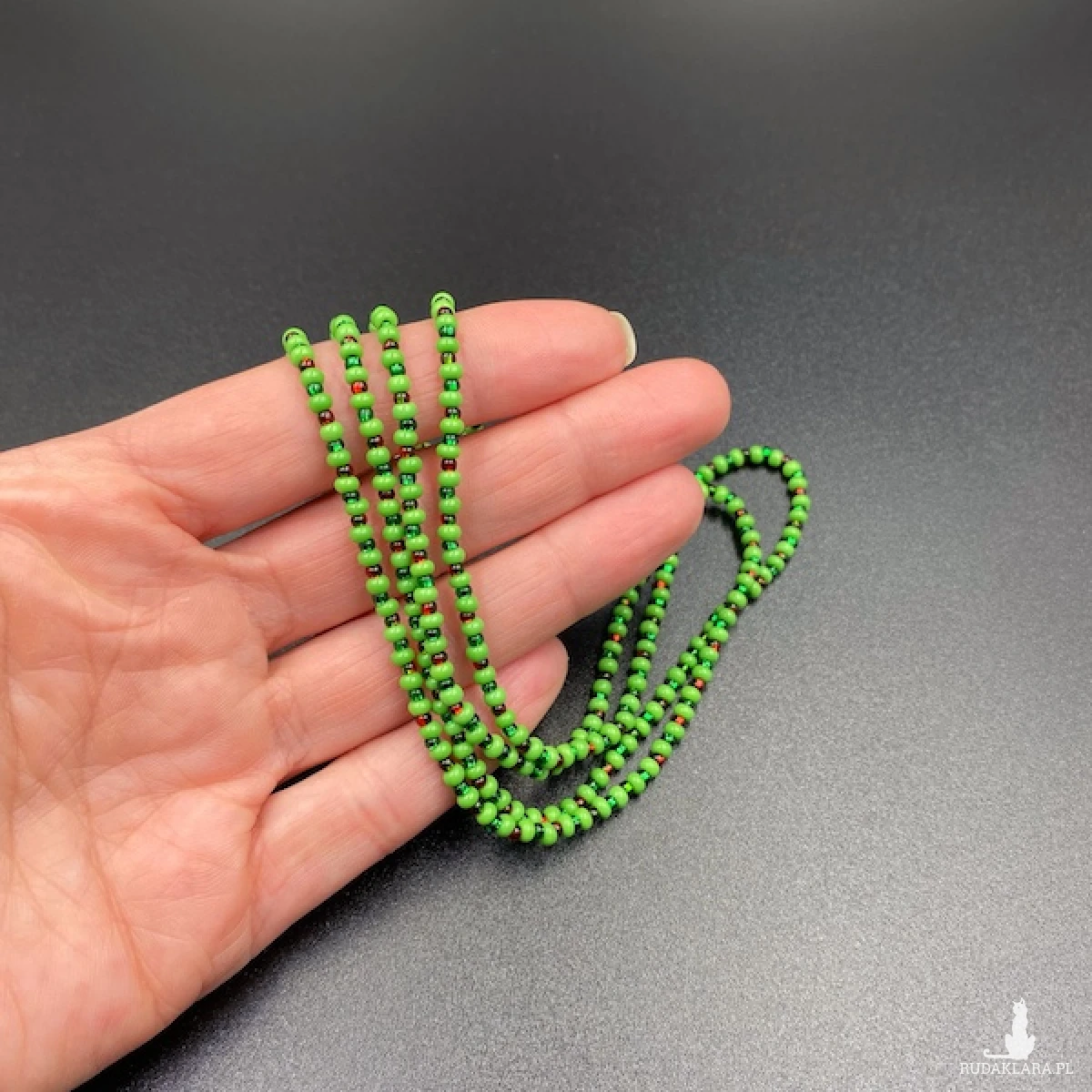 Krótki naszyjnik ( złożony z dwóch sznurów ) został wykonany ręcznie ze szklanych koralików w kolorze zielonym i połyskującym czerwonym. Elementy metalowe ze stali chirurgicznej.
