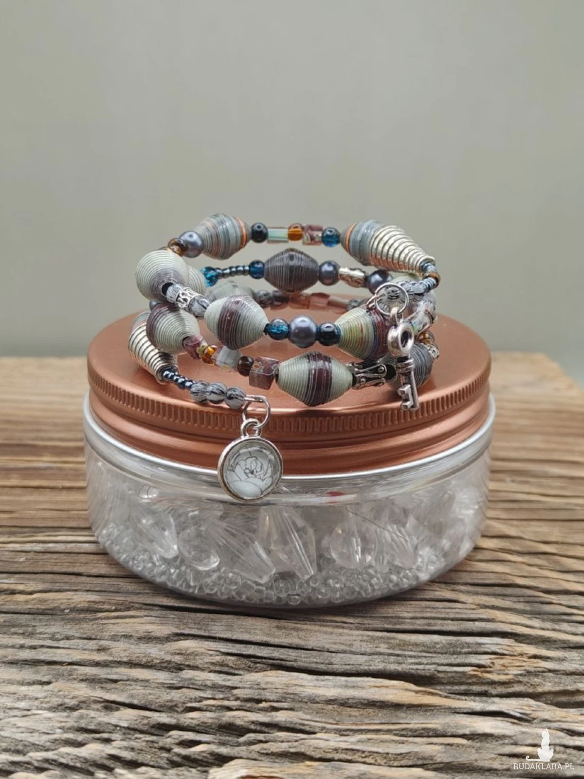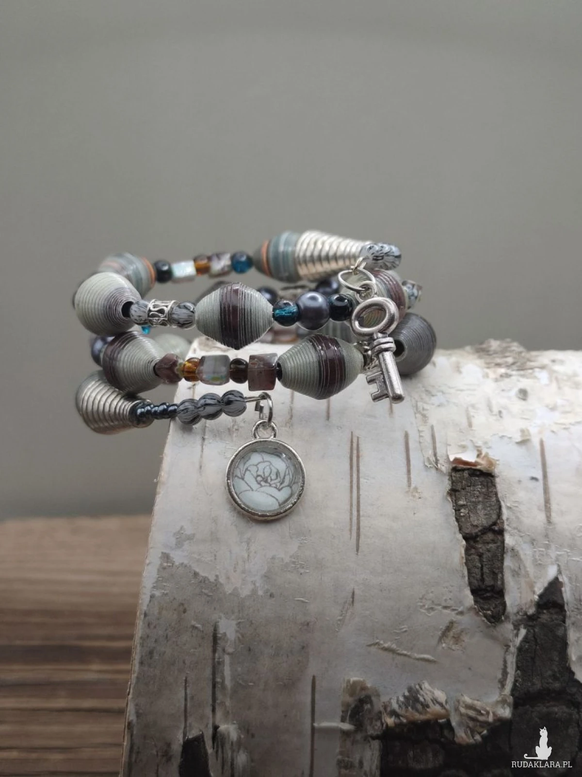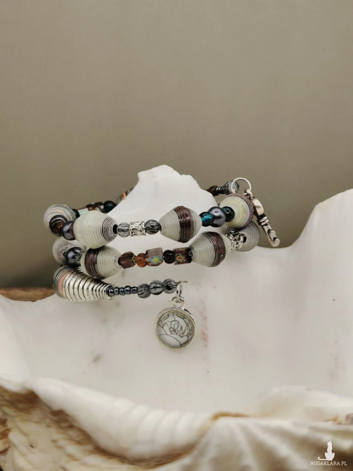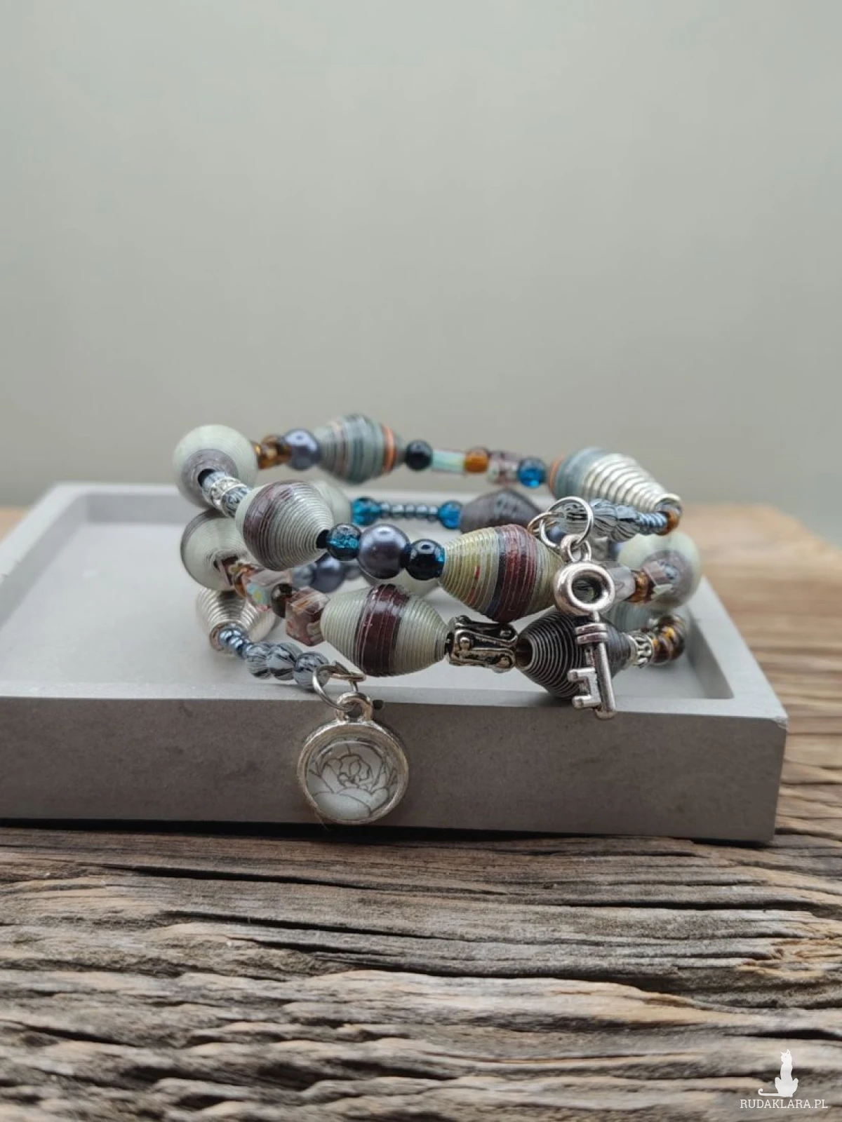 Unikatowa bransoletka handmade, która łączy rzemiosło artystyczne z ideą slow fashion. Wykonana z ręcznie zwijanych i lakierowanych koralików papierowych, zachwyca swoją formą, lekkością i niepowtarzalnym charakterem. Stonowana kolorystyka ziemi – odcienie szarości, beżu, grafitu i subtelnych akcentów niebieskiego – nadaje jej elegancki, naturalny wygląd. Całość uzupełniają dekoracyjne elementy i symboliczne zawieszki, które dodają bransoletce wyjątkowej historii i charakteru. To biżuteria dla osób ceniących oryginalność, ekologię i rękodzieło z duszą.