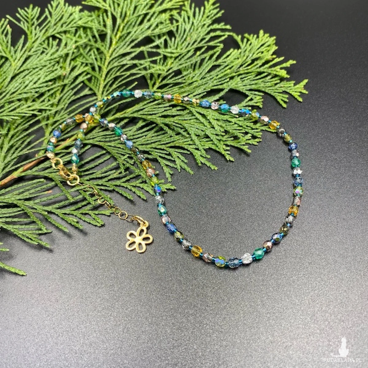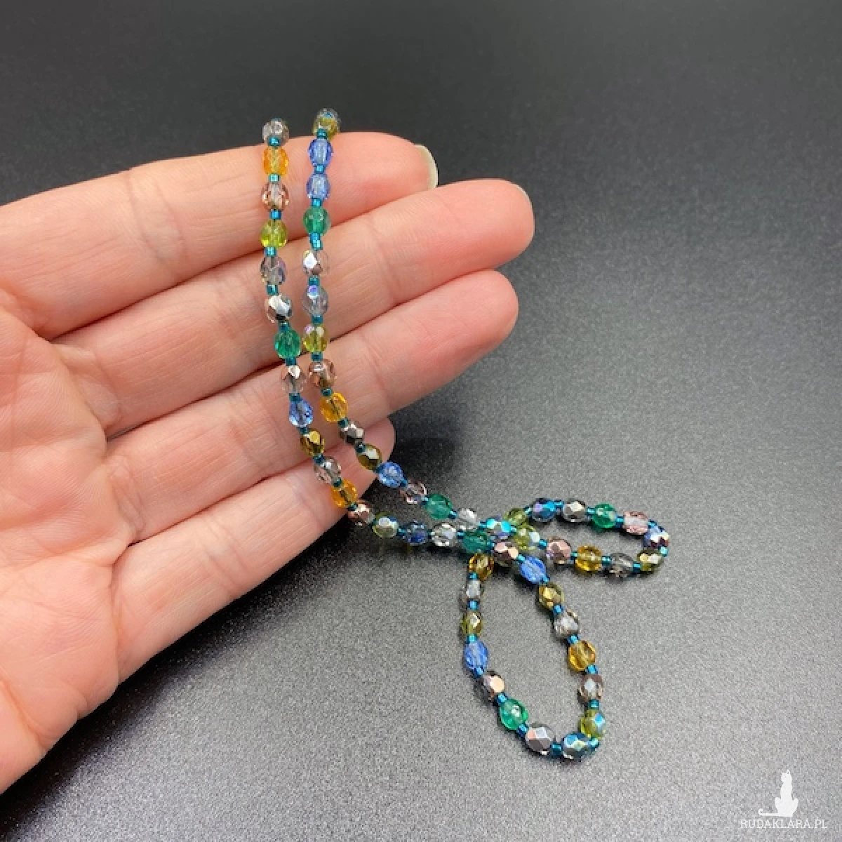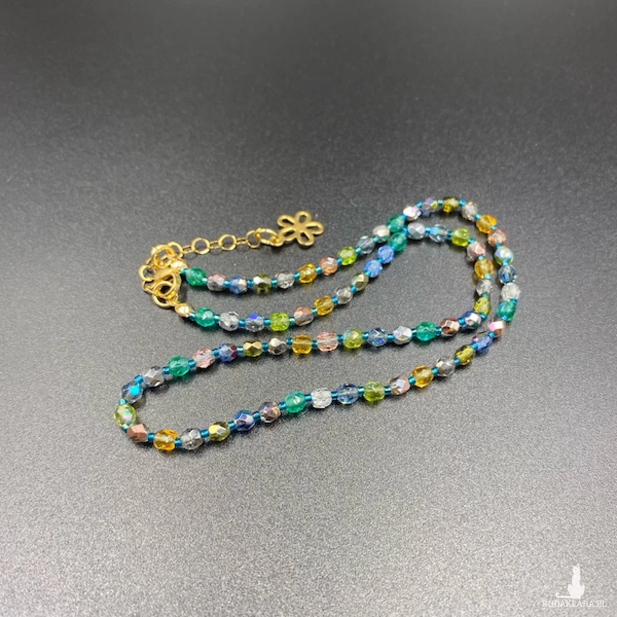 Krótki naszyjnik został wykonany ręcznie z czeskich, szklanych koralików Fire Polish 4 mm o kryształowej, połyskującej powłoce w bladych odcieniach niebieskiego, srebrnego, morskiego, żółtego i zielonego.