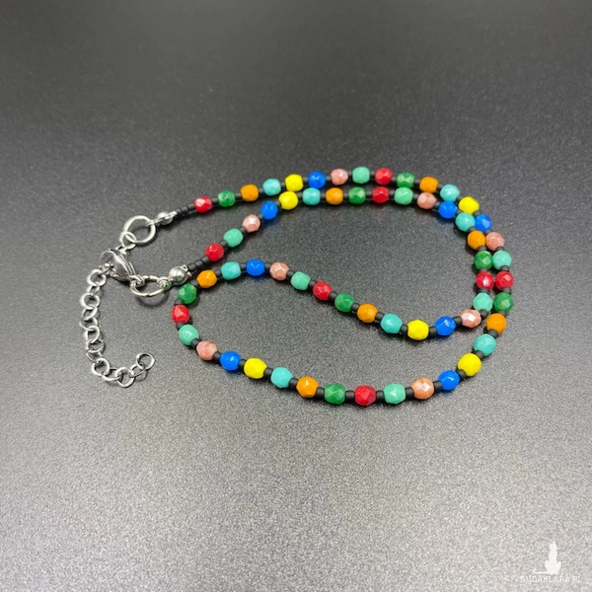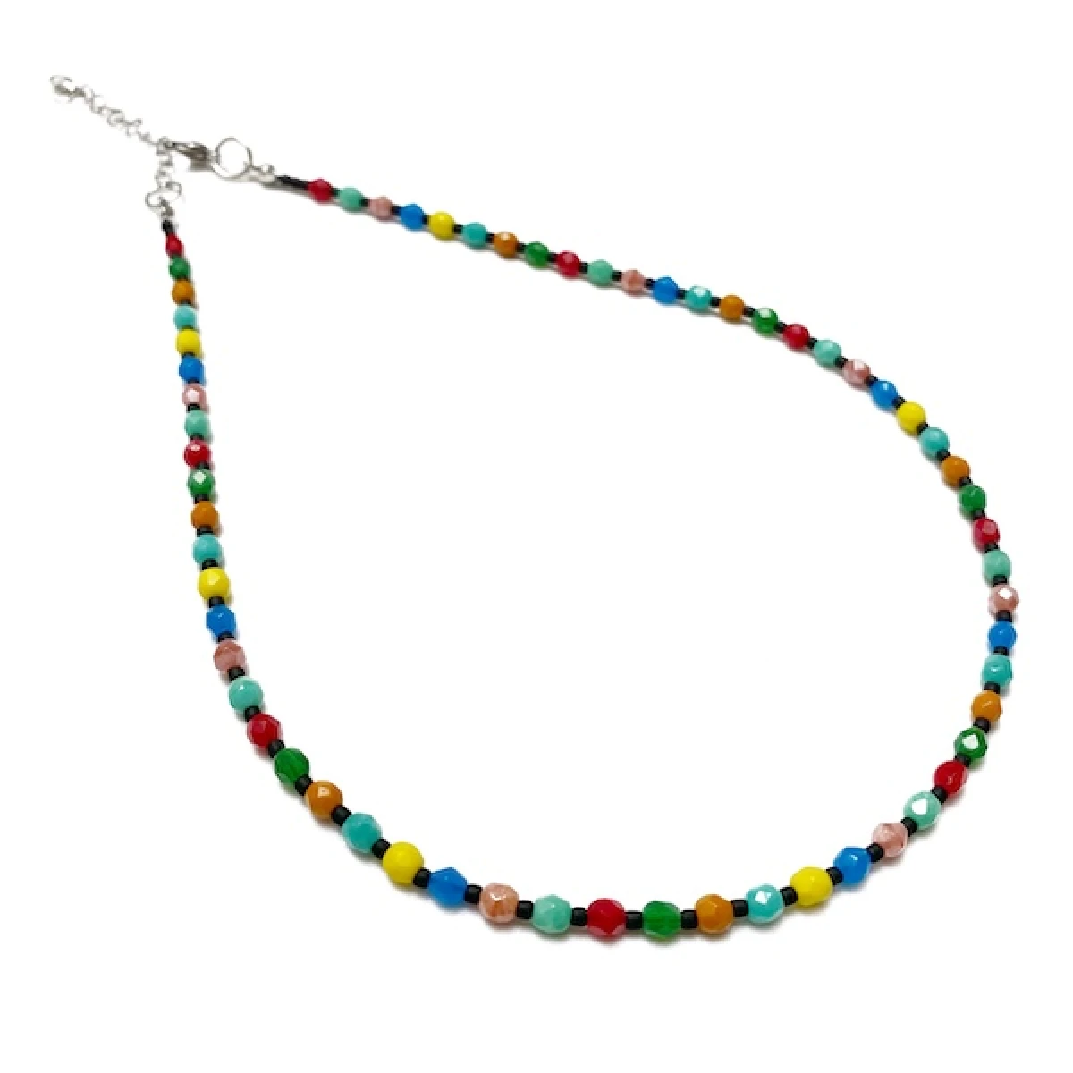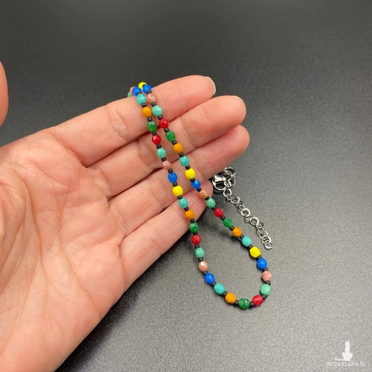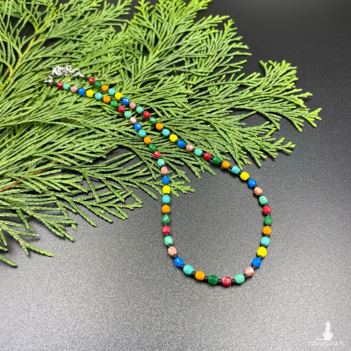 Krótki naszyjnik został wykonany ręcznie z czeskich, szklanych koralików Fire Polish 4 mm wielokolorowy.