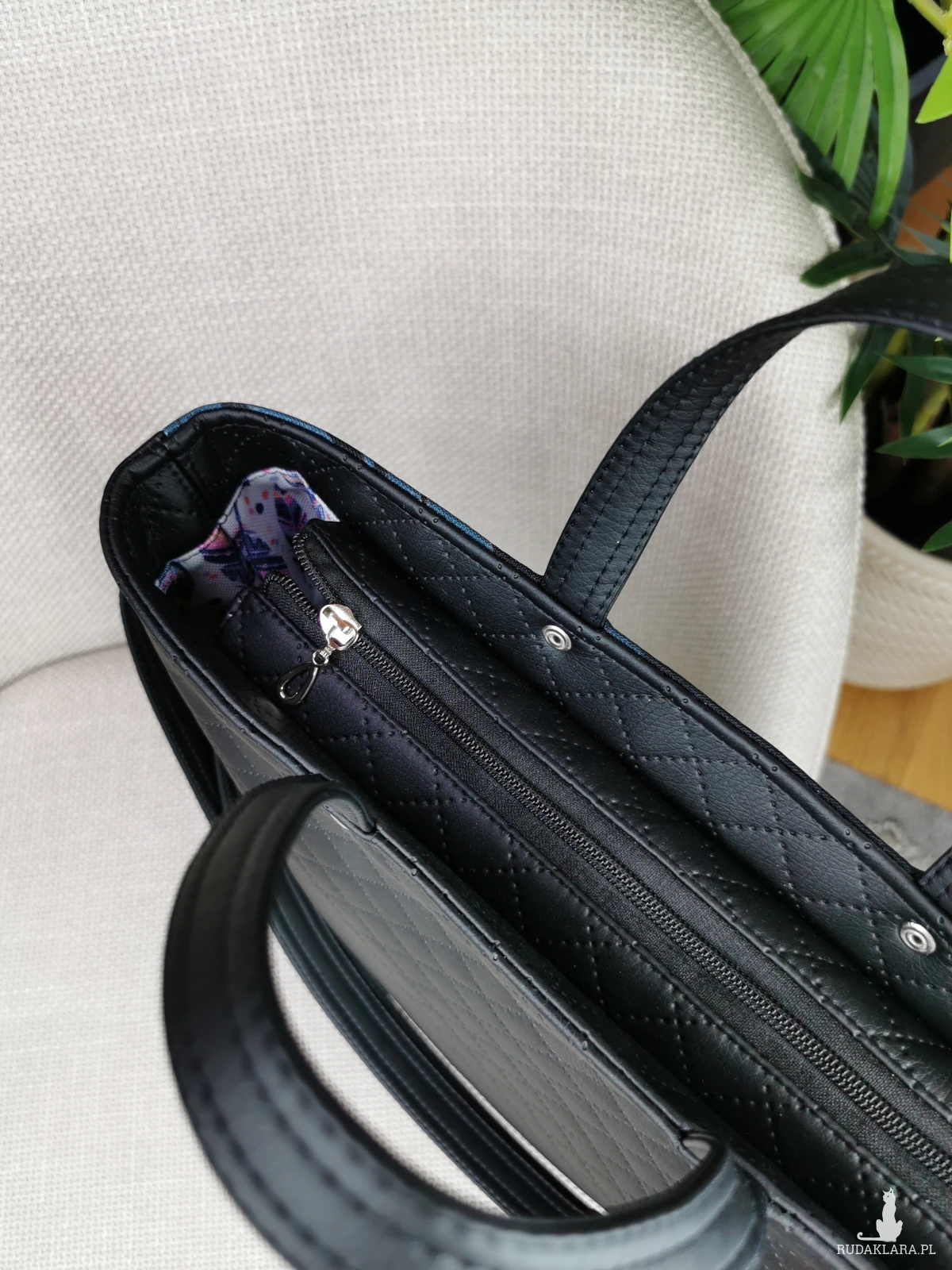 Wykonana z tkaniny o właściwościach wodoodpornych ( przód torebki ) , oraz czarnej pikowanej skóry ekologicznej ( tył torebki ) .