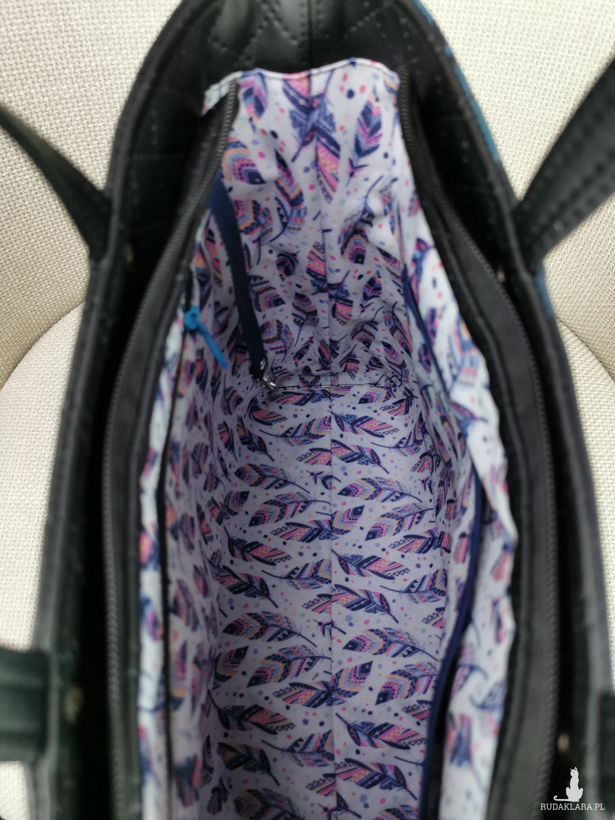 Wewnątrz wzorzysta podszewka wodoodporna, pojemna kieszeń na zamek i kieszeń wsuwana.