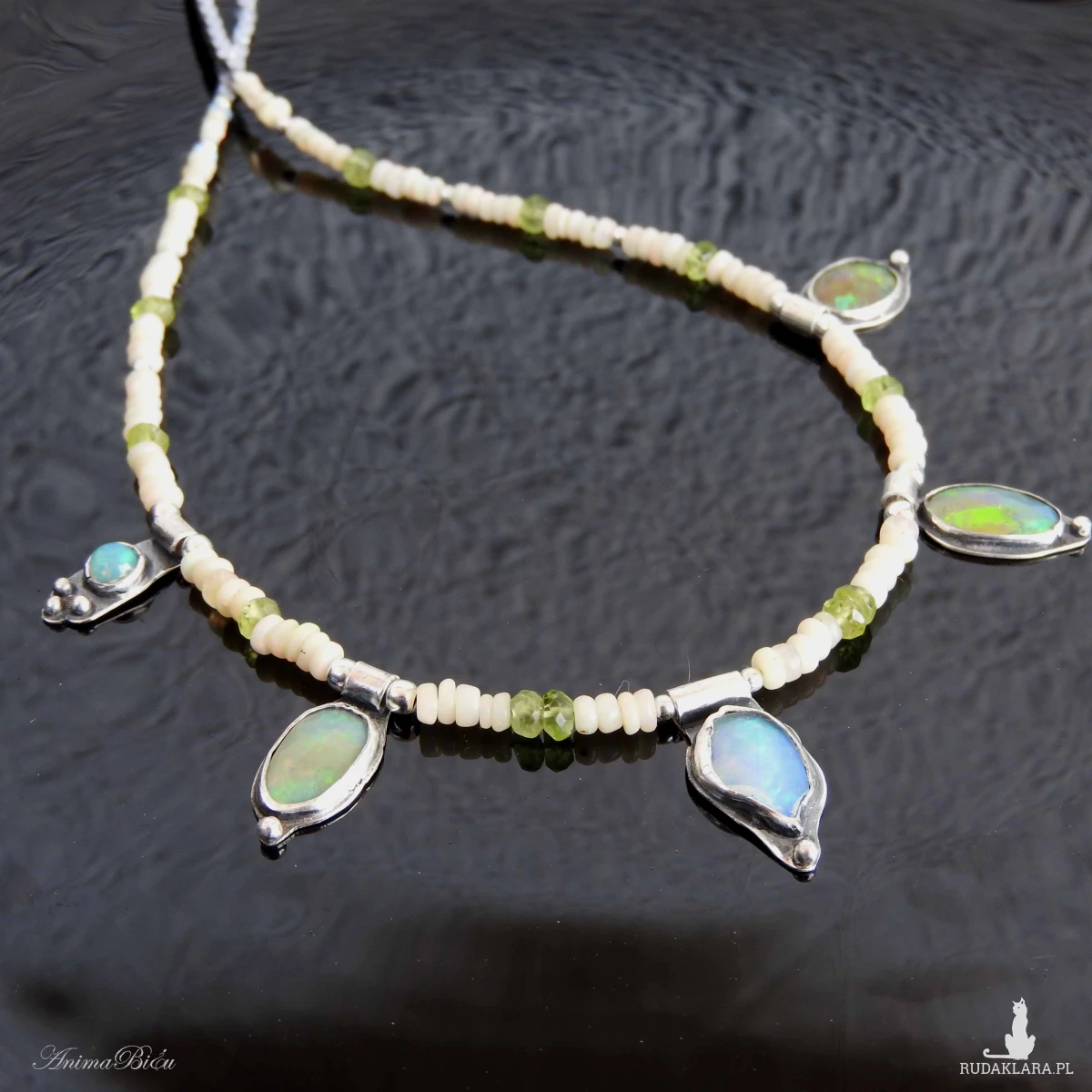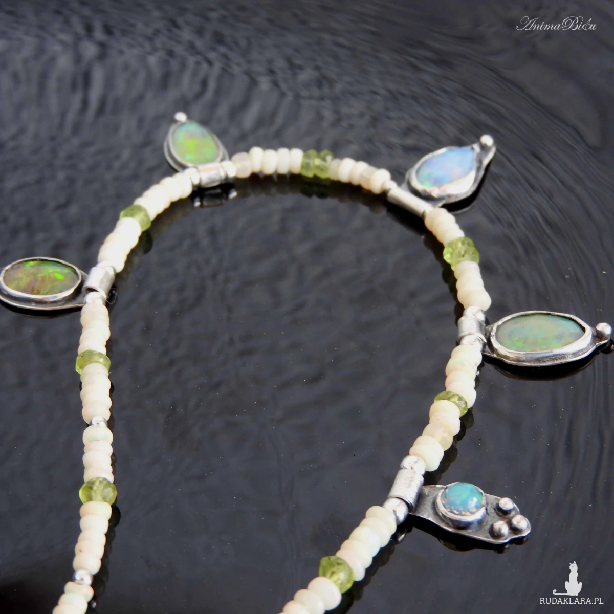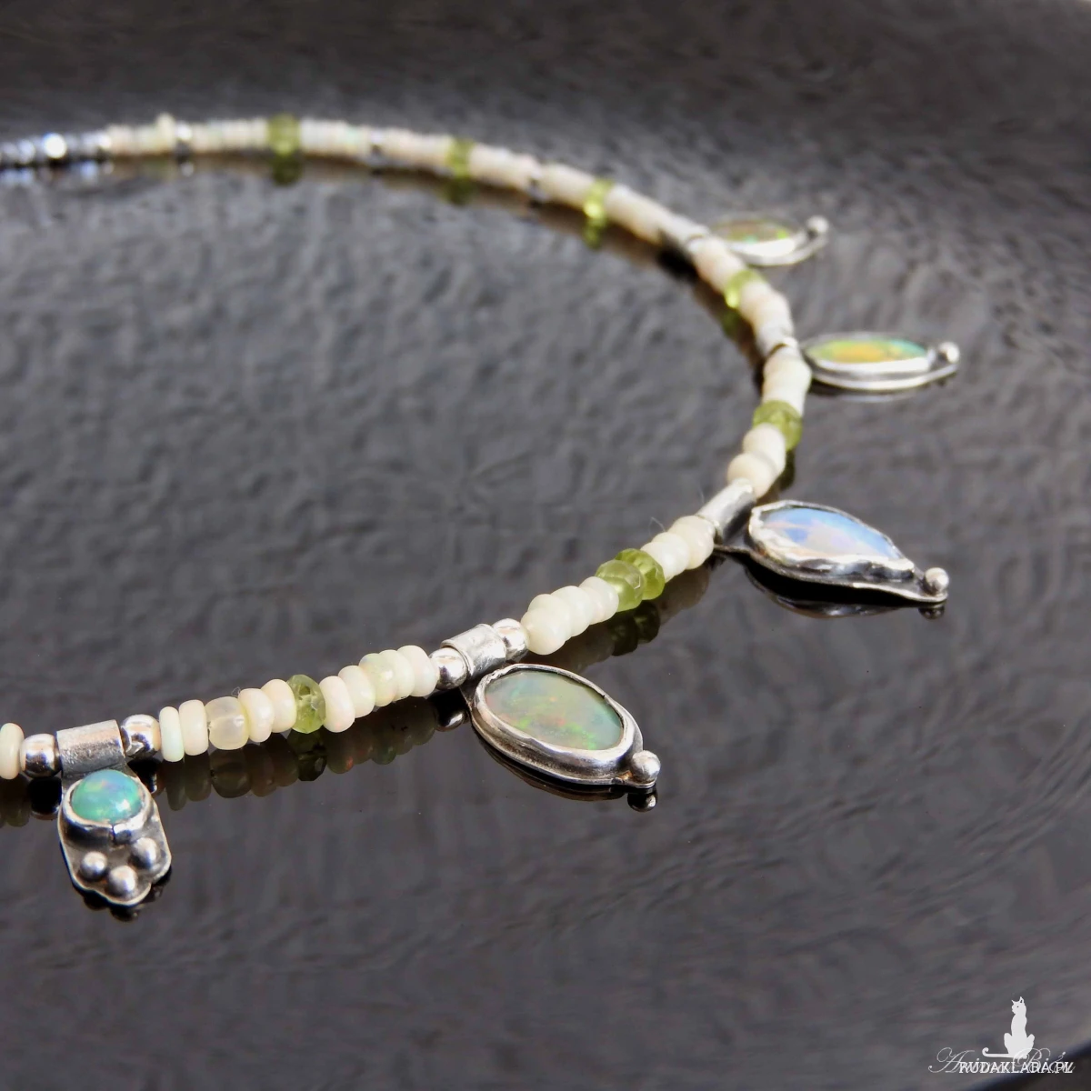 Naszyjnik srebrny z opalem etiopskim, oliwinem i hematytem.