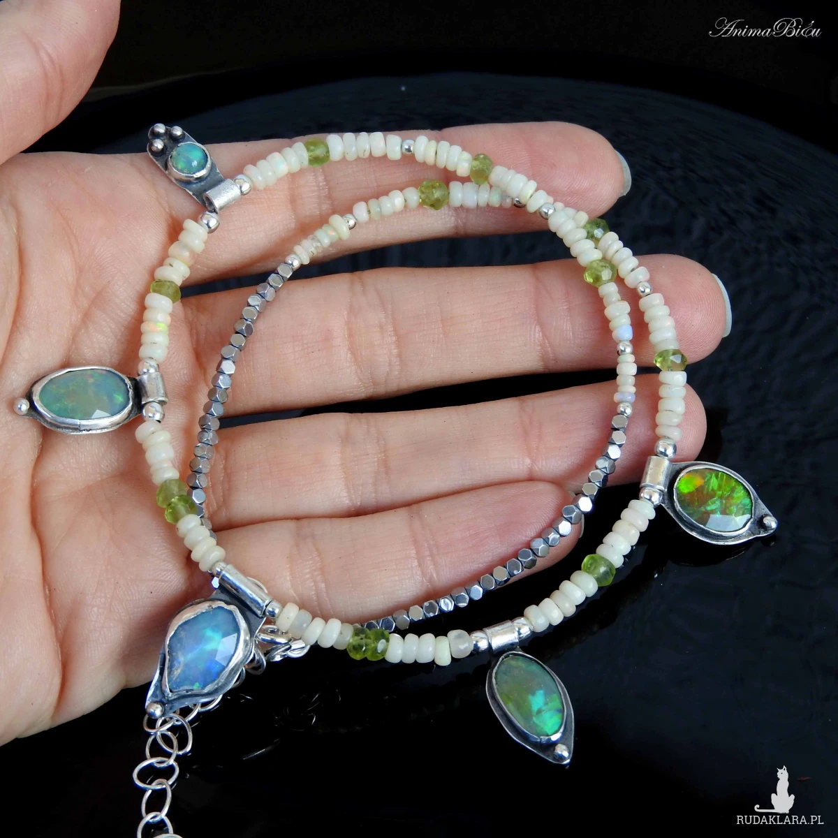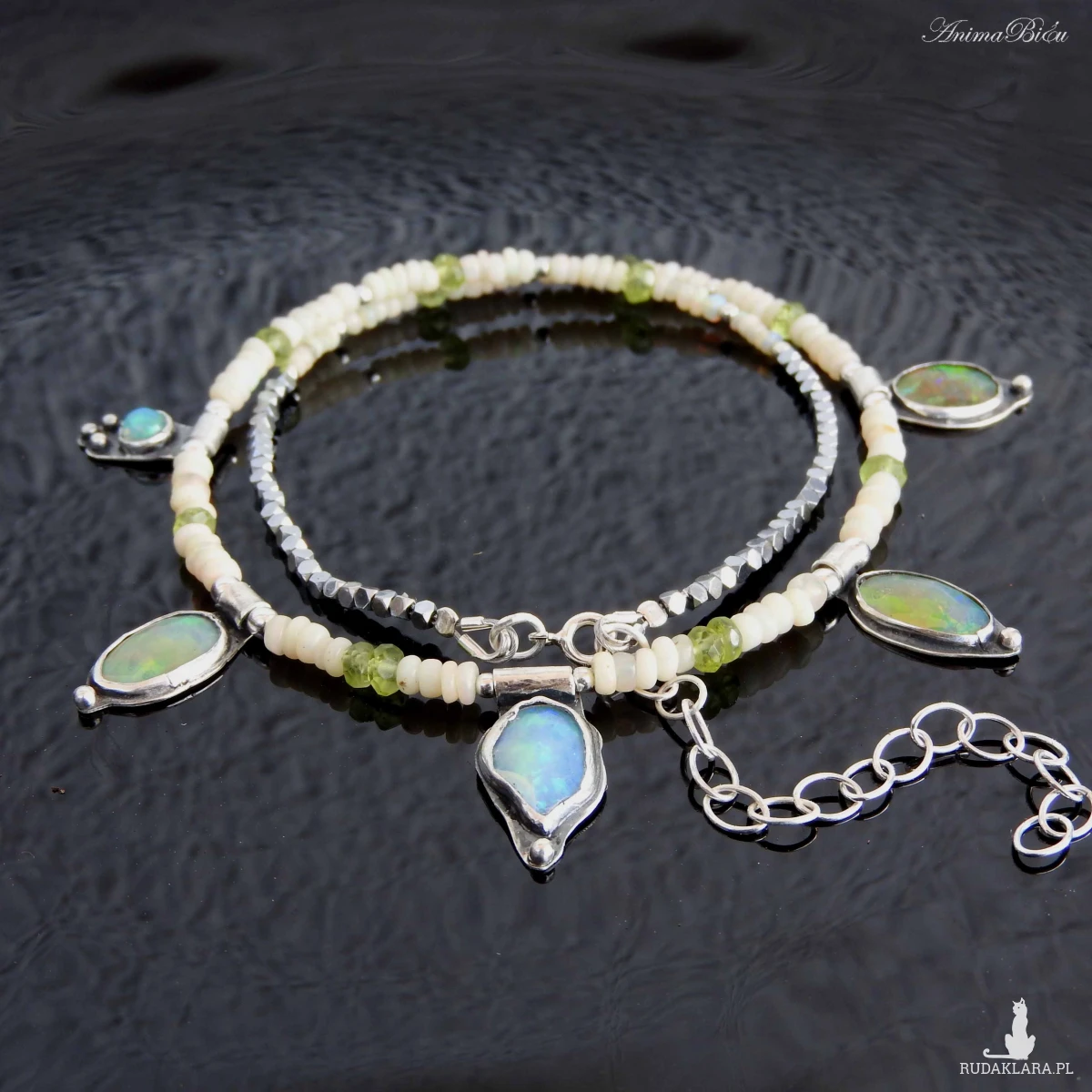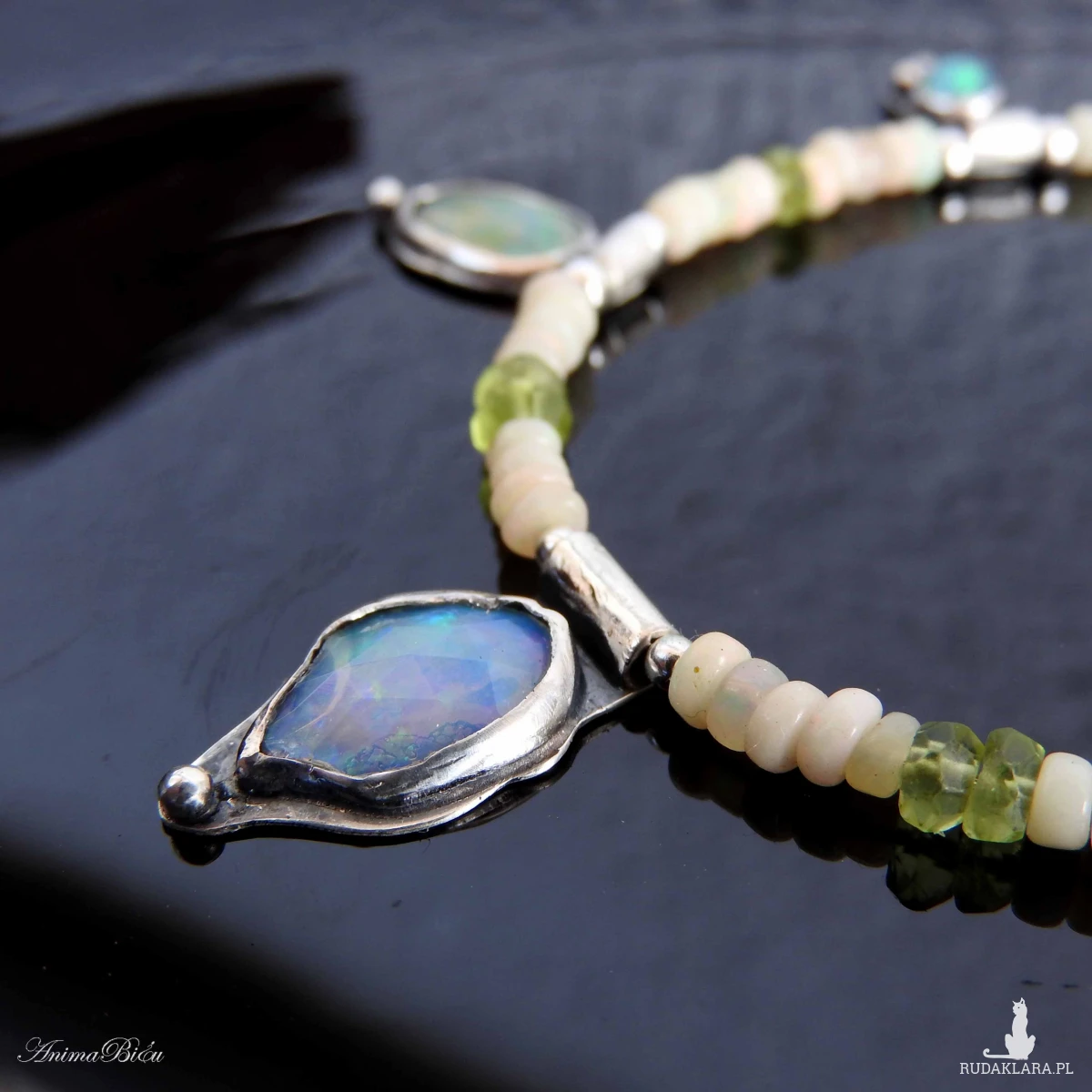 Naszyjnik srebrny z opalem etiopskim, oliwinem i hematytem.