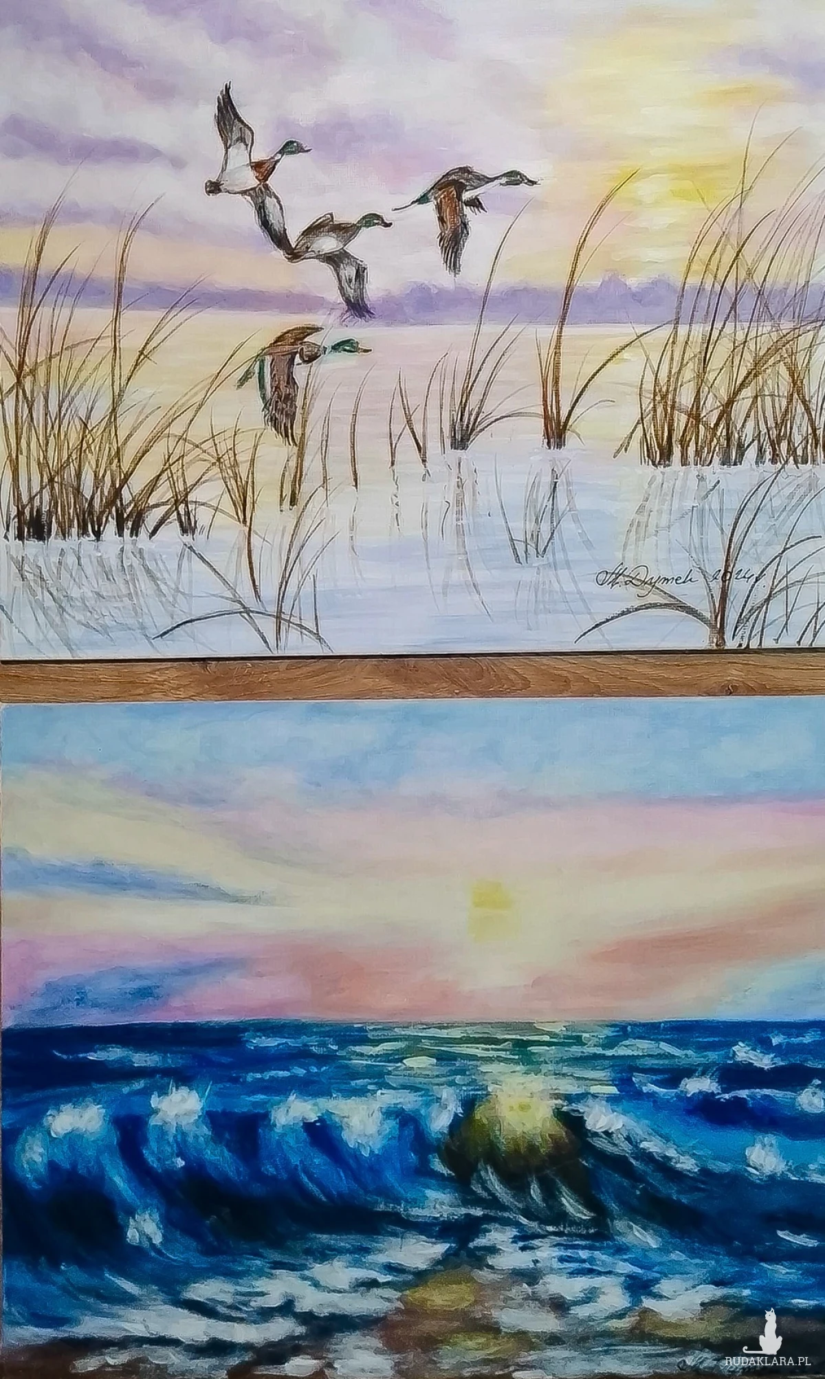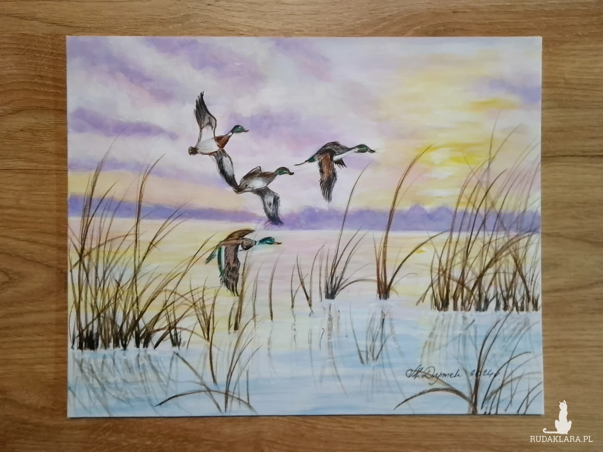-Tematyka: Dzikie kaczki zrywające się do lotu i morskie fale rozbijające się w świetle zachodzącego słońca