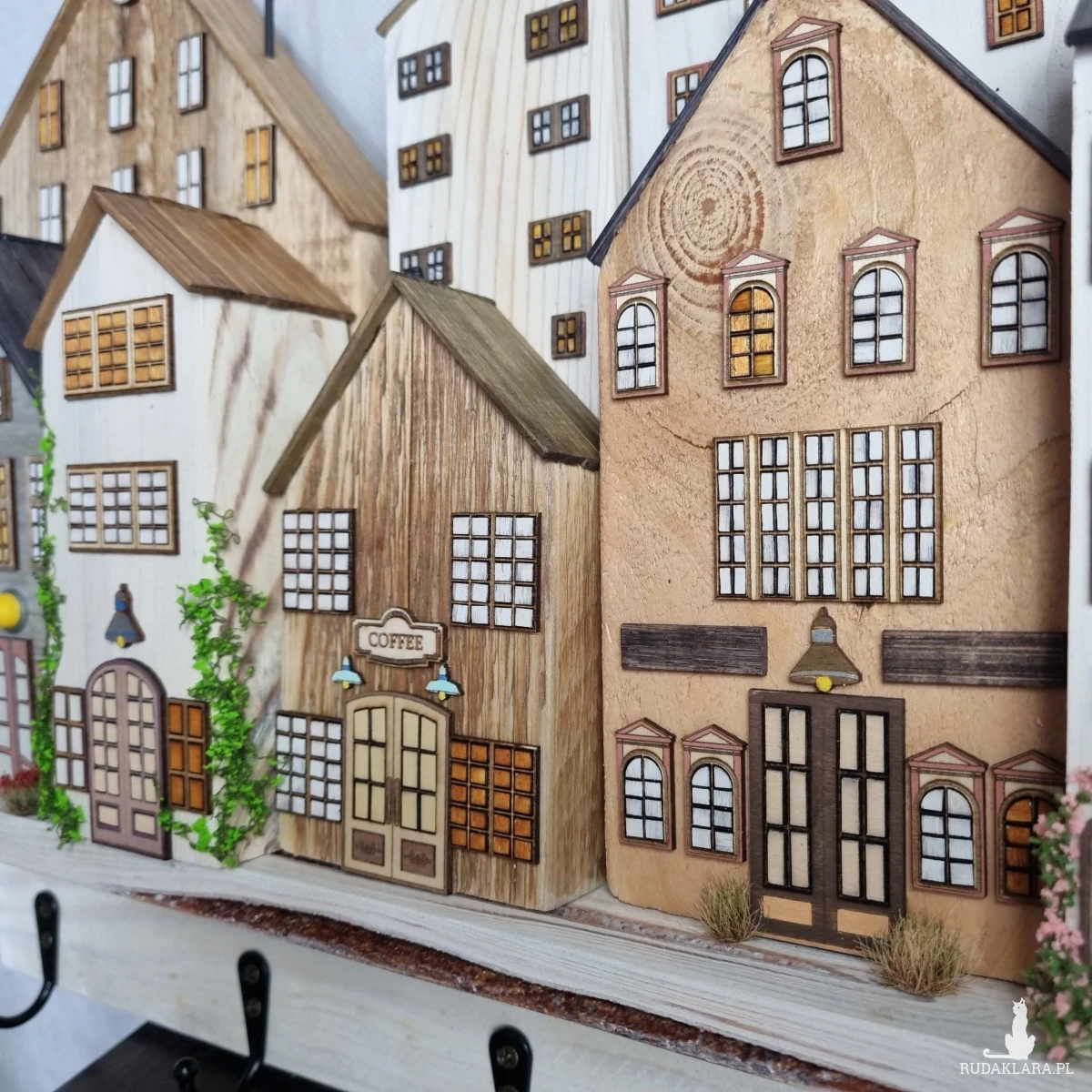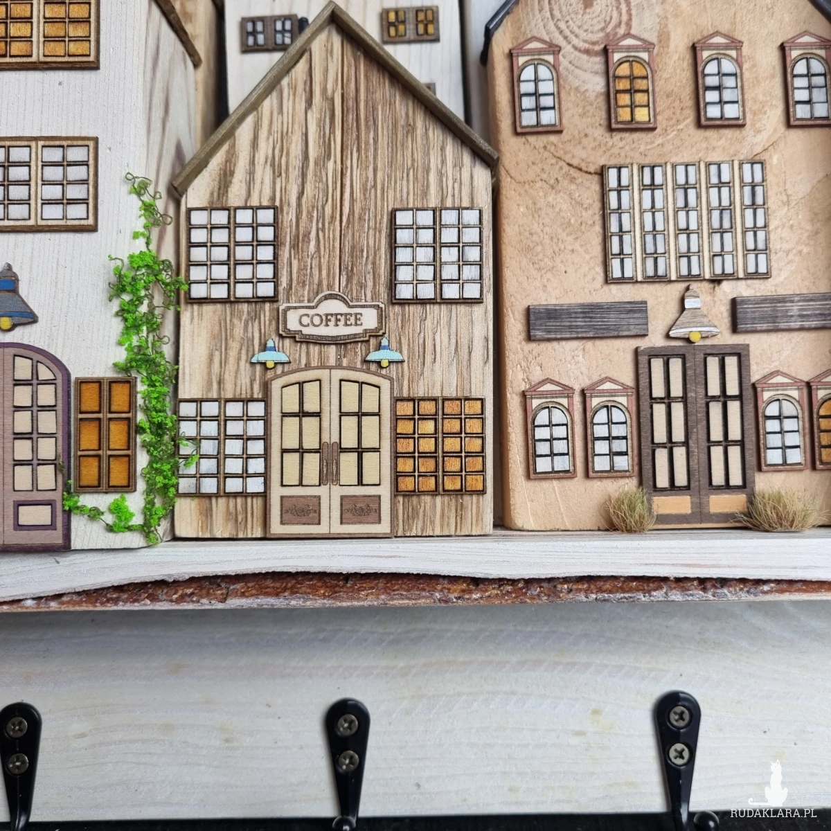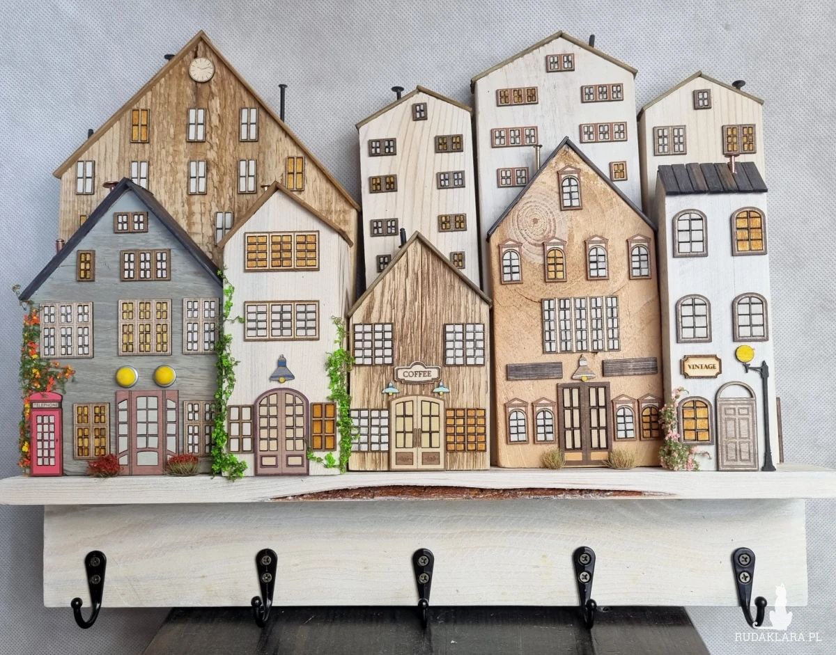 Drewniane domki handmade, mogące służyć jako wieszak na klucze (3), ręczniki inne drobiazgi. Domki wykonane desek ze starych palet z odzysku. Drewno bejcowane, woskowane, malowane w różnych odcieniach - ładnie podkreślające starość drewna - malowane bezbarwną farbą akrylową. Drewniane, wycinane okna i drzwi, również inne detale. Długość 43 cm, wysokość 33 cm, grubość 6,5 cm . Całość do zawieszenia na ścianie na 2 hakach. (23)