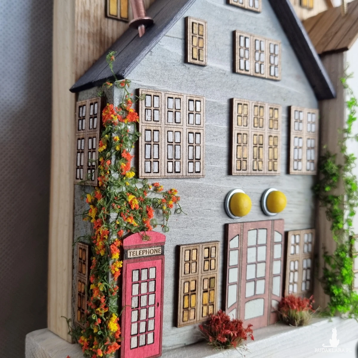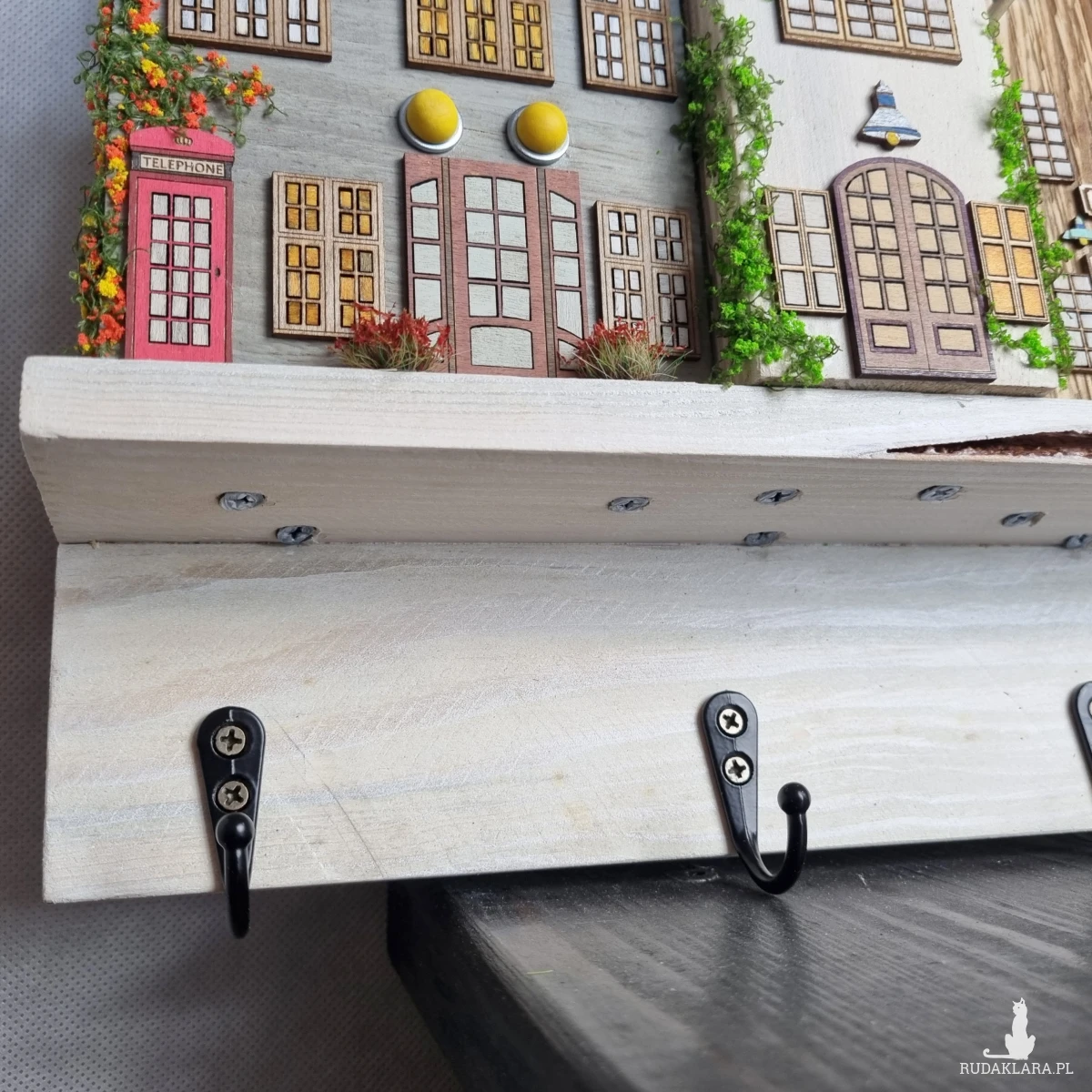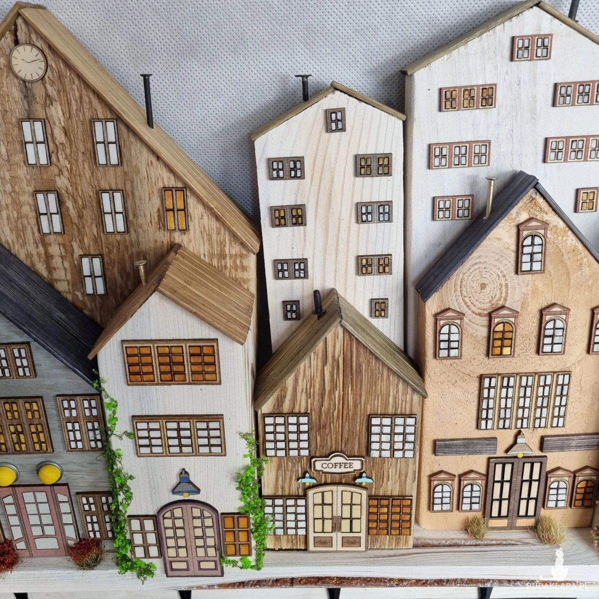 Drewniane domki handmade, mogące służyć jako wieszak na klucze (3), ręczniki inne drobiazgi. Domki wykonane desek ze starych palet z odzysku. Drewno bejcowane, woskowane, malowane w różnych odcieniach - ładnie podkreślające starość drewna - malowane bezbarwną farbą akrylową. Drewniane, wycinane okna i drzwi, również inne detale. Długość 43 cm, wysokość 33 cm, grubość 6,5 cm . Całość do zawieszenia na ścianie na 2 hakach. (23)