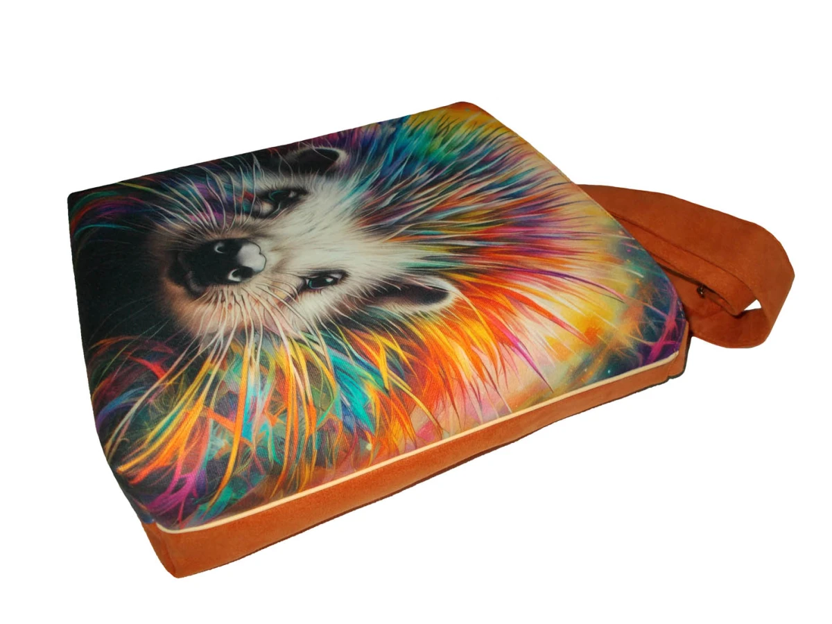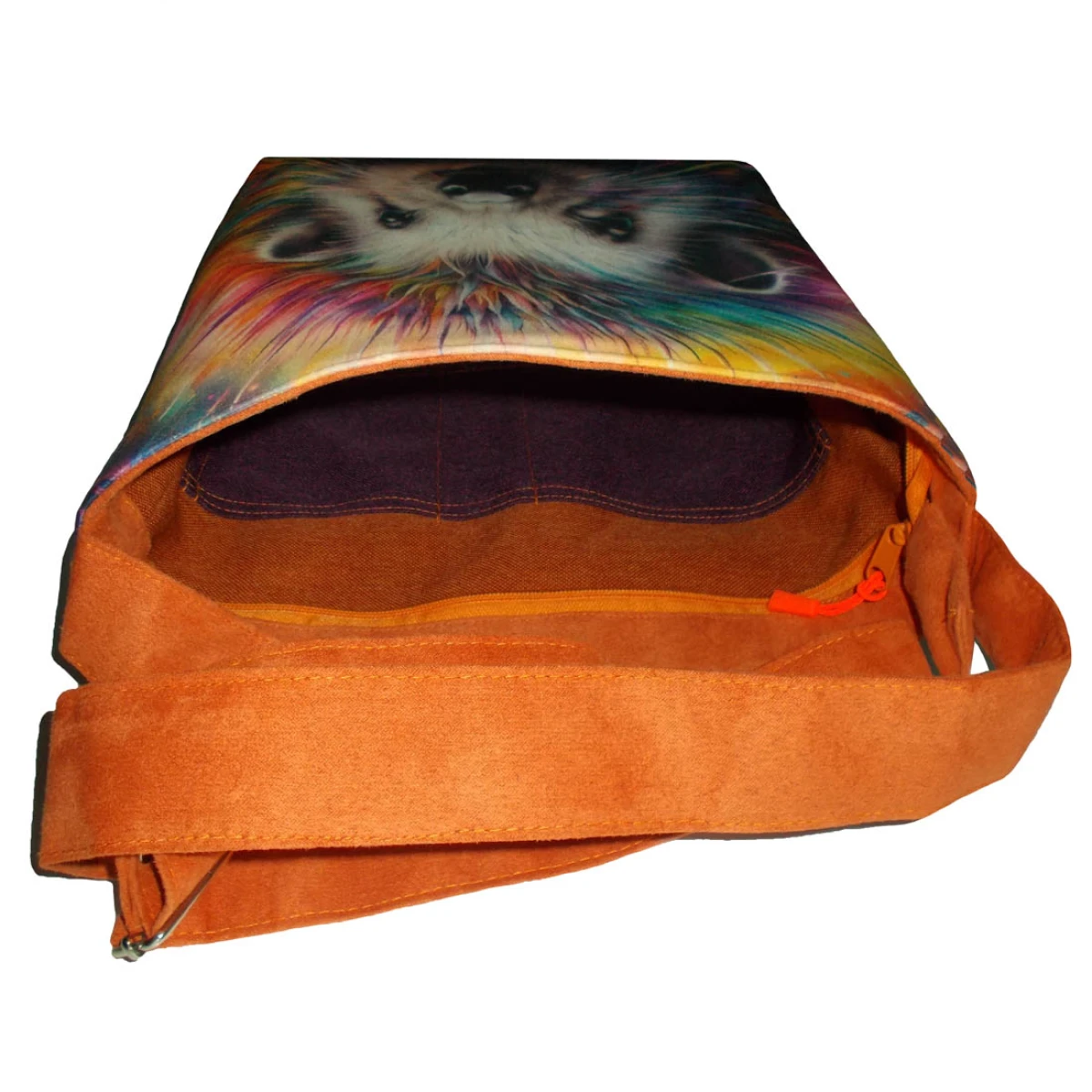 Autorska torba z usztywnionego eko zamszu, zapinana na zamek. Przód z weluru tapicerskiego. Pasek regulowany. Tył w kolorze paska (pomarańczowy) Torba trzyma fason. Wewnątrz dwie kieszenie - jedna na zamek, druga z miejscem na telefon i coś jeszcze. W szwach wypustka. Denko poszerzone. szerokość 32cm wysokość 30cm plus denko 8cm