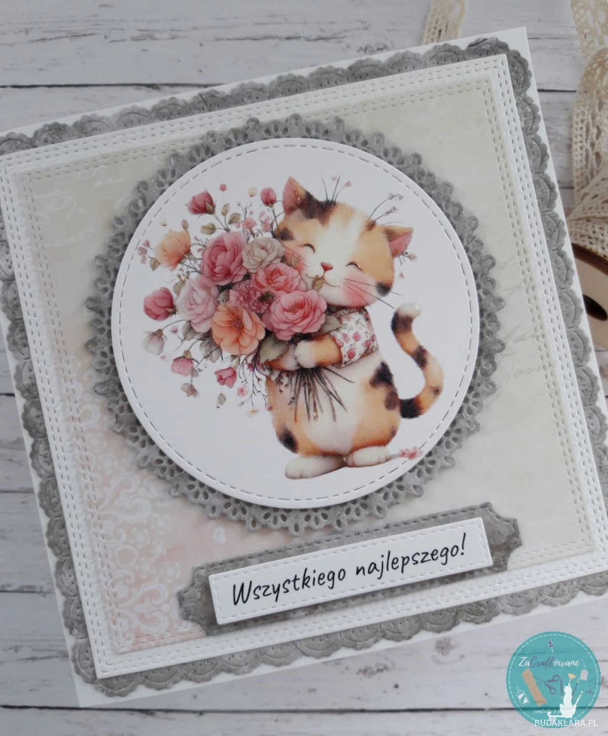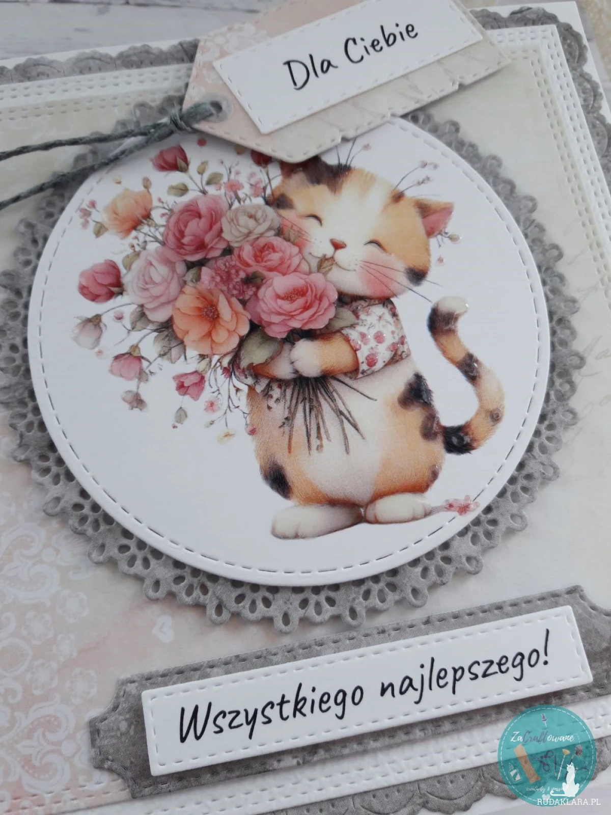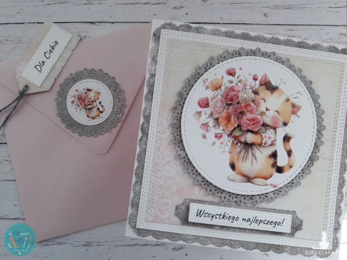 Ręcznie robiona kartka urodzinowa dla kociary wykonana metodą scrapbookingu z wykorzystaniem profesjonalnych materiałów i z dbałością o każdy szczegół.