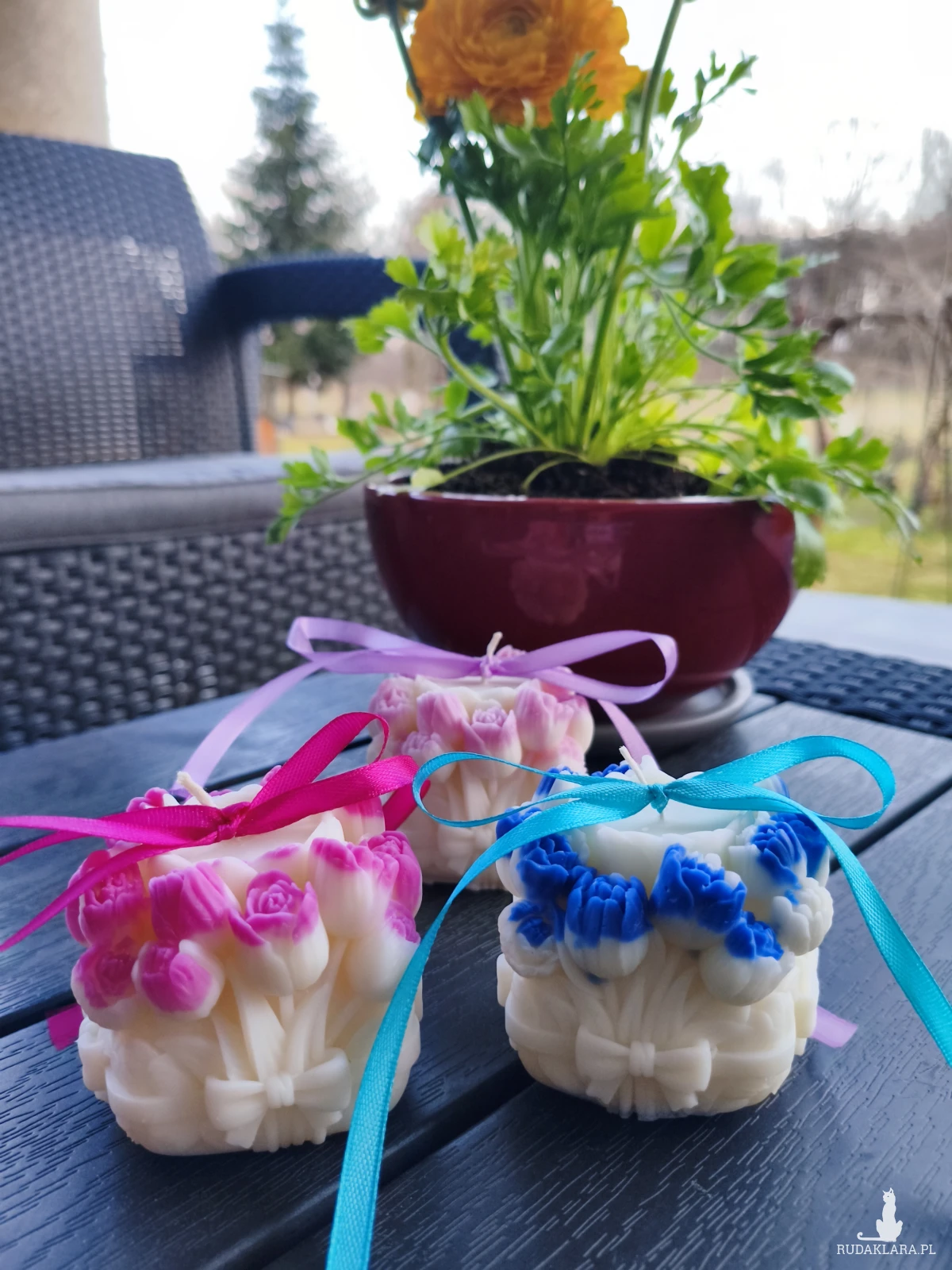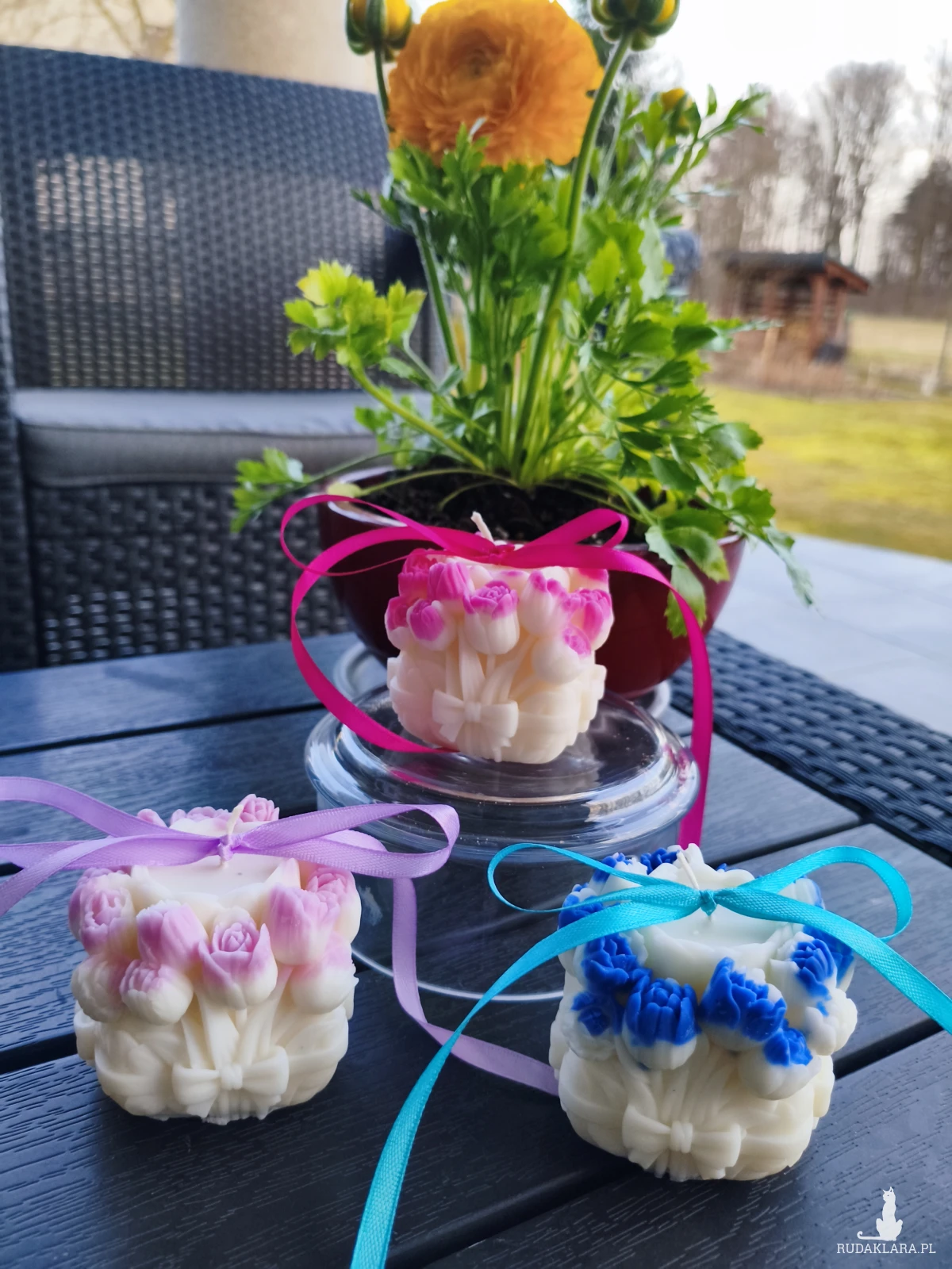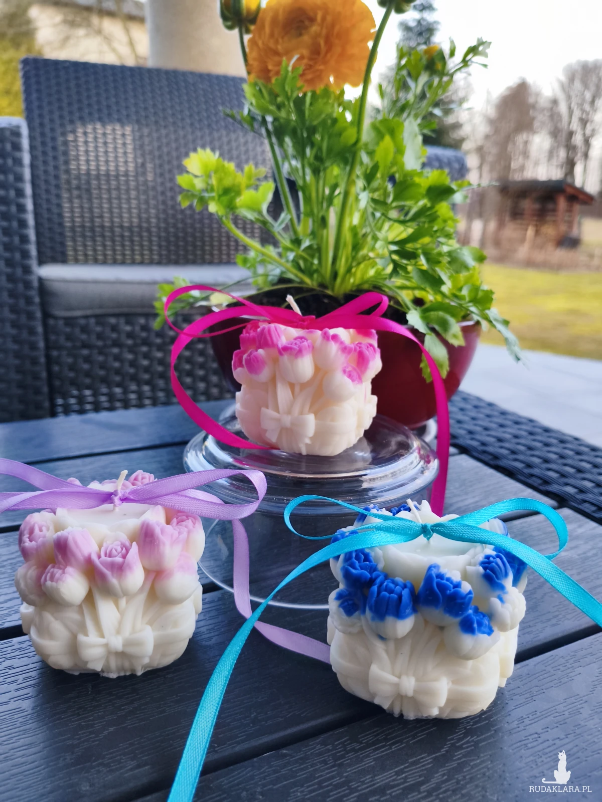 Sprzedam ręcznie wykonaną świecę z wosku sojowego w odcieniu koloru naturalnego z kwiatami w kolorze niebieskim, fioletowym bądź różowym istnieje możliwość wykonania w dowolnej kolorystyce. Świeca została wykonana z dodatkiem aromatu róży z nutką maliny. Waga świecy wynosi ok 150 g wysokość 7 cm i średnica 7 cm. .