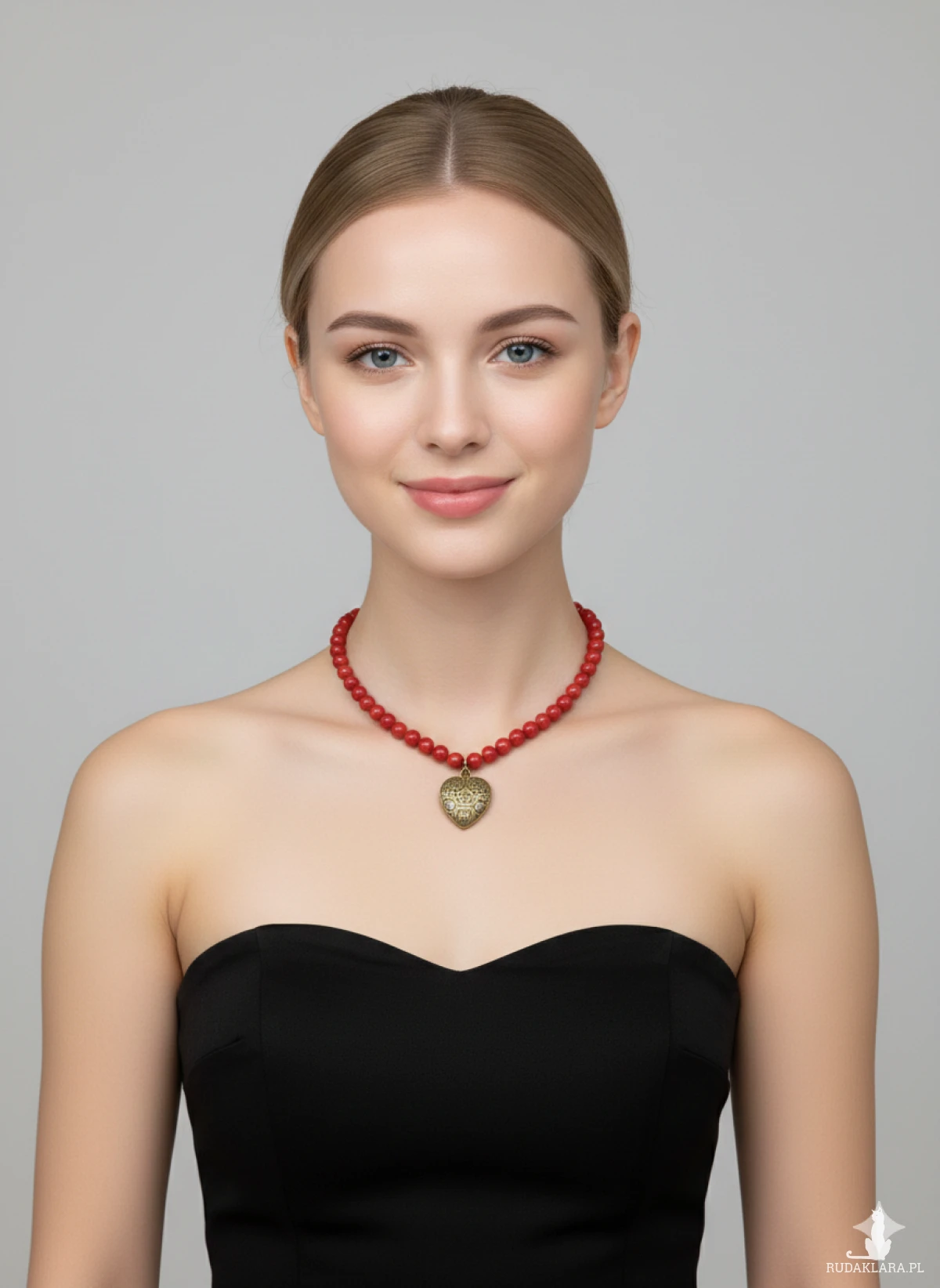Wykonany z intensywnie czerwonych, lśniących paciorków, przyciąga wzrok i