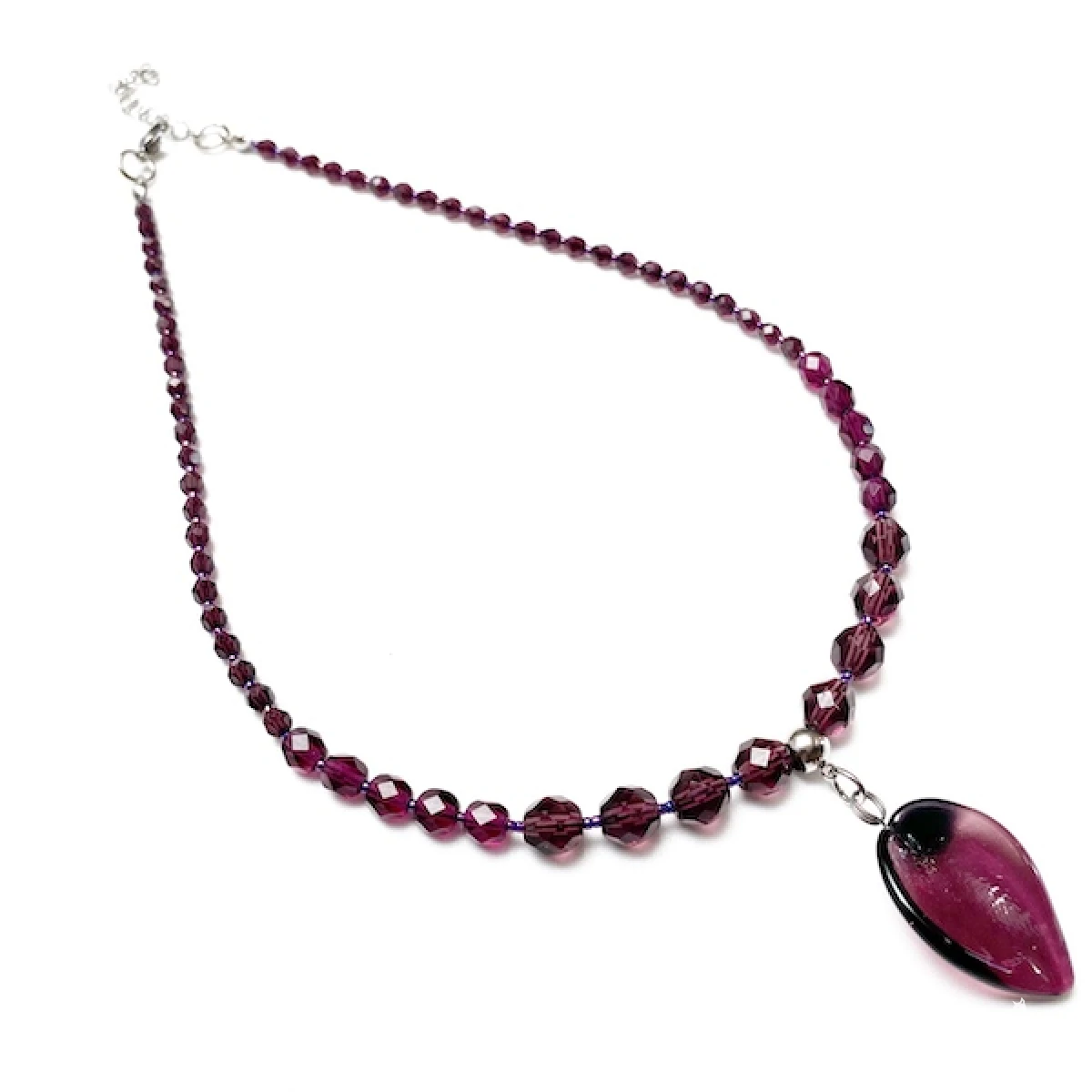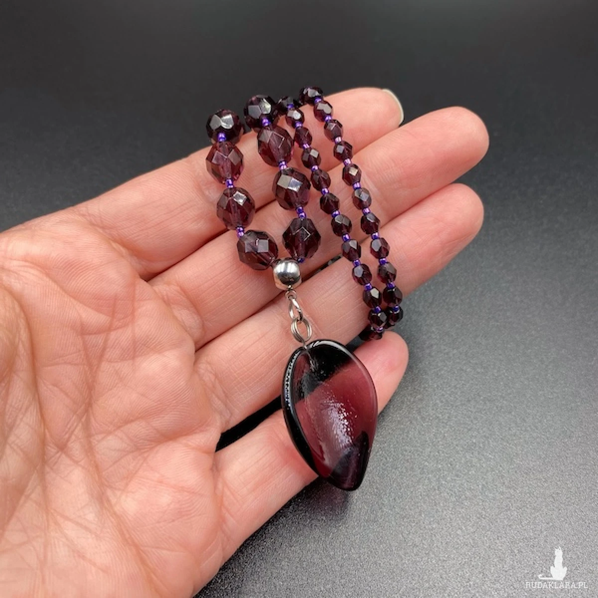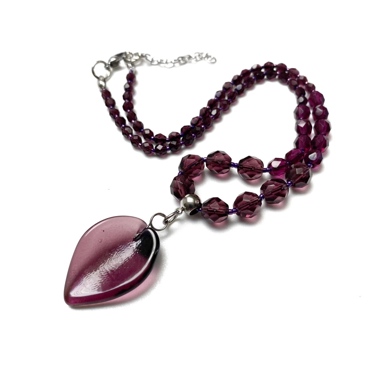 Krótki naszyjnik został wykonany ręcznie z czeskich, szklanych, szlifowanych koralików w kolorze fioletowym. Do naszyjnika doczepiony jest fioletowy, szklany liść (3 cm).