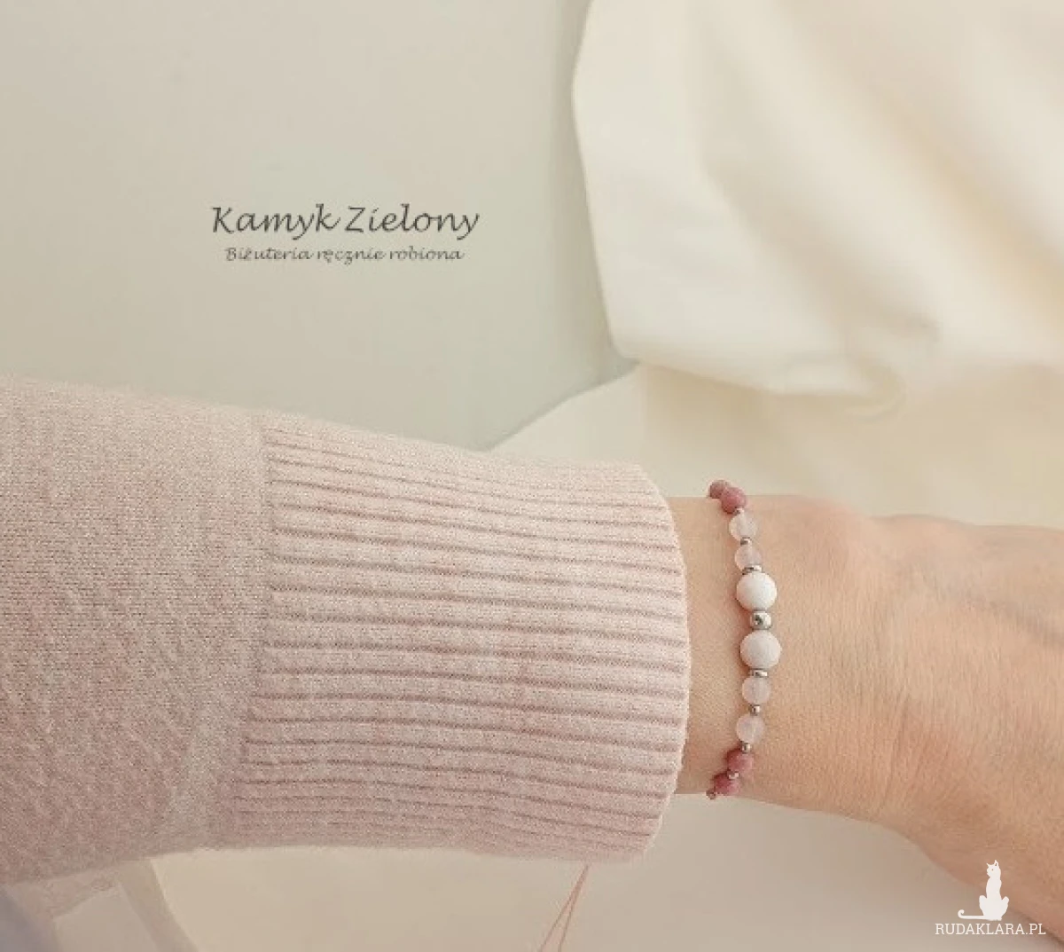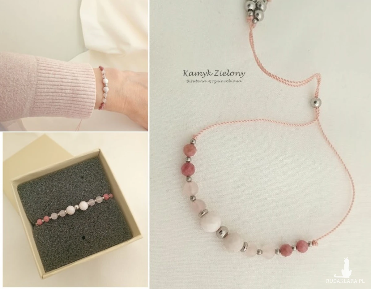 Subtelna bransoletka z kamieni naturalnych - większych, fasetowanych kuleczek opalu peruwiańskiego, kwarcu różowego oraz fasetowanych kulek rodonitu. Dodatkowo, jako przekładki, zastosowano w niej elementy ze stali chirurgicznej.