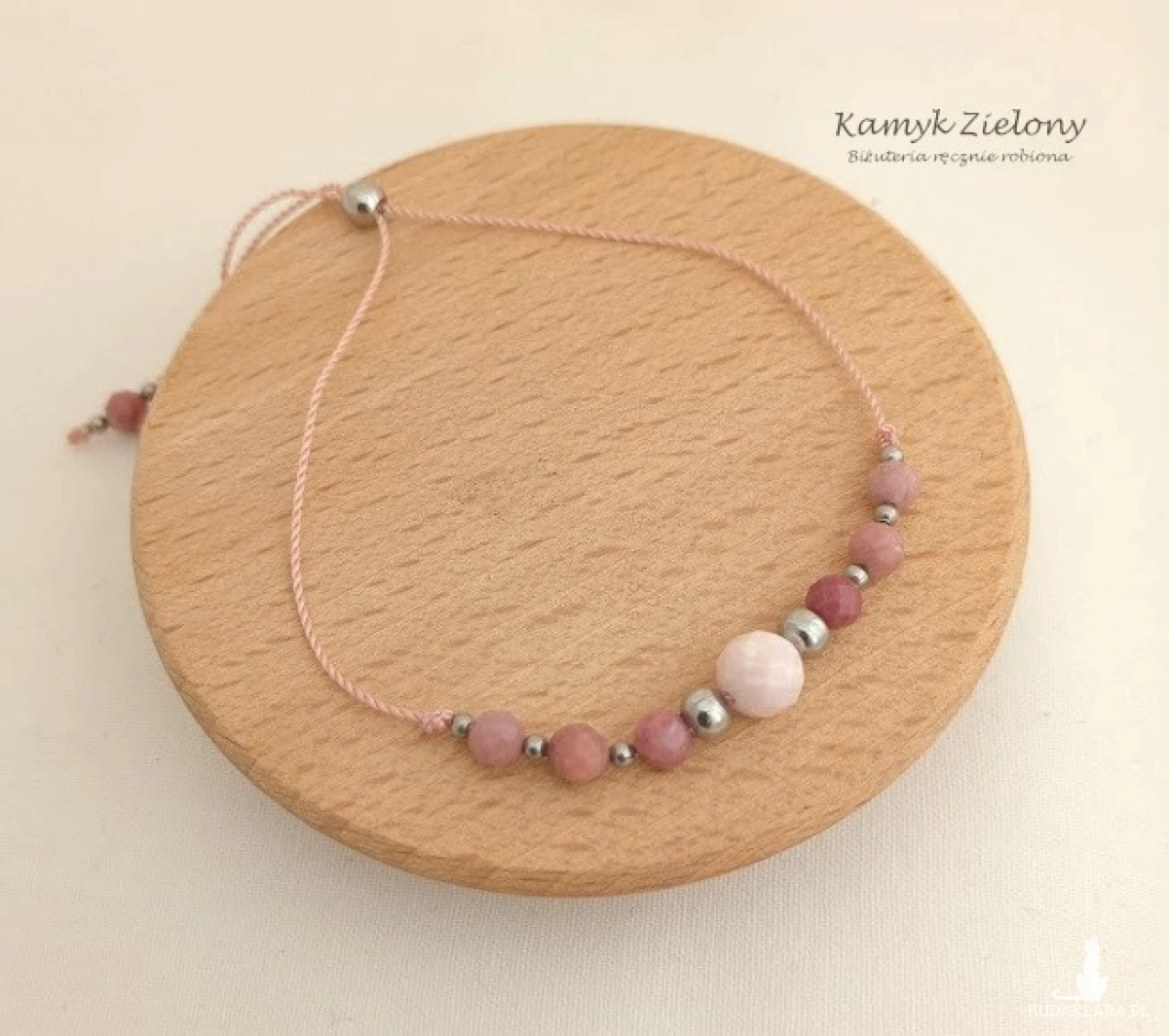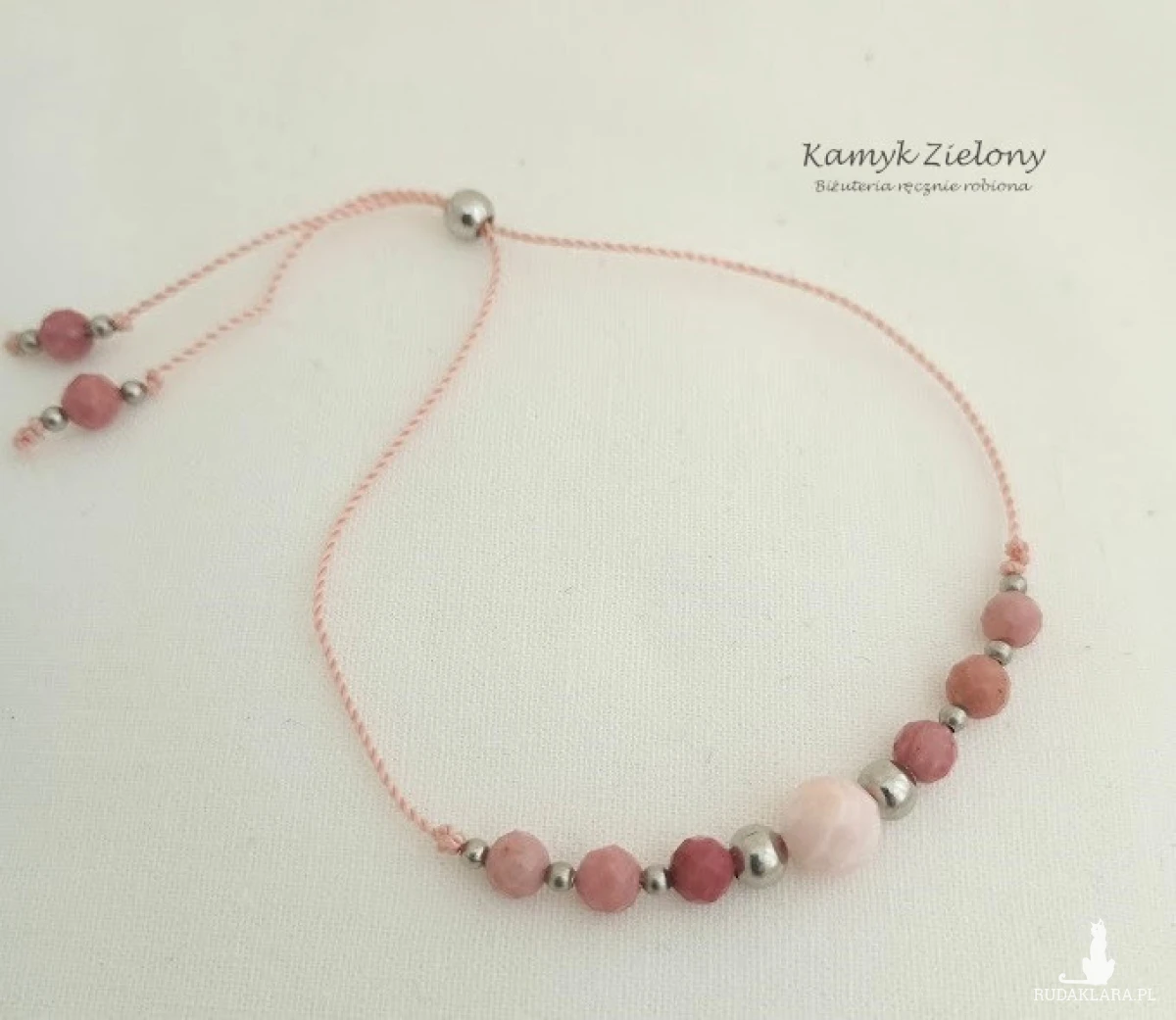 Minimalistyczna bransoletka z kamieni naturalnych - większej kulki opalu peruwiańskiego w jasnoróżowym odcieniu, 4-milimetrowych kuleczek różowego rodonitu oraz elementów ze stali chirurgicznej.