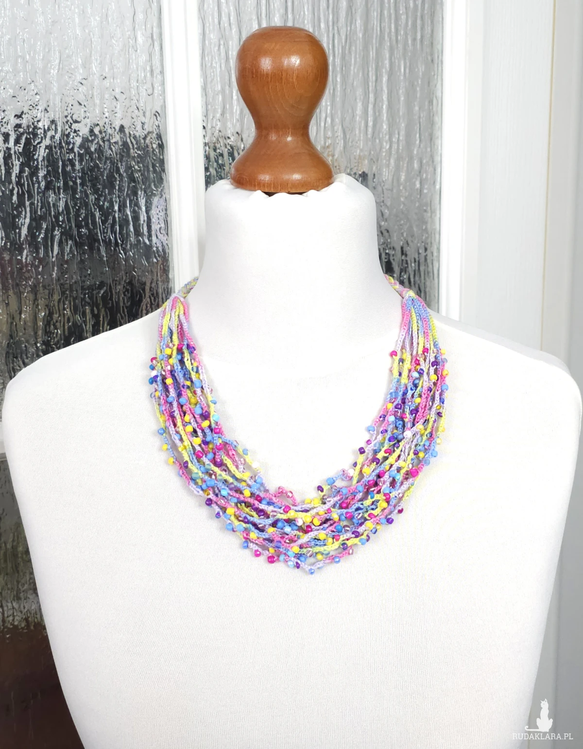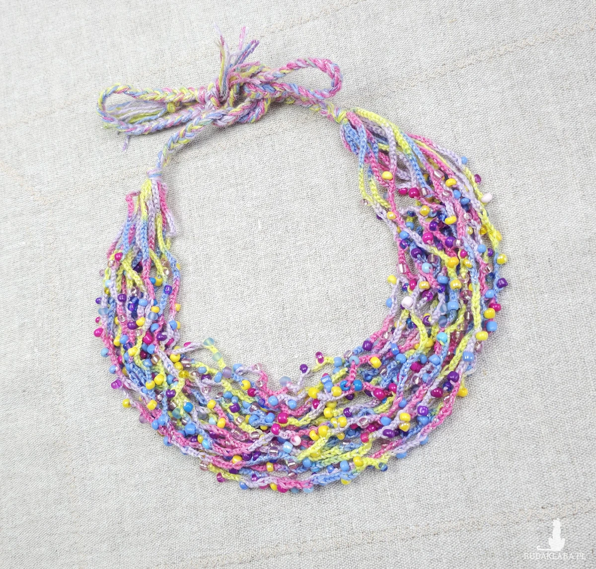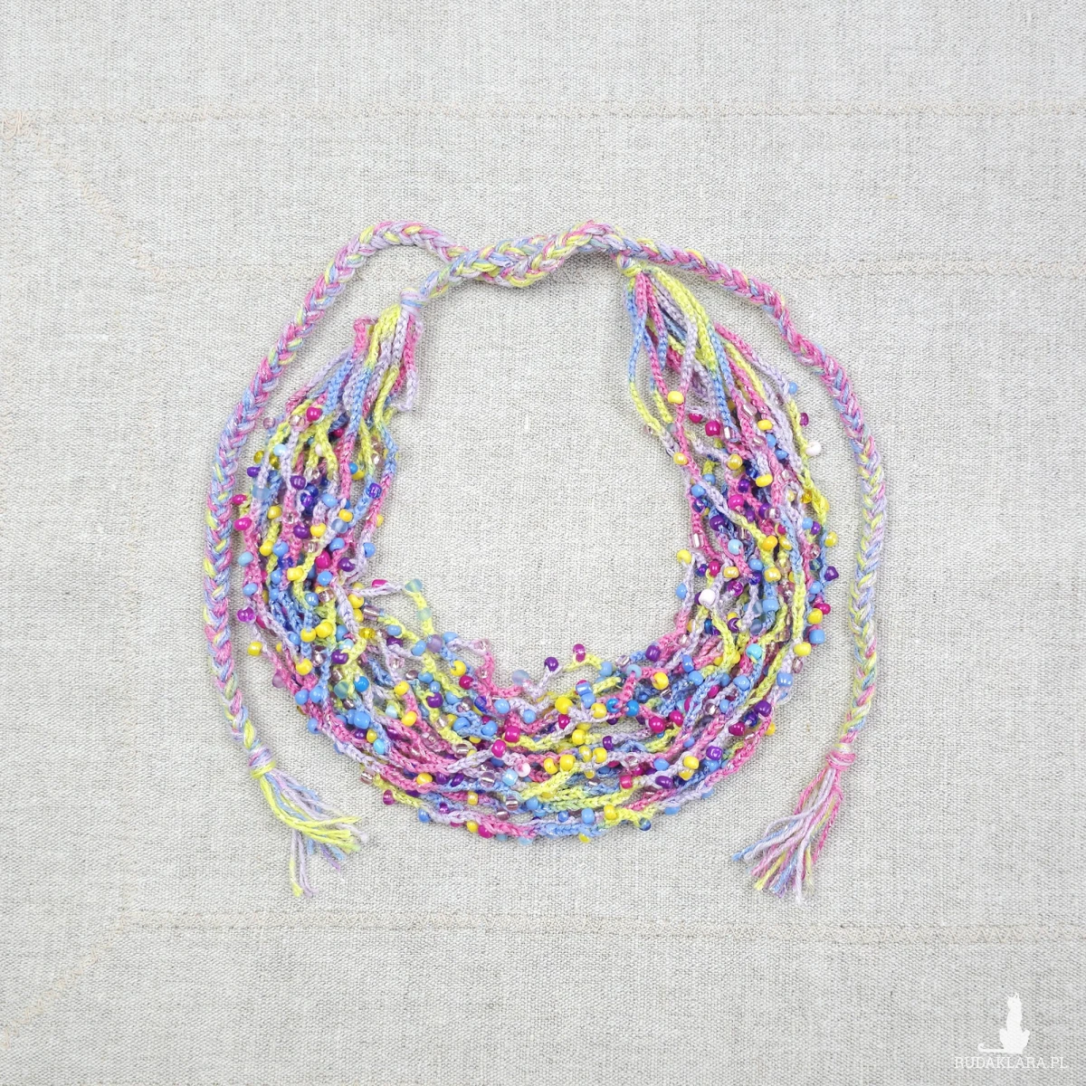 Lekki, wielowarstwowy naszyjnik wykonany z drobnych, wielobarwnych koralików szklanych wplecionych w kolorowe nici. Pastelowa kolorystyka z przewagą błękitu, różu i żółci nadaje mu świeży charakter. Biżuteria jest miękka i plastyczna, wykończona ozdobnymi warkoczami umożliwiającymi regulację długości poprzez wiązanie. Idealny dodatek do casualowych i festiwalowych stylizacji.