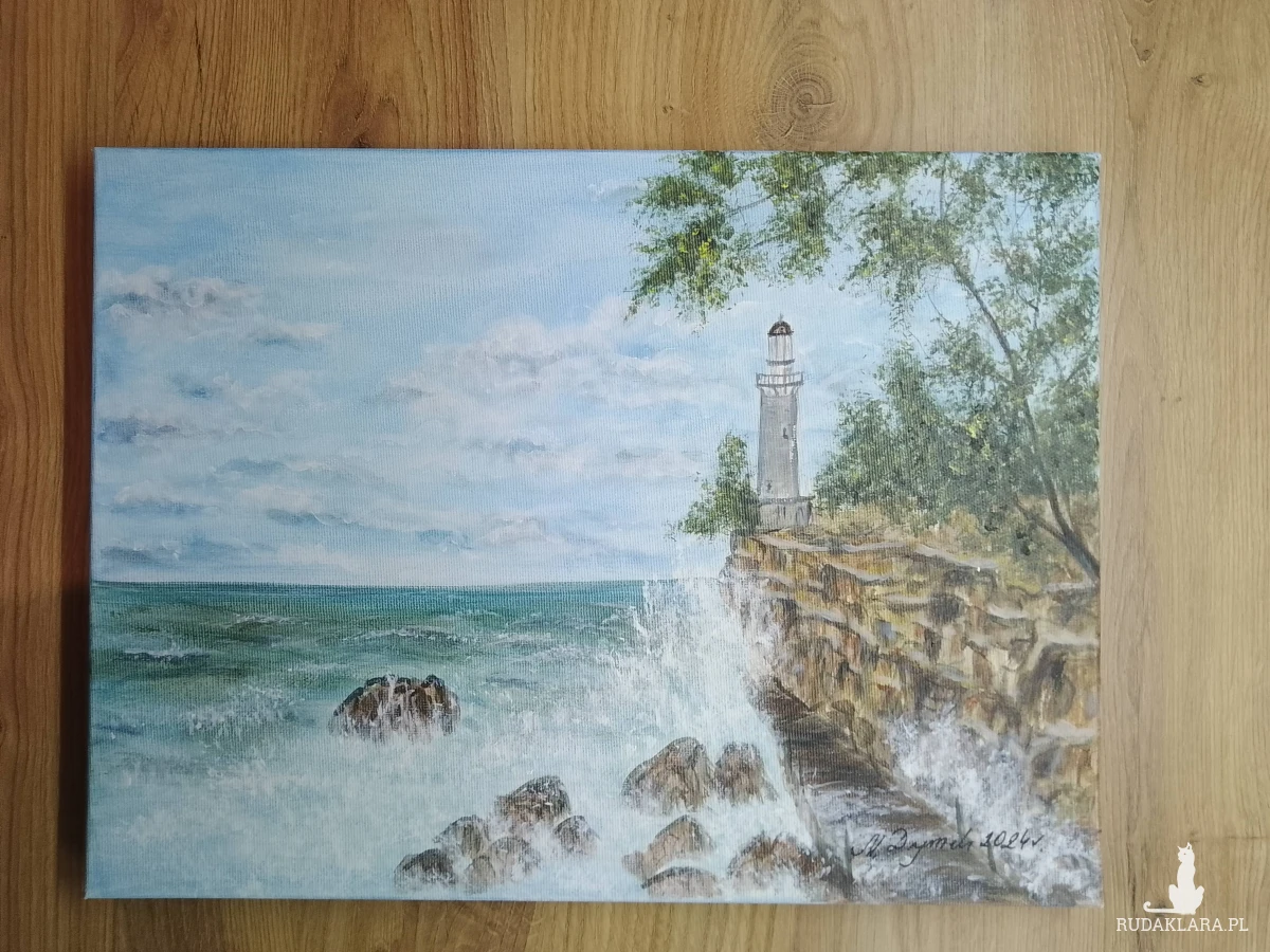 - Tematyka: Pejzaż morski, latarnia morska na klifie