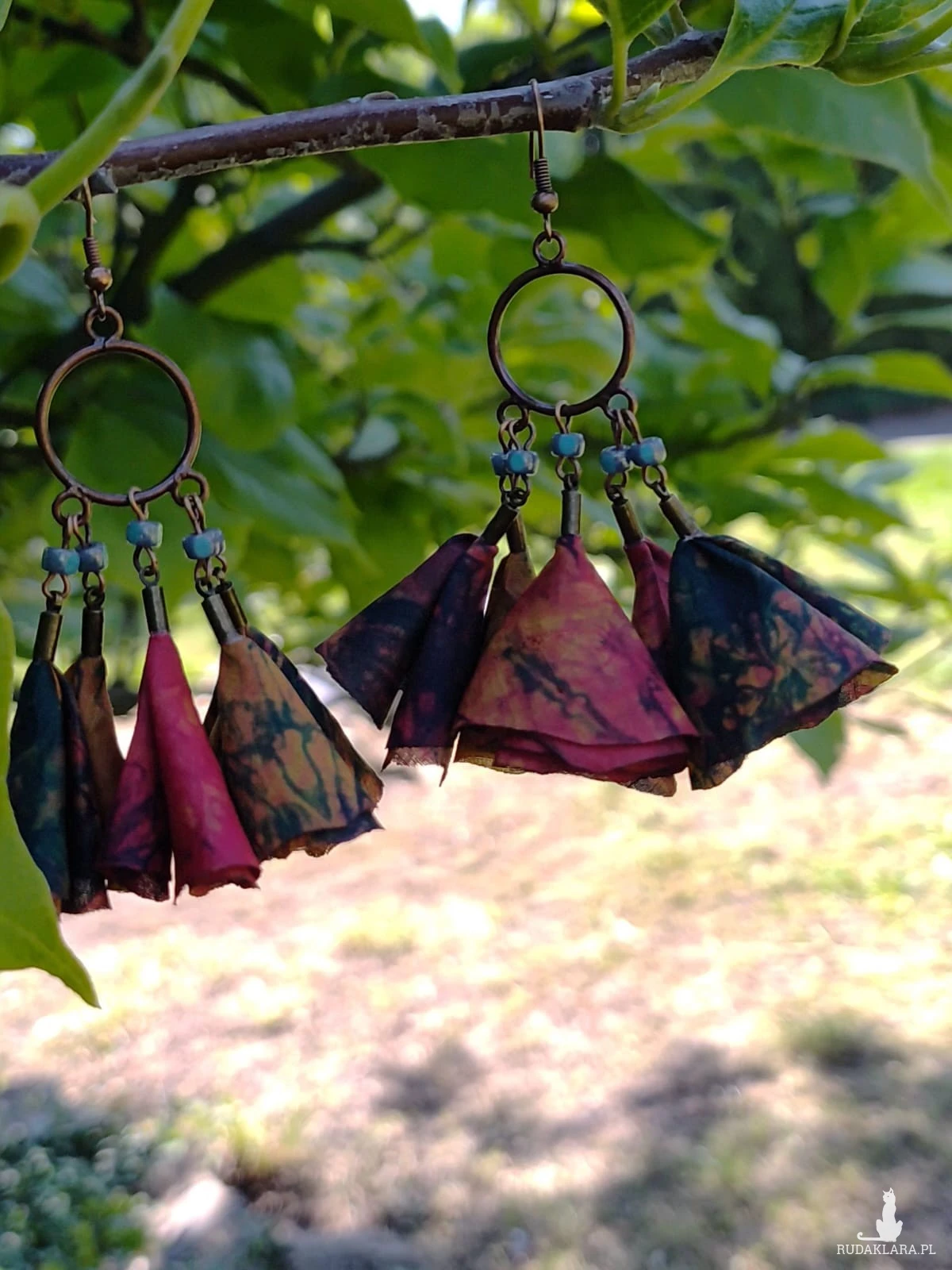 Każdy chwost wykonany jest z fragmentów tkaniny barwionej techniką batiku w odcieniach głębokiej czerwieni, zieleni i pomarańczu. Dzięki temu każdy kolczyk jest unikalny.