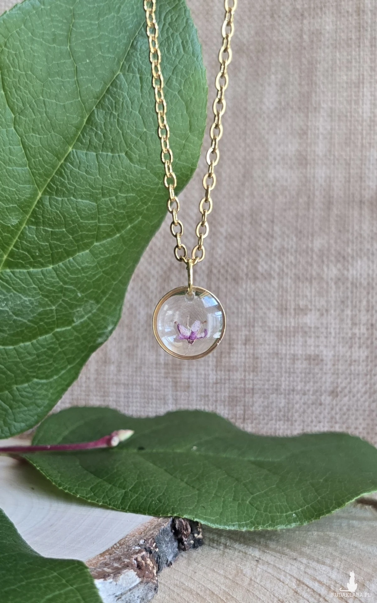 Oferuję Państwu unikalną biżuterię. Zawieszka jest wykonana z suszonych kwiatów i żywicy epoksydowej. Biżuteria jest wspaniałym i oryginalnym prezentem na lata.
