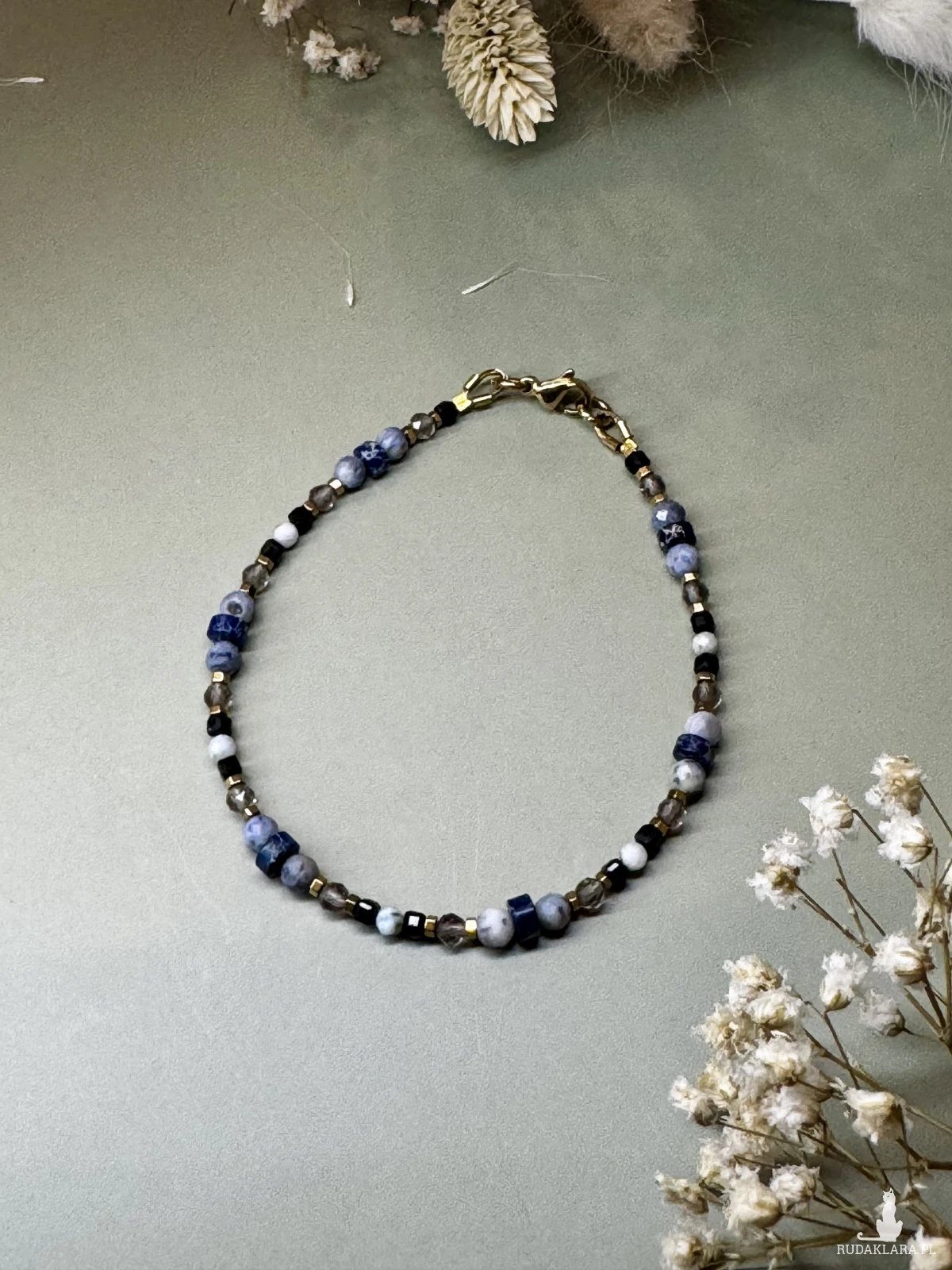 Delikatna bransoletka z drobnych 3-4 milimetrowych kamieni larimaru, niebieskiego korala, jaspisu, turmalinu czarnego oraz kwarcu dymnego. Całość wykończyłam hematytem i zapięciem ze stali chirurgicznej w złotym kolorze.