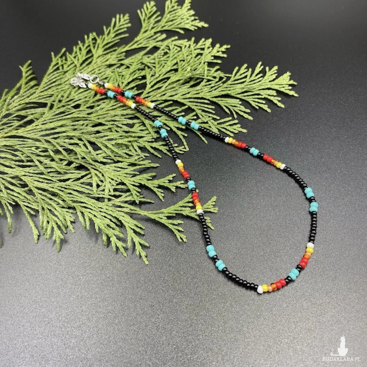 Krótki naszyjnik został wykonany ręcznie ze szklanych koralików w kolorze czerwonym, czarnym i turkusowym, pomarańczowym, żółtym i białym.