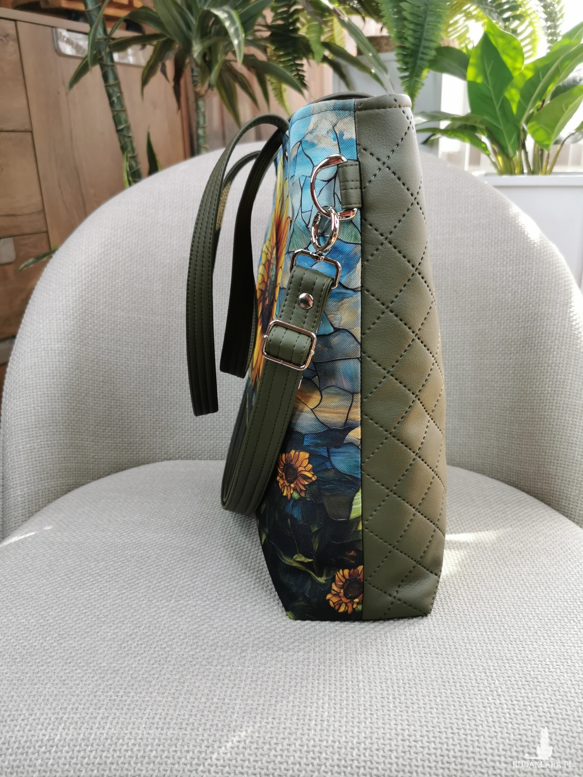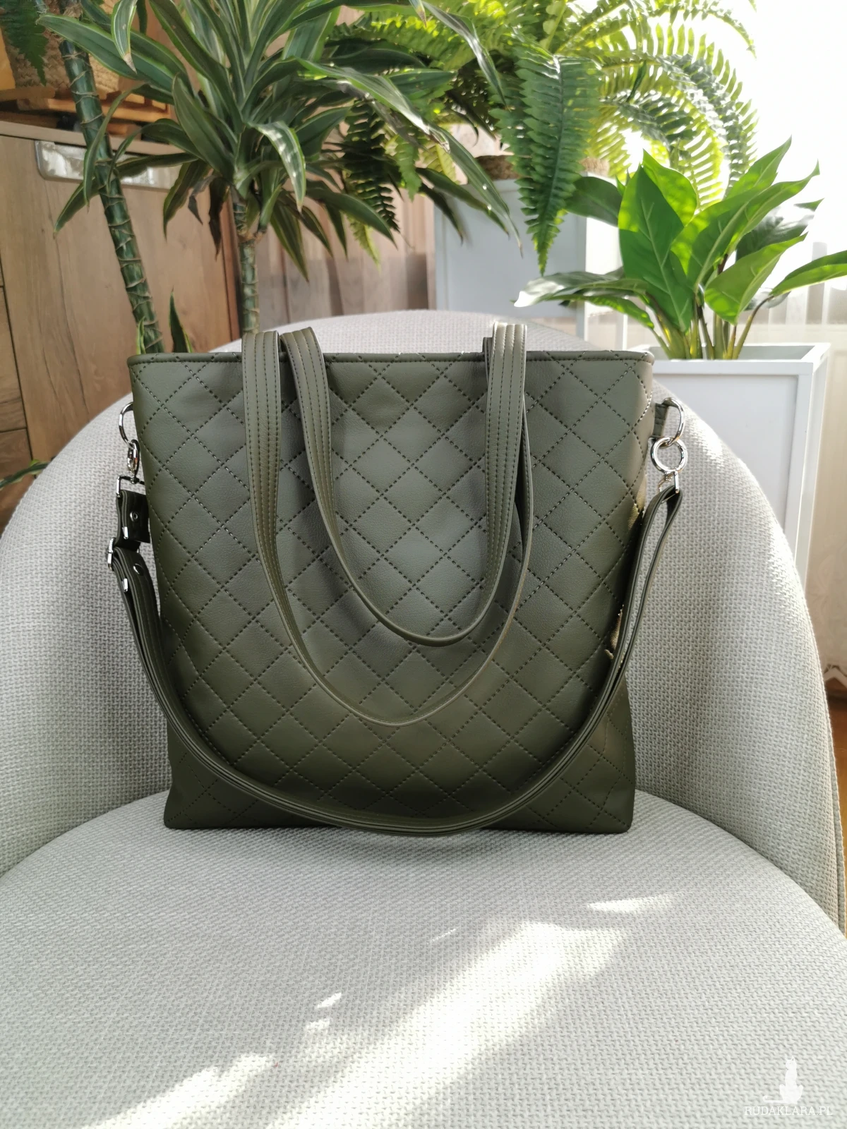 Wykonana z tkaniny o właściwościach wodoodpornych ( przód torebki ) , oraz zielonej (kolor khaki) pikowanej i gładkiej skóry ekologicznej ( tył torebki, uchwyty ) .