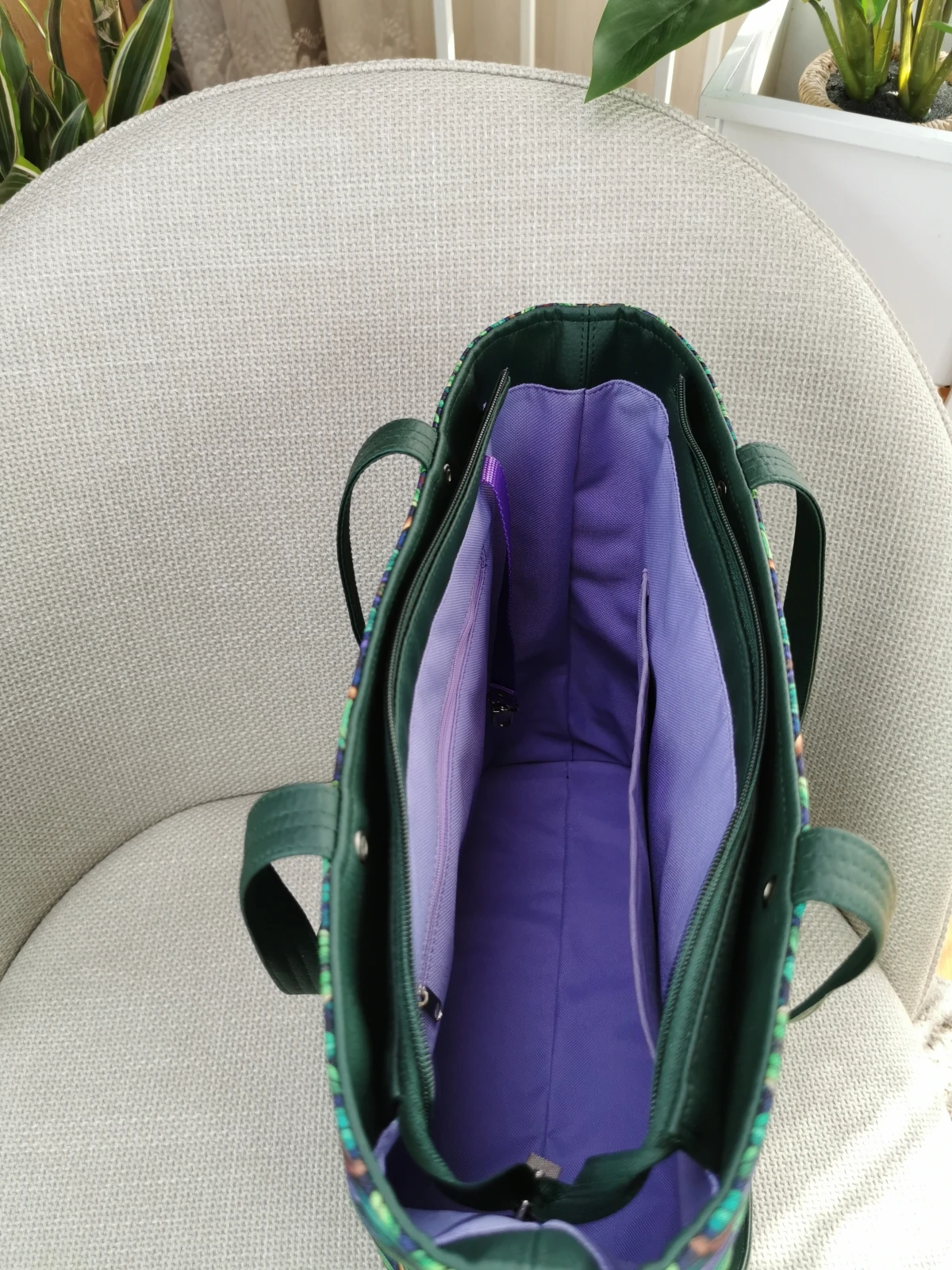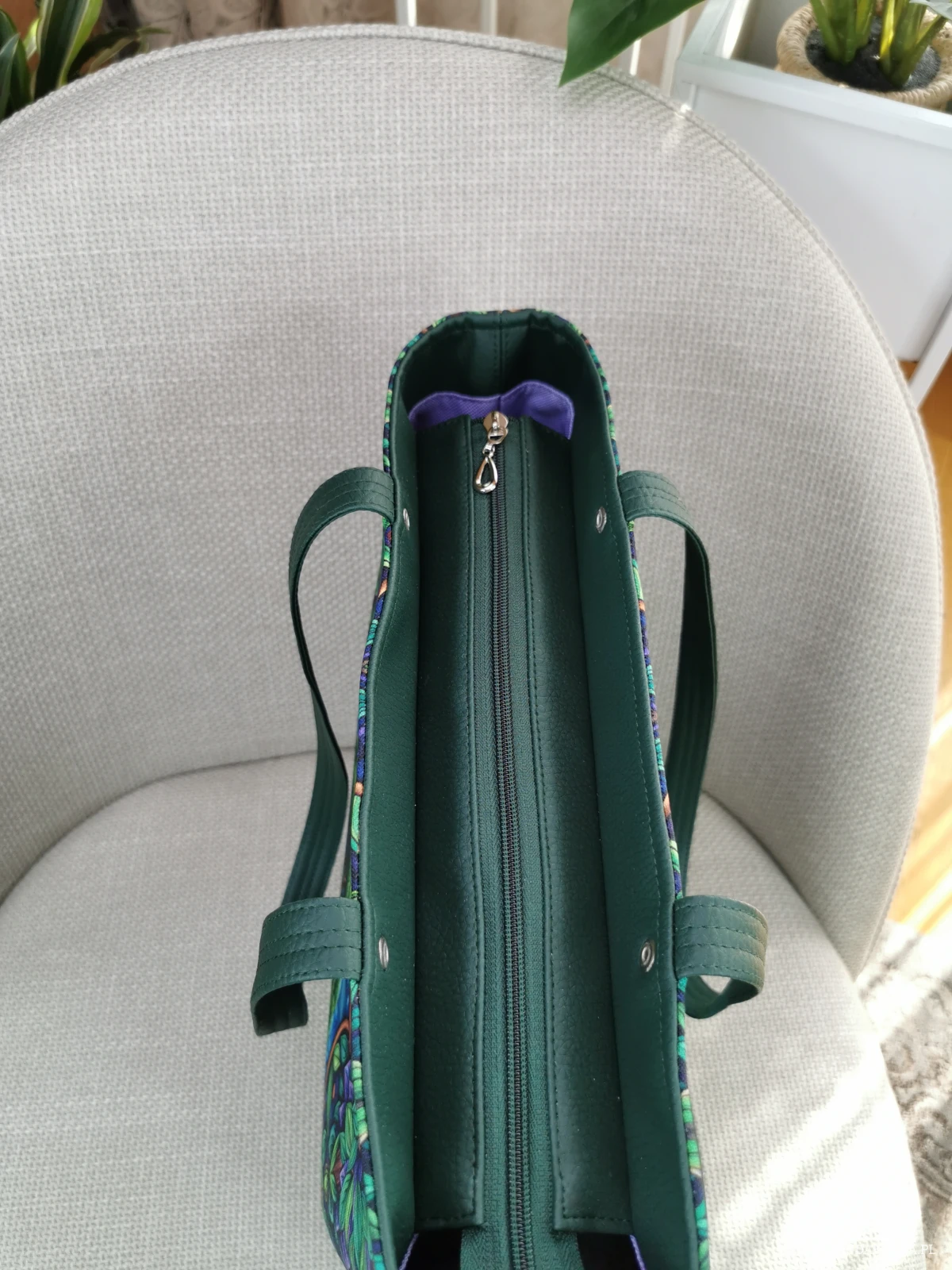 Wewnątrz gładka podszewka wodoodporna w kolorze jasnego fioletu, dwie pojemne kieszenie, na zamek i wsuwana.