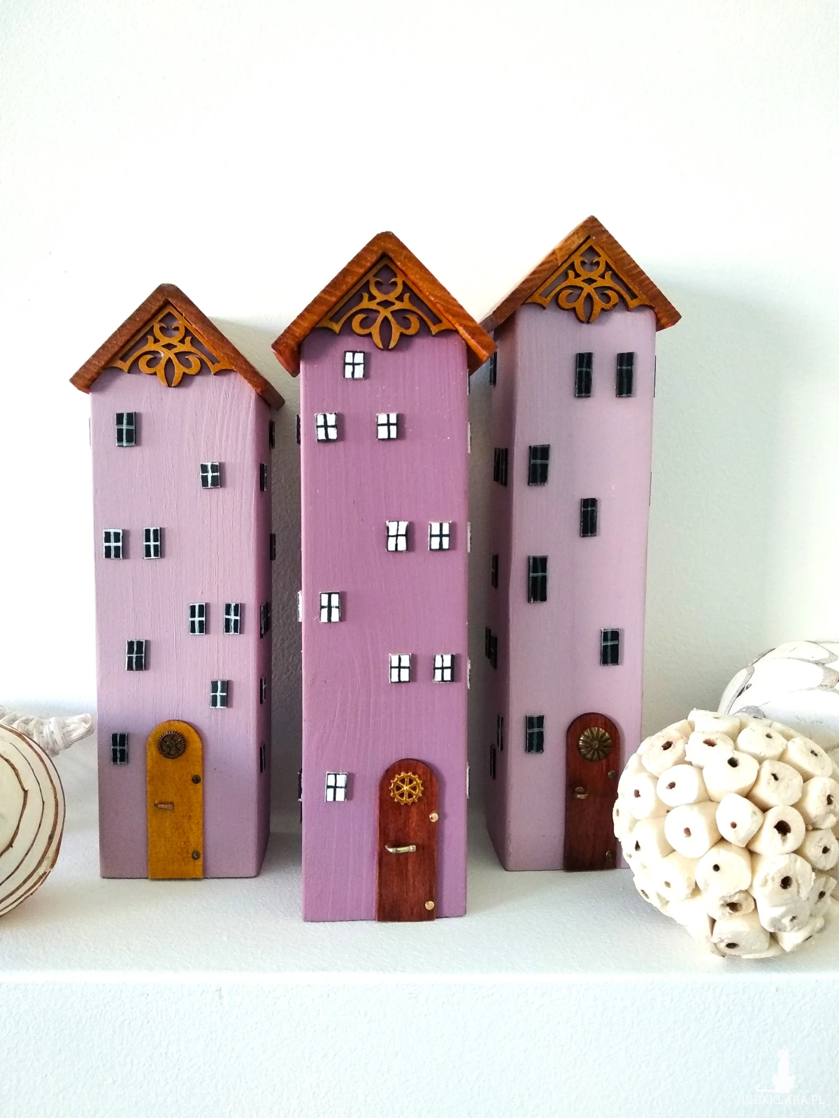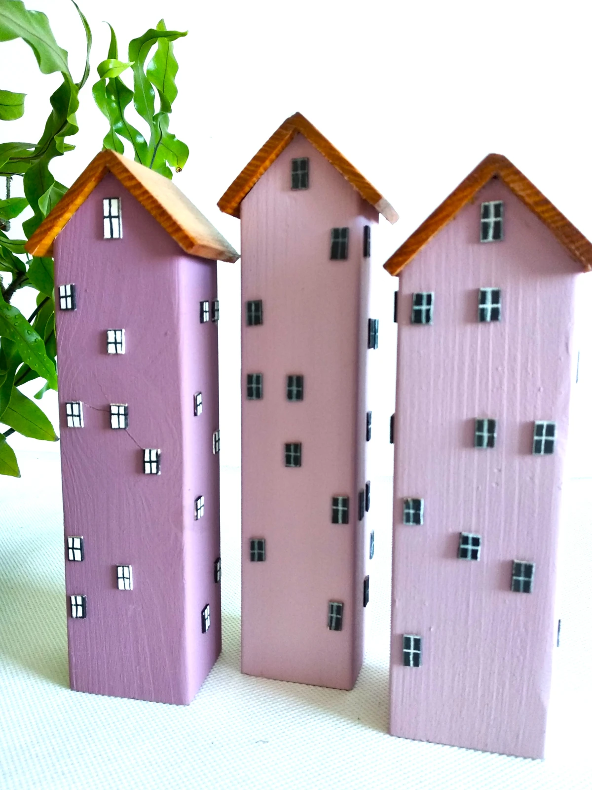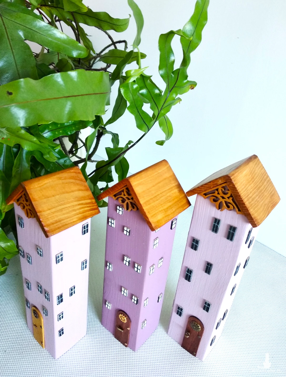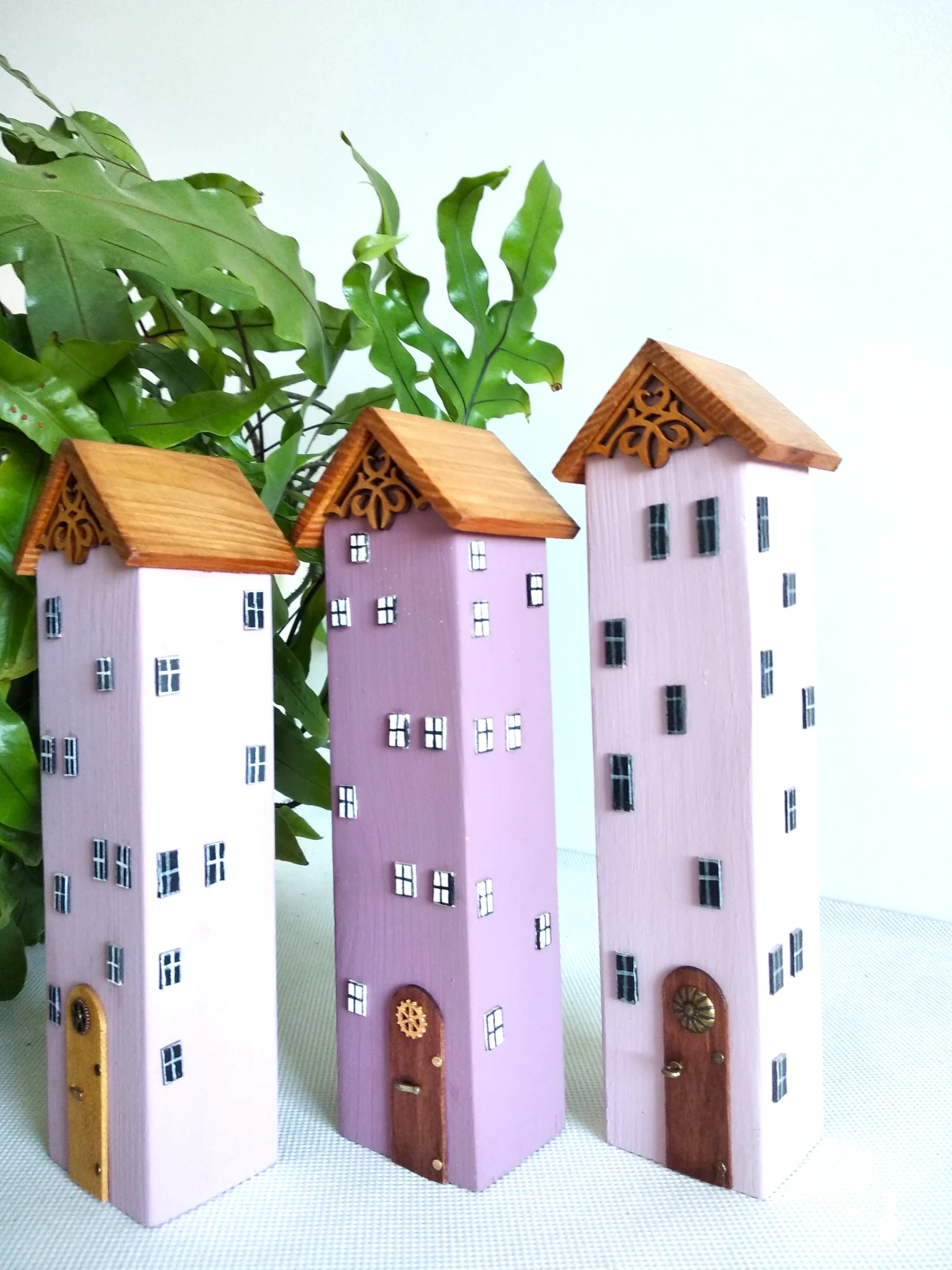 Te trzy ręcznie wykonane domki w delikatnych odcieniach fioletu to dekoracja, która wnosi do wnętrza subtelność, spokój i odrobinę bajkowej magii. Ich smukłe formy i pastelowe kolory przyciągają wzrok, a każdy szczegół, od okienek po zdobione drzwi i misternie ornamenty tworzy opowieść o wyjątkowym miejscu, gdzie czas płynie łagodniej.Domki wykonane są z drewna sosnowego , materiału, który łączy w sobie trwałość i naturalne piękno. Idealnie sprawdzą się jako prezent, dekoracja półki, parapetu lub element większej kolekcji.