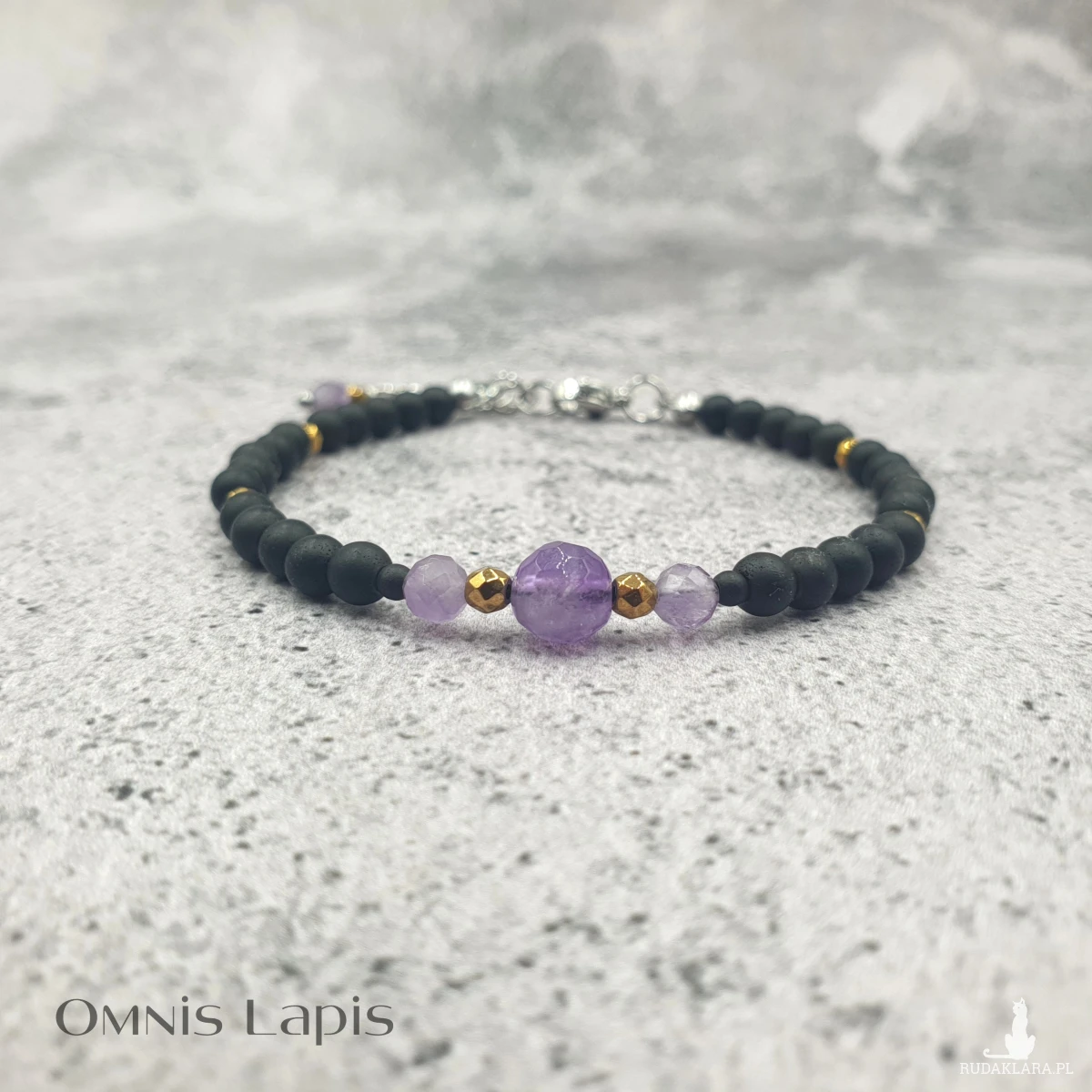Bransoletka w wersji mini. Wykonana z kul czarnego, matowego hematytu. Centrum bransoletki stanowią kule ametystu, przedzielone kulami złotego hematytu.