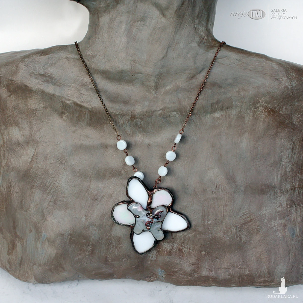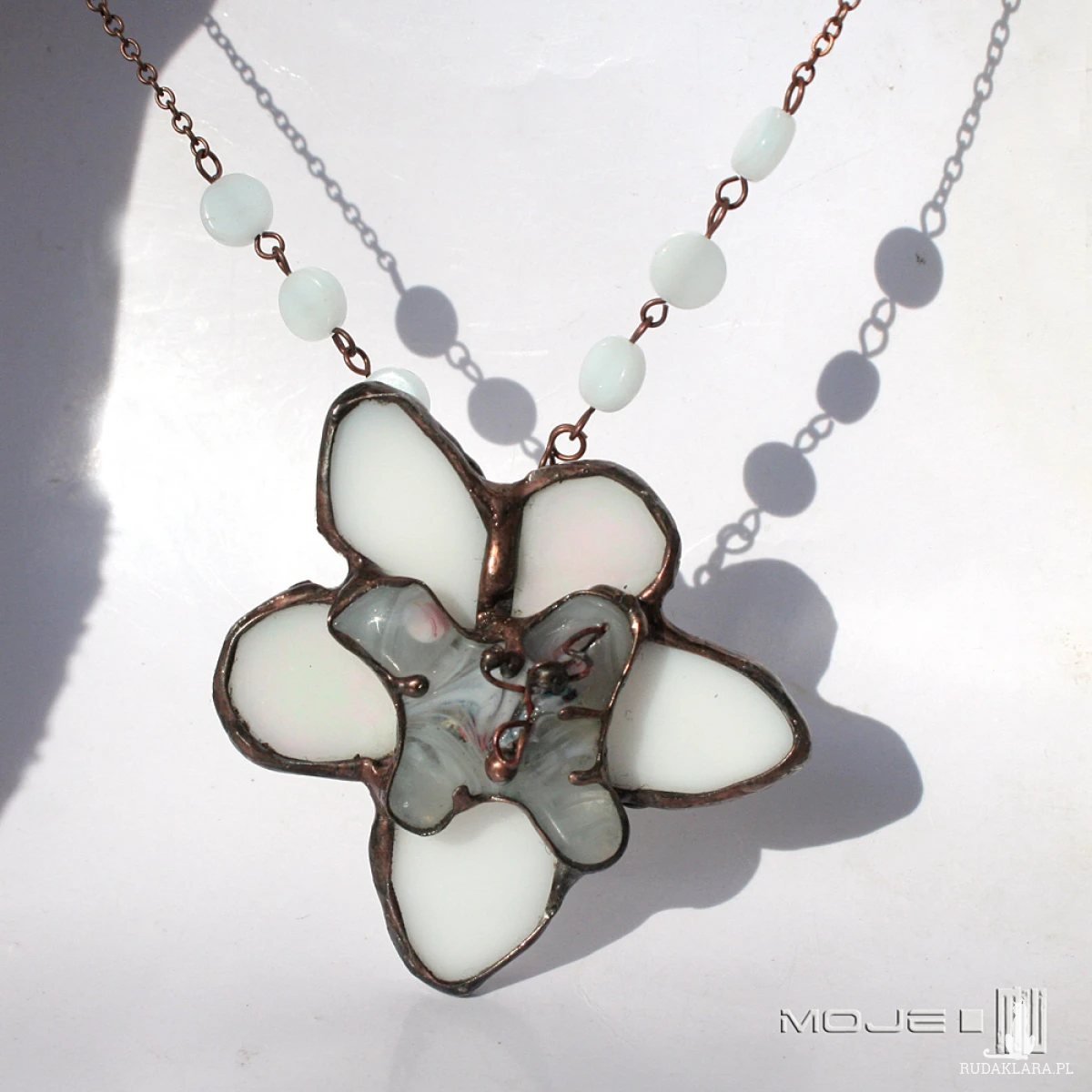 Zawieszony jest na łańcuszku w kolorze miedzianym i ozdobionym białymi szklanymi pastylkami.