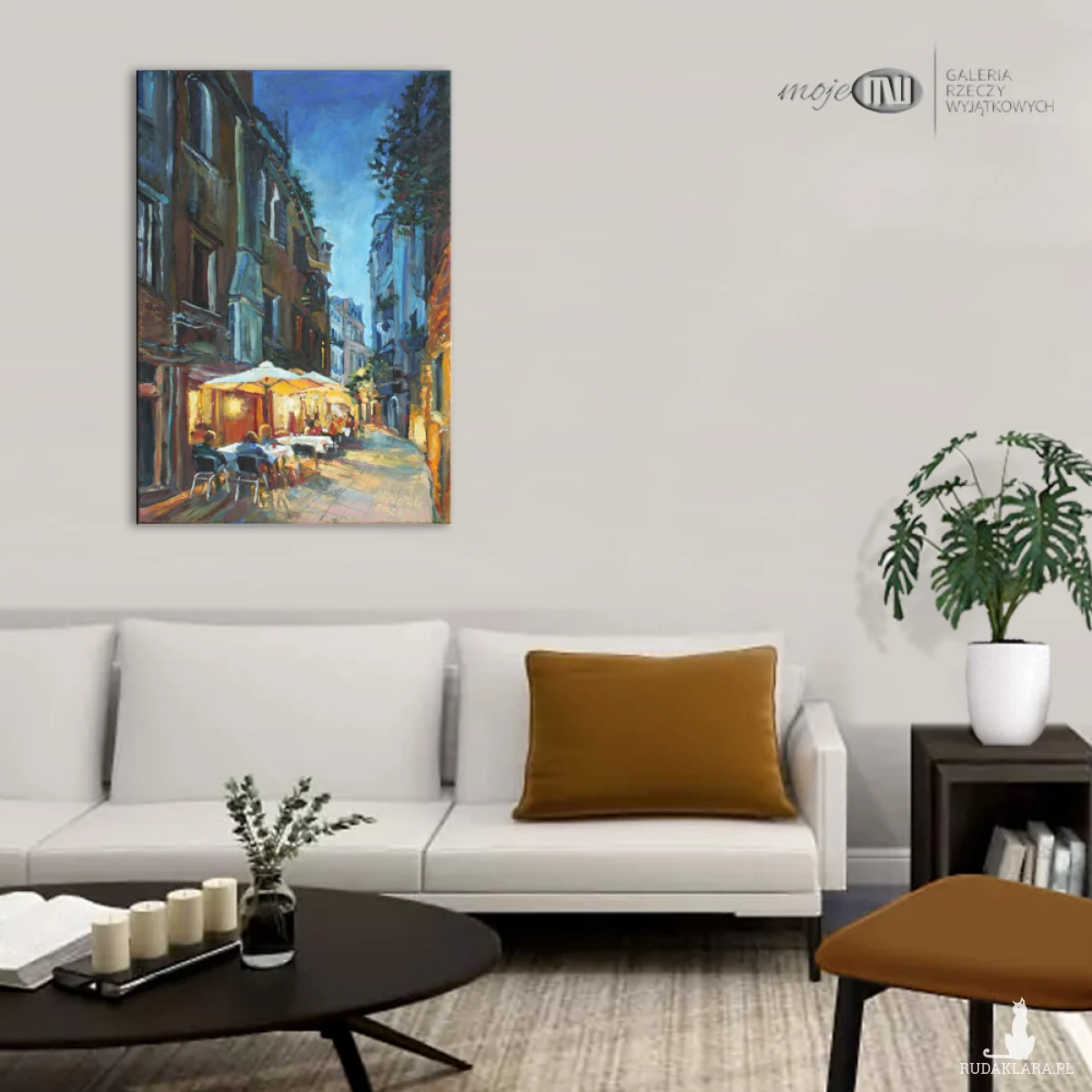 Obraz olejny malowany na płótnie, utrzymany w zawężonej palecie barw z wyraźnym kontrastem niebieskiego z żółcią i odcieniami pomarańczu. Będzie stanowił zdecydowany kolorystyczny i dekoracyjny akcent we wnętrzu.
