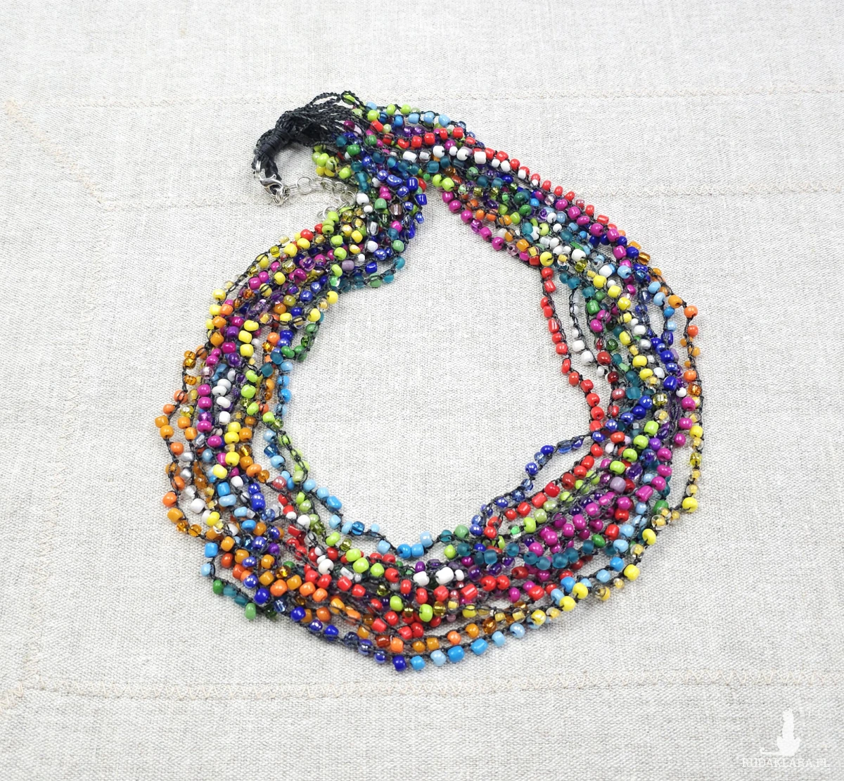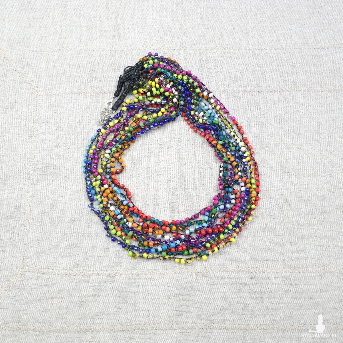 Ręcznie wykonany naszyjnik kaskadowy stworzony techniką szydełkową. Składa się z 10 splecionych sznurów drobnych, wielokolorowych koralików szklanych.