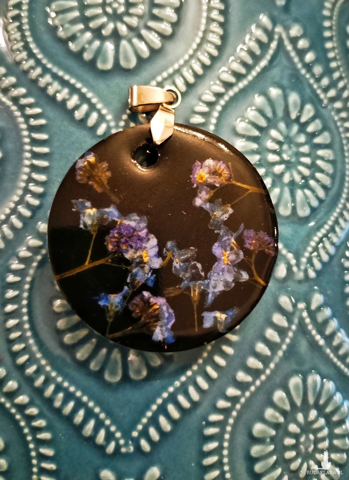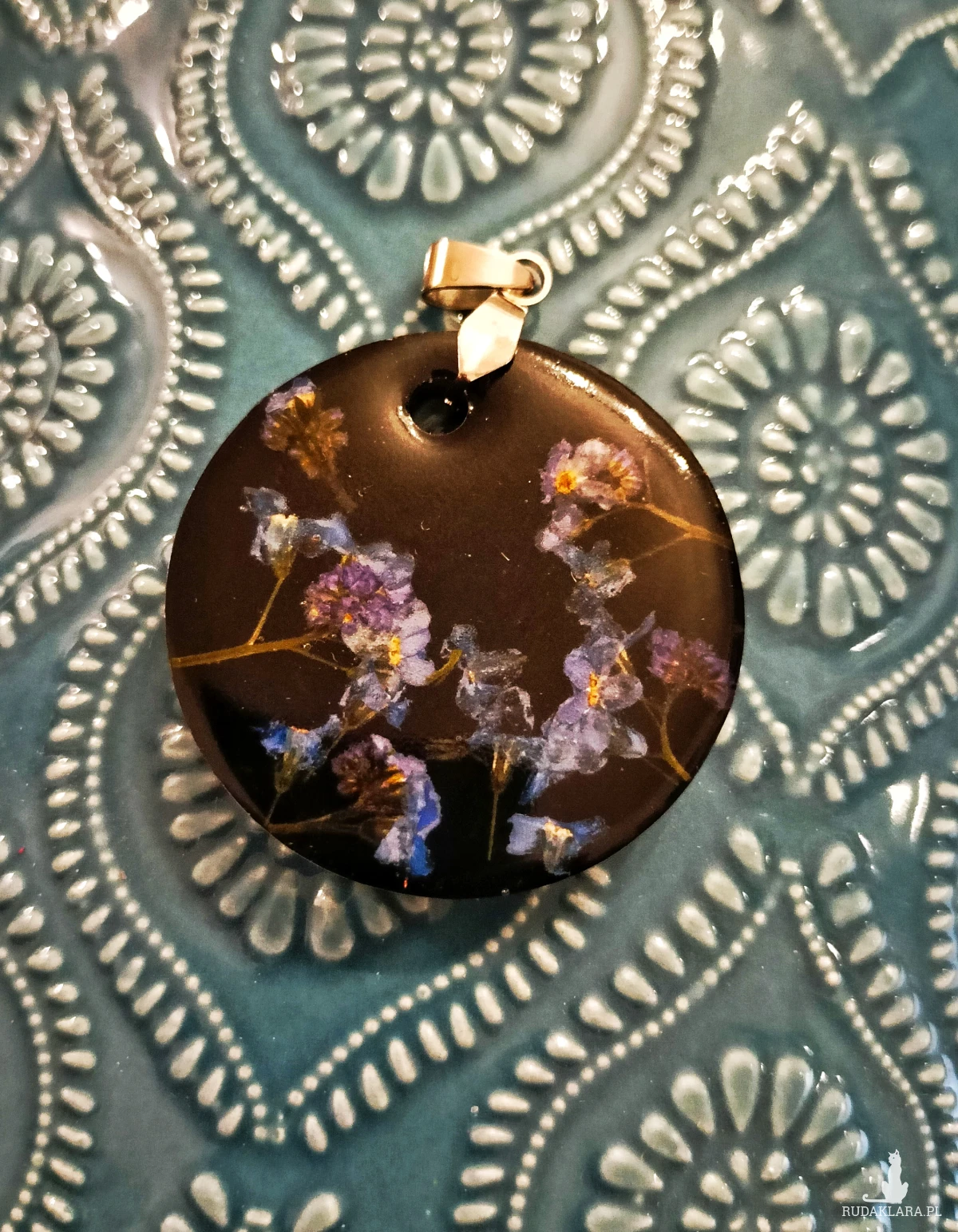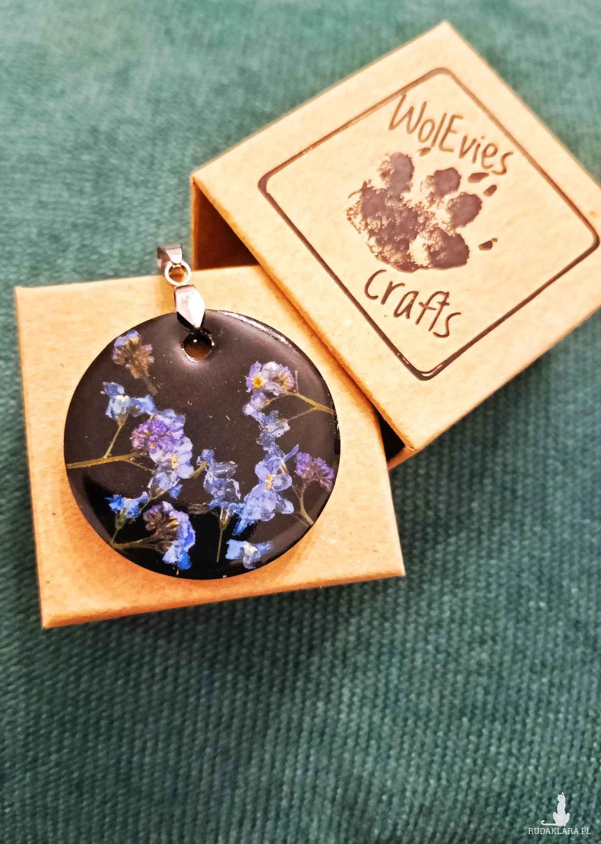 wisiorek z żywicy handmade, wisiorek z niezapominajkami, biżuteria z prawdziwymi kwiatami, zawieszka z żywicy UV, naszyjnik z kwiatami, biżuteria naturalna handmade, prezent dla kobiety, czarna biżuteria z żywicy, biżuteria z suszonymi kwiatami