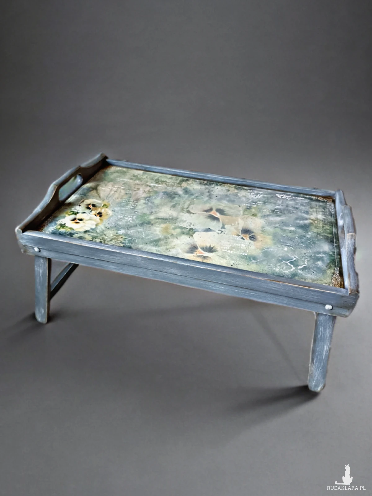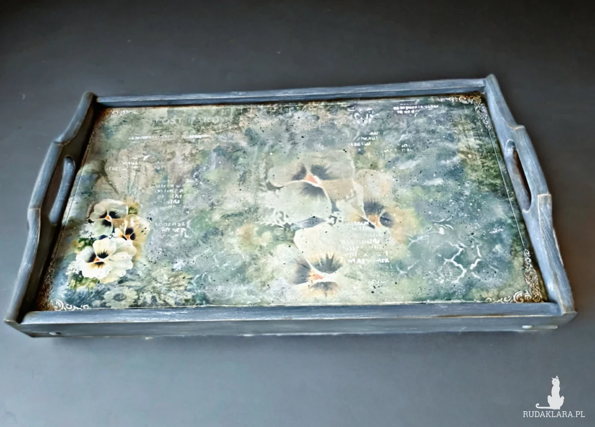 Taca na nóżkach, zdobiona metodą decoupage.
