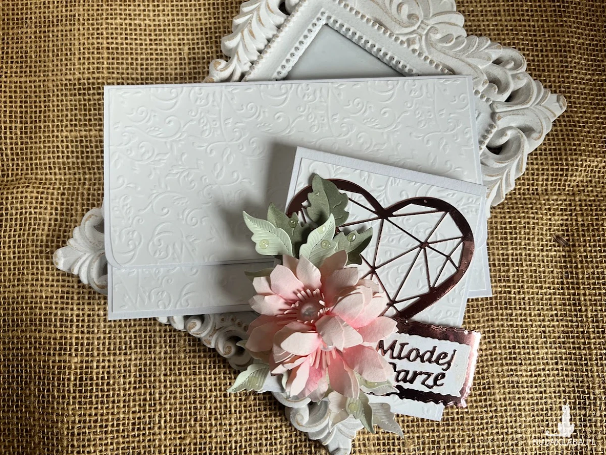 Elegancka kartka ślubna w formie kopertówki.W kolorystyce cynkowej bieli z dodatkiem lustrzanego różowego złota, Wykonana w całości ręcznie, dbałością o szczegóły. Ozdobiona za pomocą perłowego tłoczonego papieru do scrapbookingu, pięknej kompozycji kwiatowej oraz geometrycznego serca i napisu .Wielkość kartki to 18 x 10,5 .Dzięki swojej formie, kartka ta pozwala w elegancki sposób przekazać zarówno życzenia, jak i prezent w postaci gotówki. W środku znajduje się ozdobna wkładka na życzenia. W tej postaci kartka dostępna od ręki.Polecam