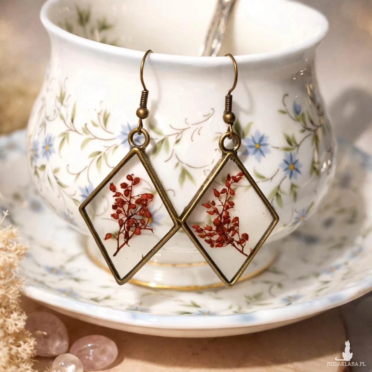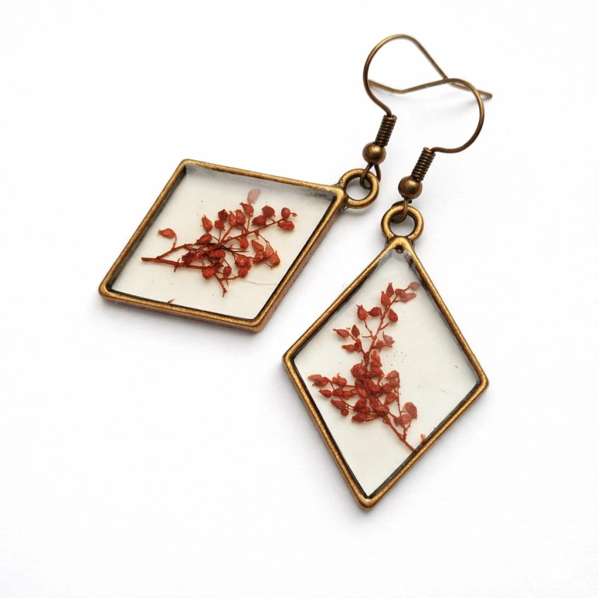 Unikatowe kolczyki handmade wykonane z wysokiej jakości żywicy epoksydowej, w której zatopione zostały naturalne czerwone kwiaty szczawiu. Transparentne tło pięknie podkreśla detale roślin, a geometryczny kształt rombów nadaje całości elegancki i nowoczesny wygląd.