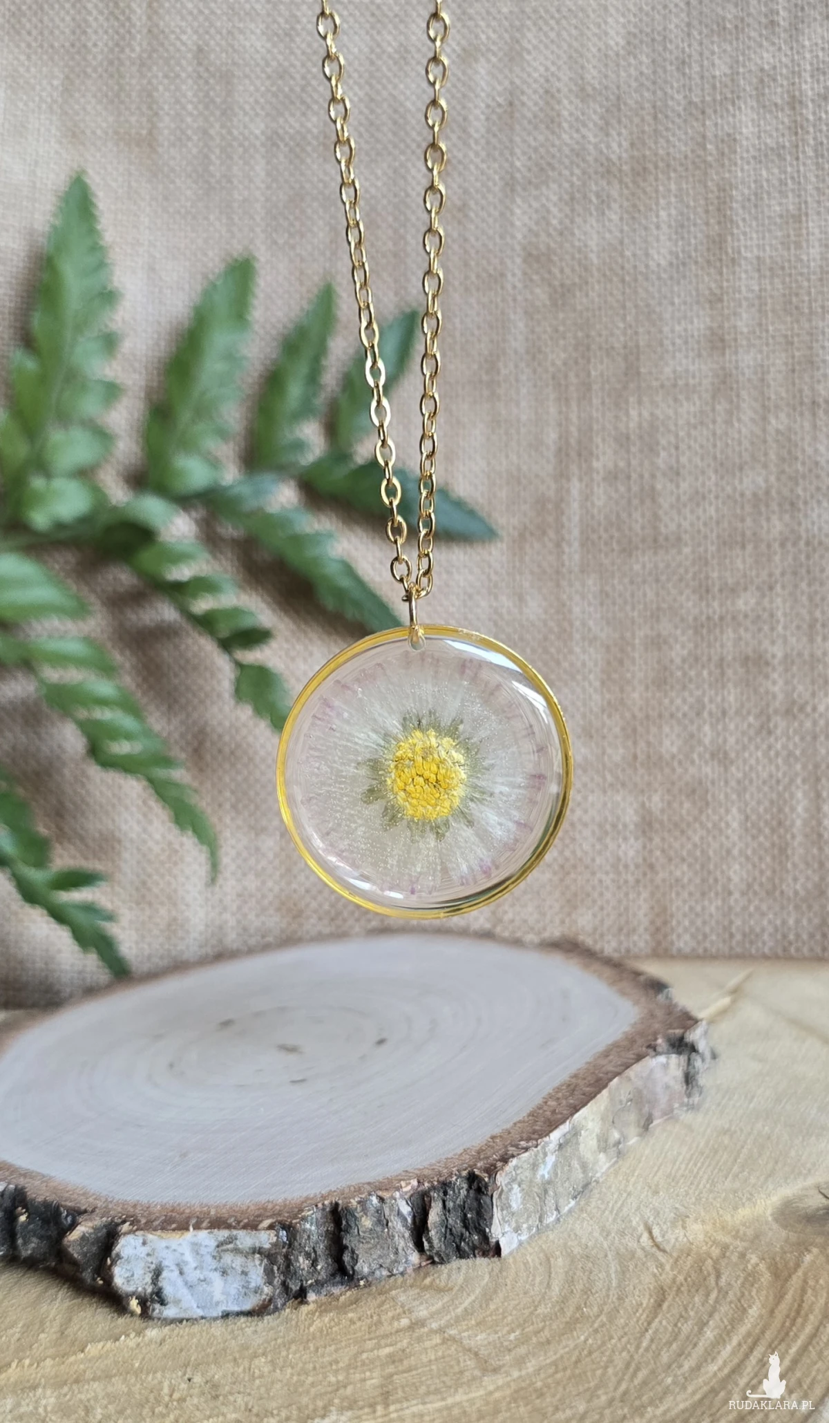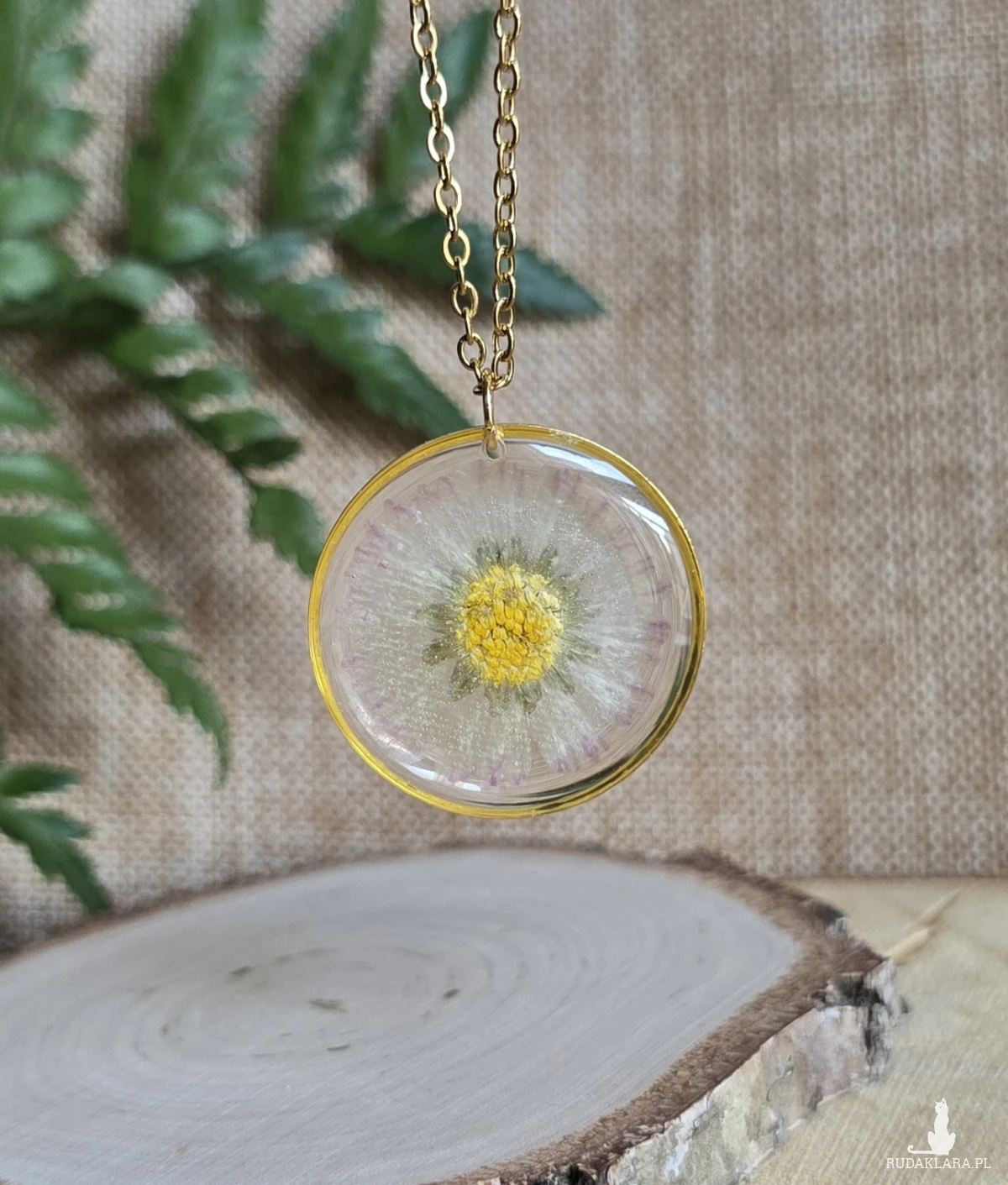 Oferuję Państwu unikalną biżuterię. Zawieszka jest wykonana z suszonych kwiatów i żywicy epoksydowej. Biżuteria jest wspaniałym i oryginalnym prezentem na lata.