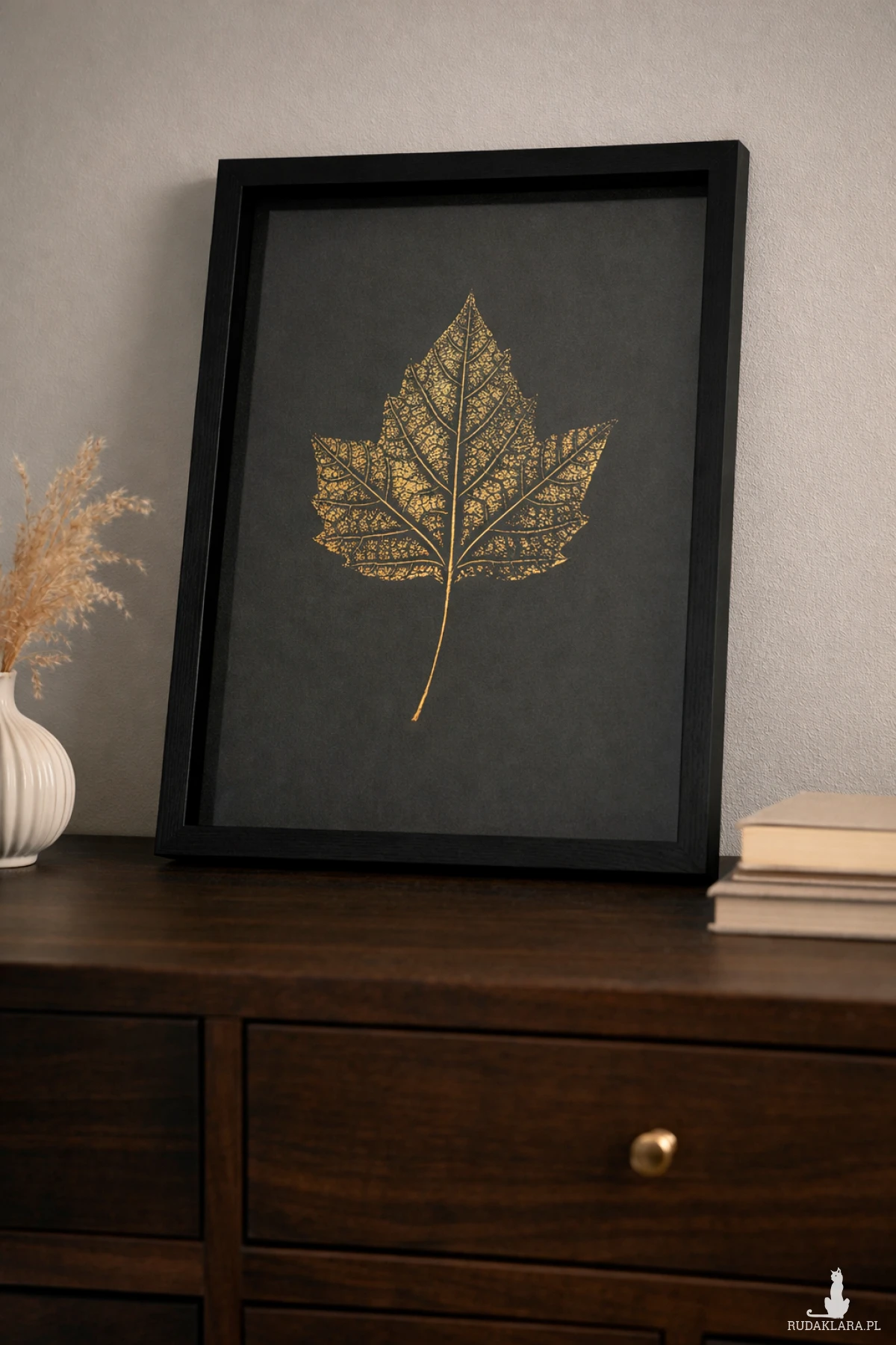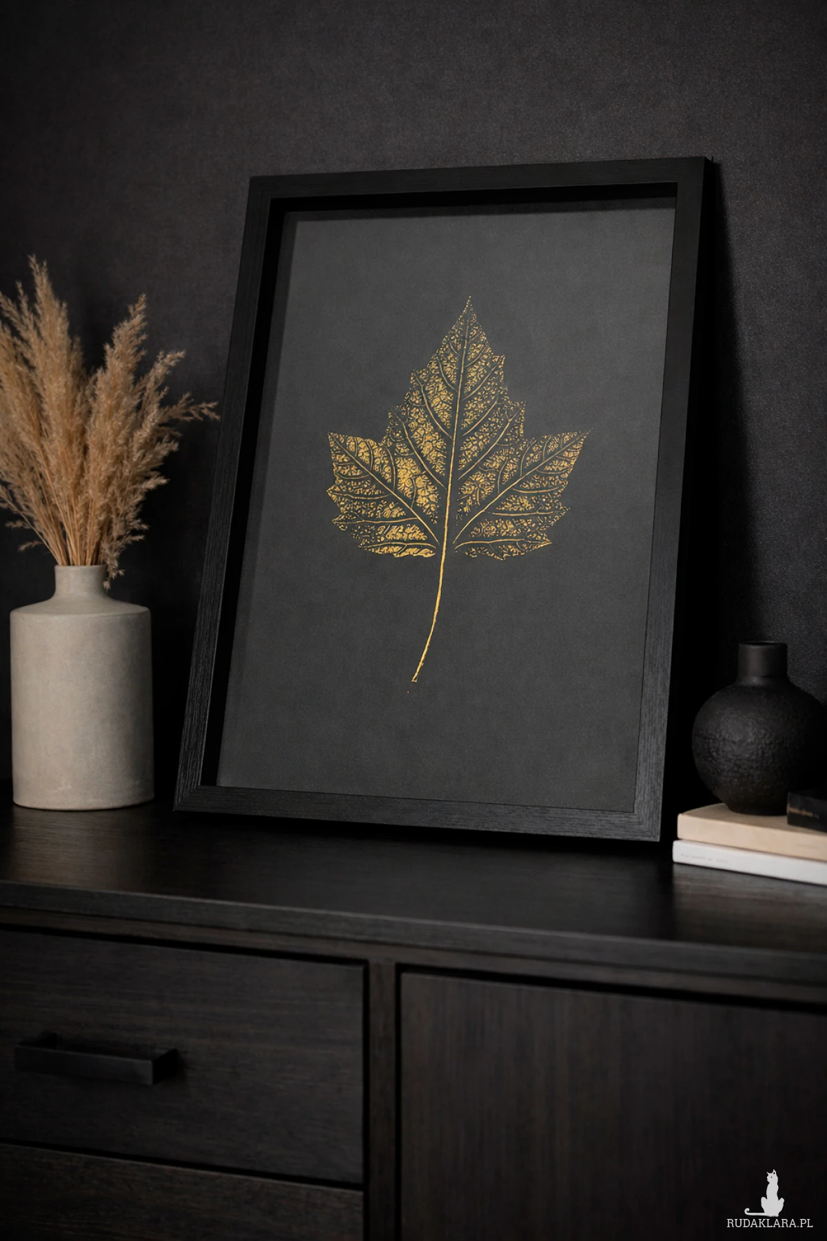 Złoty akcent na czarnym tle dodaje wnętrzu głębi, klasy i subtelnego luksusu, przyciągając wzrok, ale nie dominując przestrzeni.