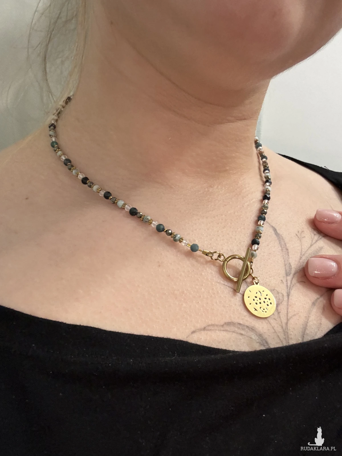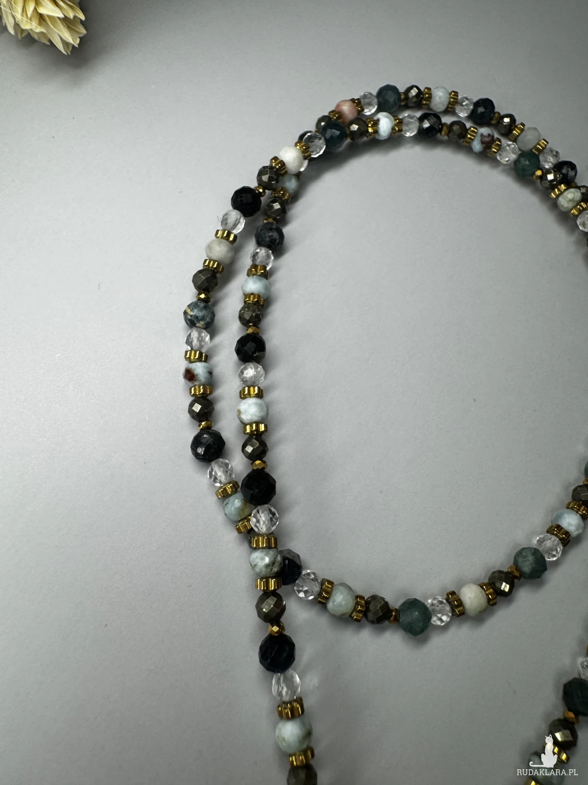 Elegancki, harmonijny naszyjnik, w całości zrobiony z małych, 2-4 milimetrowych kamyczków larimaru, pirytu i kryształu górskiego, które inspirują do pozytywnych zmian i pracy nad rozwojem osobistym oraz turmalinu niebieskiego, który przyciąga sukces i dobrobyt, a pomaga pokonywać problemy.
